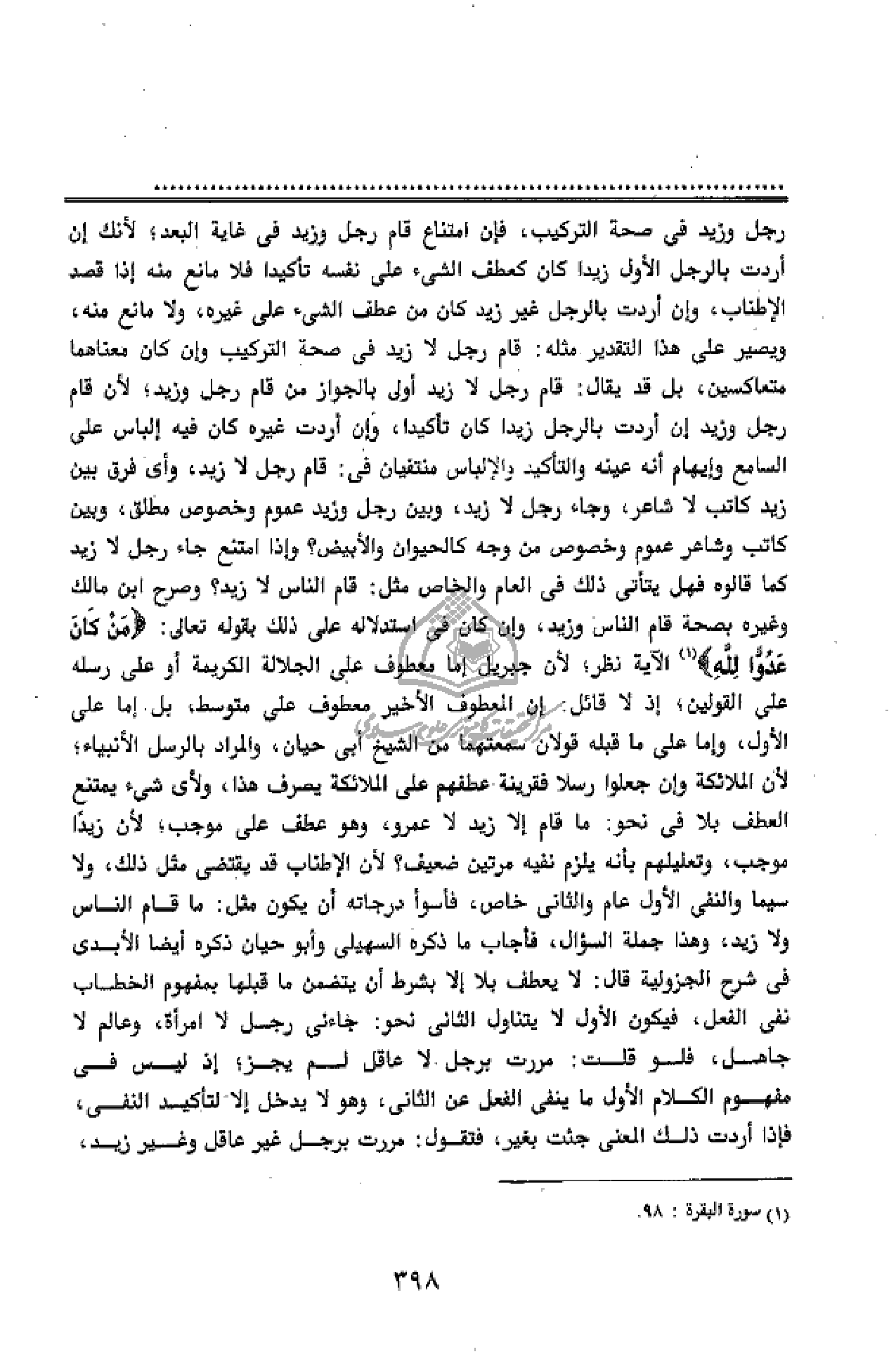 رجل وزيد فى صحة التركيب، فإن امتناع قام رجل وزيد فى غاية البعد؛ لأنك إن أردت بالرجل الأول زيدا كان كعطف الشئ على نفسه تأكيدا فلا مانع منه إذا قصد الإطناب، وإن أردت بالرجل غير زيد كان من عطف الشئ على غيره، ولا مانع منه، ويصير على هذا التقدير مثله: قام رجل لا زيد فى صحة التركيب وإن كان معناهما متعاكسين، بل قد يقال: قام رجل لا زيد أولى بالجواز من قام رجل وزيد؛ لأن قام رجل وزيد إن أردت بالرجل زيدا كان تأكيدا، وإن أردت غيره كان فيه إلباس على السامع وإيهام أنه عينه والتأكيد والإلباس منتفيان فى: قام رجل لا زيد، وأى فرق بين زيد كاتب لا شاعر، وجاء رجل لا زيد، وبين رجل وزيد عموم وخصوص مطلق، وبين كاتب وشاعر عموم وخصوص من وجه كالحيوان والأبيض؟ وإذا امتنع جاء رجل لا زيد كما قالوه فهل يتأتى ذلك فى العام والخاص مثل: قام الناس لا زيد؟ وصرح ابن مالك وغيره بصحة قام الناس وزيد، وإن كان فى استدلاله على ذلك بقوله تعالى: مَنْ كانَ عَدُوًّا لِلَّهِ (¬1) الآية نظر؛ لأن جبريل إما معطوف على الجلالة الكريمة أو على رسله على القولين؛ إذ لا قائل: إن المعطوف الأخير معطوف على متوسط، بل إما على الأول، وإما على ما قبله