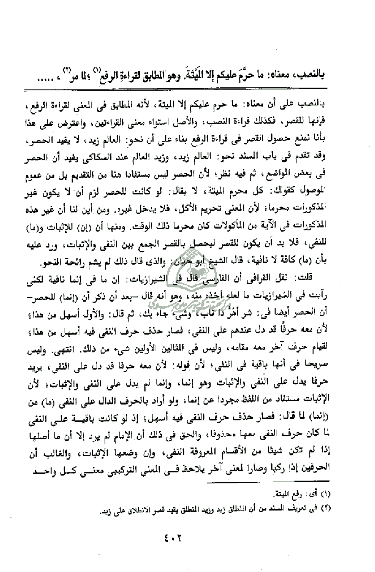 بالنصب على أن معناه: ما حرم عليكم إلا الميتة، لأنه المطابق فى المعنى لقراءة الرفع، فإنها للقصر، فكذلك قراءة النصب، والأصل استواء معنى القراءتين، واعترض على هذا بأنا نمنع حصول القصر فى قراءة الرفع بناء على أن نحو: العالم زيد، لا يفيد الحصر، وقد تقدم فى باب المسند نحو: العالم زيد، وزيد العالم عند السكاكى يفيد أن الحصر فى بعض المواضع، ثم فيه نظر؛ لأن الحصر ليس مستفادا هنا من التقديم بل من عموم الموصول كقولك: كل محرم الميتة، لا يقال: لو كانت للحصر لزم أن لا يكون غير المذكورات محرما؛ لأن المعنى تحريم الأكل، فلا يدخل غيره. ومن أين لنا أن غير هذه المذكورات فى الآية من المأكولات كان محرما ذلك الوقت. ومنها أن (إن) للإثبات و (ما) للنفى، فلا بد أن يكون للقصر ليحصل بالقصر الجمع بين النفى والإثبات، ورد عليه بأن (ما) كافة لا نافية، قال الشيخ أبو حيان: والذى قال ذلك لم يشم رائحة النحو.
