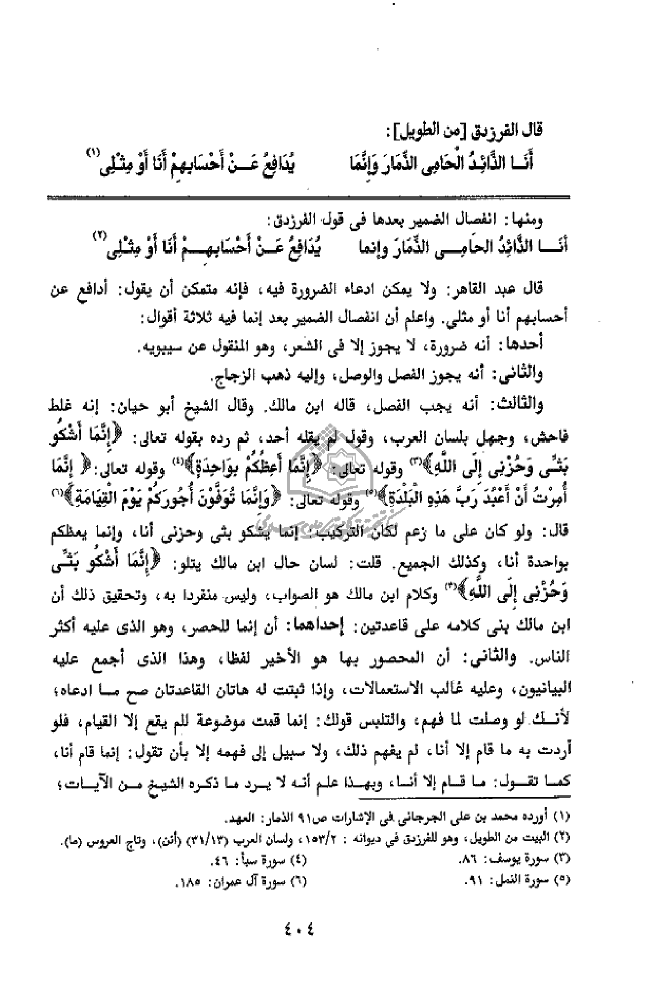 قال عبد القاهر: ولا يمكن ادعاء الضرورة فيه، فإنه متمكن أن يقول: أدافع عن أحسابهم أنا أو مثلى. وأعلم أن انفصال الضمير بعد إنما فيه ثلاثة أقوال: