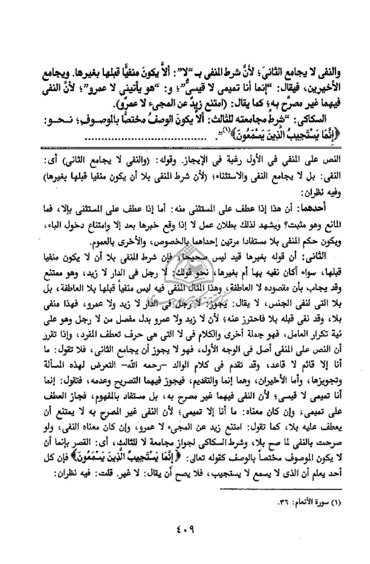 النفى: بل لا يجامع النفى والاستثناء؛ (لأن شرط المنفى بلا أن يكون منفيا قبلها بغيرها) وفيه نظران: