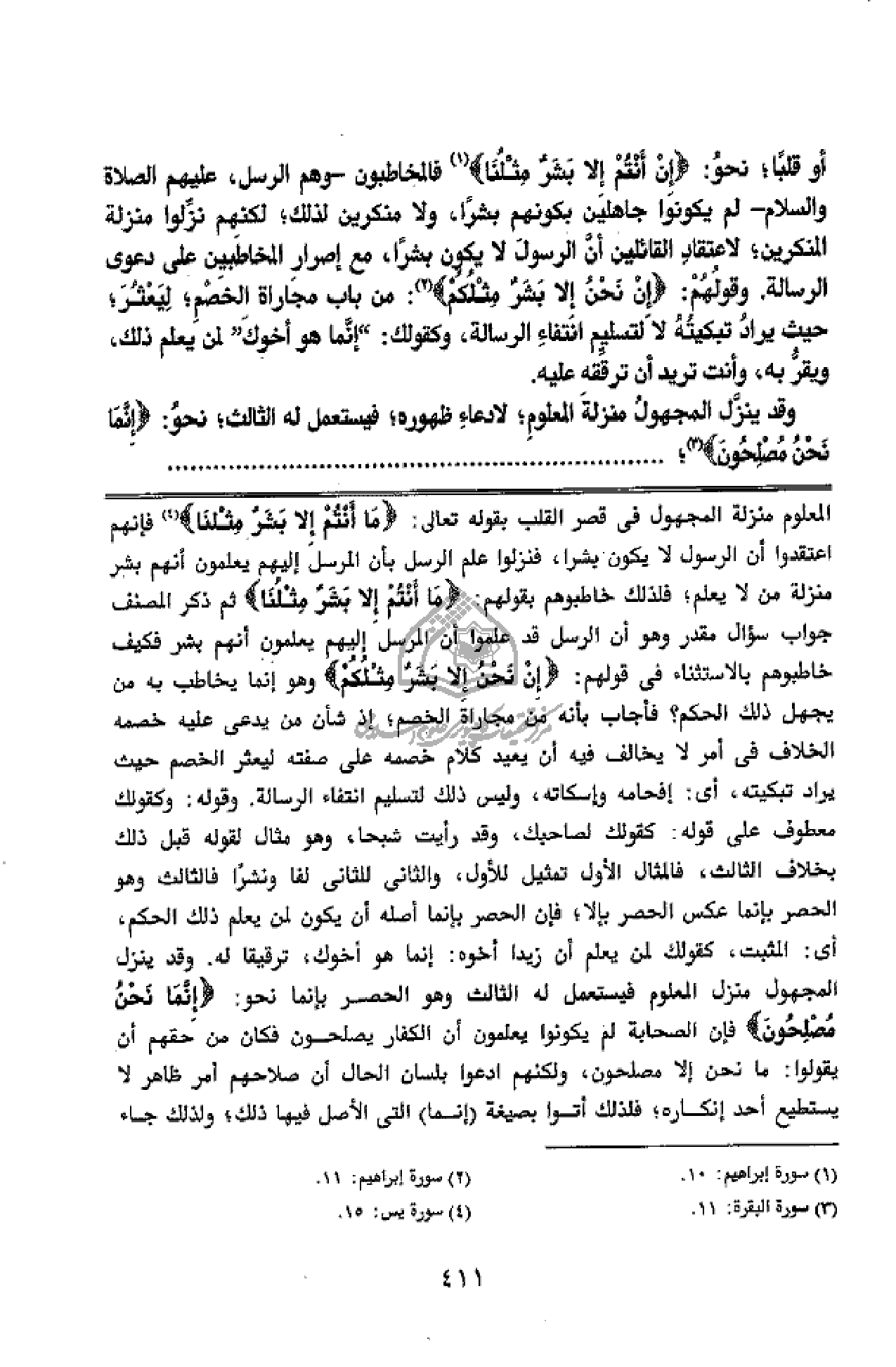 إصرار المخاطبين على دعوى الرسالة. وقولهم: إِنْ نَحْنُ إِلَّا بَشَرٌ مِثْلُكُمْ (¬2): من باب مجاراة الخصم؛ ليعثر؛ حيث يراد تبكيته لا لتسليم انتفاء الرسالة، وكقولك: إنّما هو أخوك لمن يعلم ذلك، ويقرّ به، وأنت تريد أن ترققه عليه.
