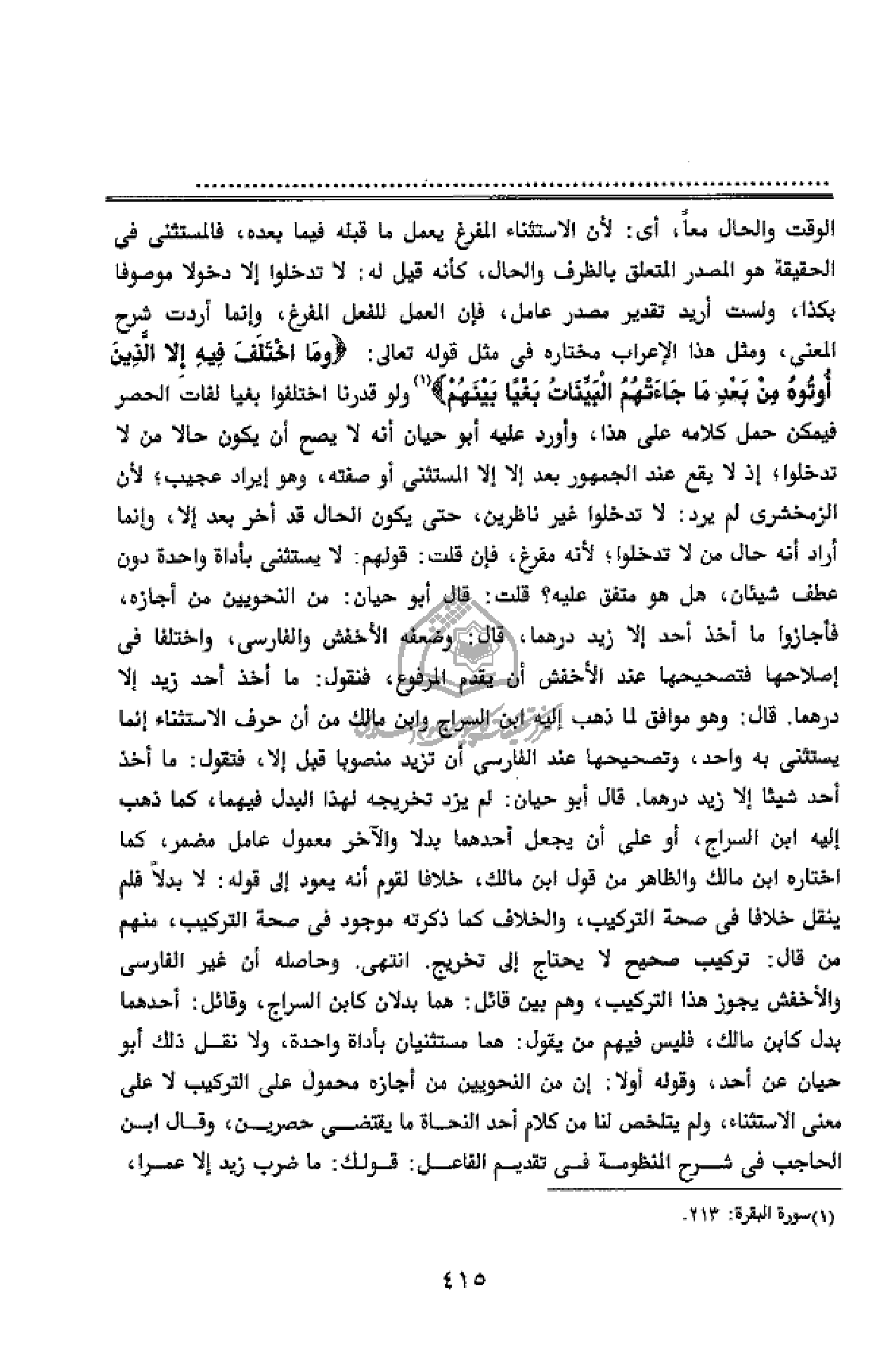 الوقت والحال معا، أى: لأن الاستثناء المفرغ يعمل ما قبله فيما بعده، فالمستثنى فى الحقيقة هو المصدر المتعلق بالظرف والحال، كأنه قيل له: لا تدخلوا إلا دخولا موصوفا بكذا، ولست أريد تقدير مصدر عامل، فإن العمل للفعل المفرغ، وإنما أردت شرح المعنى، ومثل هذا الإعراب مختاره فى مثل قوله تعالى: وَمَا اخْتَلَفَ فِيهِ إِلَّا الَّذِينَ أُوتُوهُ مِنْ بَعْدِ ما جاءَتْهُمُ الْبَيِّناتُ بَغْياً بَيْنَهُمْ (¬1) ولو قدرنا اختلفوا بغيا لفات الحصر فيمكن حمل كلامه على هذا، وأورد عليه أبو حيان أنه لا يصح أن يكون حالا من لا تدخلوا؛ إذ لا يقع عند الجمهور بعد إلا إلا المستثنى أو صفته، وهو إيراد عجيب؛ لأن الزمخشرى لم يرد: لا تدخلوا غير ناظرين، حتى يكون الحال قد أخر بعد إلا، وإنما أراد أنه حال من لا