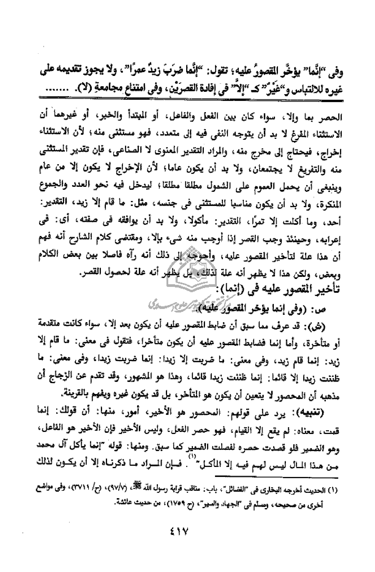 وفى إنّما يؤخّر المقصور عليه؛ تقول: إنّما ضرب زيد عمرا خ خ، ولا يجوز تقديمه على غيره للالتباس وغير ك إلّا فى إفادة القصرين، وفى امتناع مجامعة (لا).