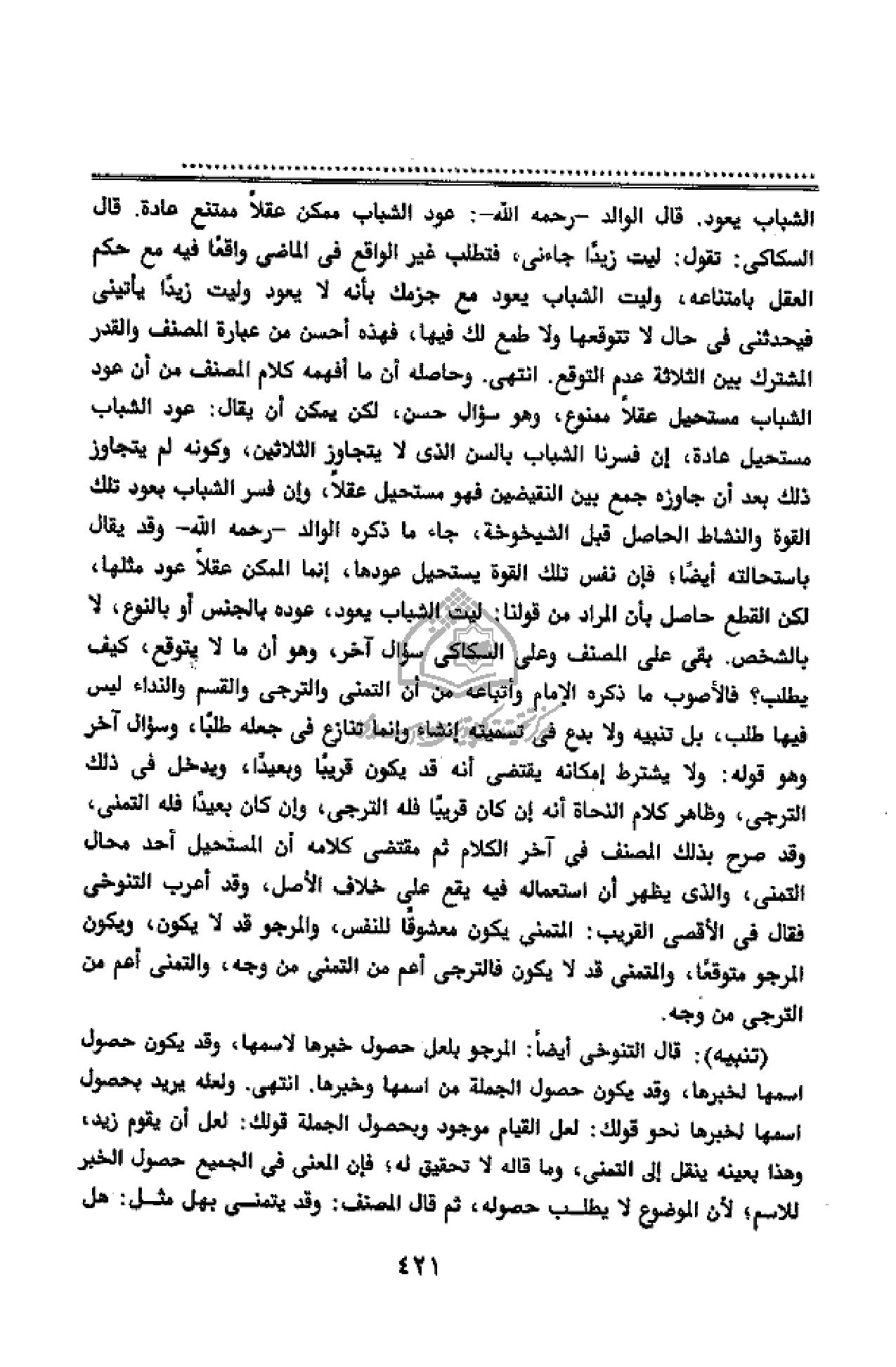 الشباب يعود. قال الوالد - رحمه الله -: عود الشباب ممكن عقلا ممتنع عادة. قال السكاكى: تقول: ليت زيدا جاءنى، فتطلب غير الواقع فى الماضى واقعا فيه مع حكم العقل بامتناعه، وليت الشباب يعود مع جزمك بأنه لا يعود وليت زيدا يأتينى فيحدثنى فى حال لا تتوقعها ولا طمع لك فيها، فهذه أحسن من عبارة المصنف والقدر المشترك بين الثلاثة عدم التوقع. انتهى. وحاصله أن ما أفهمه كلام المصنف من أن عود الشباب مستحيل عقلا ممنوع، وهو سؤال حسن، لكن يمكن أن يقال: عود الشباب مستحيل عادة، إن فسرنا الشباب بالسن الذى لا يتجاوز الثلاثين، وكونه لم يتجاوز ذلك بعد أن جاوزه جمع بين النقيضين فهو مستحيل عقلا، وإن فسر الشباب بعود تلك القوة والنشاط الحاصل قبل الشيخوخة، جاء ما ذكره الوالد - رحمه الله - وقد يقال باستحالته أيضا؛ فإن نفس تلك القوة يستحيل عودها، إنما الممكن عقلا عود مثلها، لكن القطع حاصل بأن المراد من قولنا: ليت الشباب يعود، عوده بالجنس أو بالنوع، لا بالشخص. بقى على المصنف وعلى السكاكى سؤال آخر، وهو أن ما لا يتوقع، كيف يطلب؟ فالأصوب ما ذكره الإمام وأتباعه من أن التمنى والترجى والقسم والنداء ليس فيها طلب، بل تنبيه ولا بدع فى