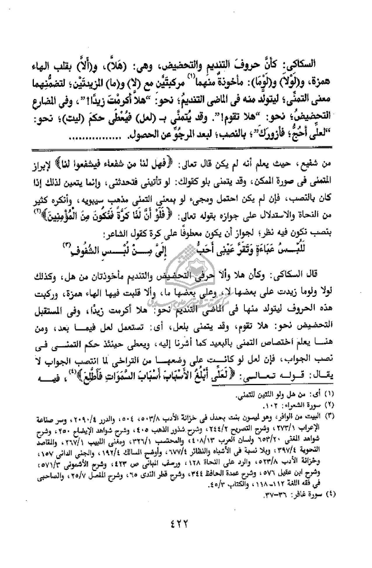قال السكاكى: وكأن هلا وألا حرفى التحضيض والتنديم مأخوذتان من هل، وكذلك لولا ولو ما زيدت على بعضها لا، وعلى بعضها ما، وألا قلبت فيها الهاء همزة، وركبت هذه الحروف ليتولد منها فى الماضى التنديم نحو: هلا أكرمت زيدا، وفى المستقبل التحضيض نحو: هلا تقوم، وقد يتمنى بلعل، أى: تستعمل لعل فيما بعد، ومن هنا يعلم اختصاص التمنى بالبعيد كما أشرنا إليه، ويعطى حينئذ حكم التمنى فى نصب الجواب، فإن لعل لو كانت على وضعها من التراخى لما انتصب الجواب لا يقال: قوله تعالى: لَعَلِّي أَبْلُغُ الْأَسْبابَ أَسْبابَ السَّماواتِ فَأَطَّلِعَ (¬4)، فيه