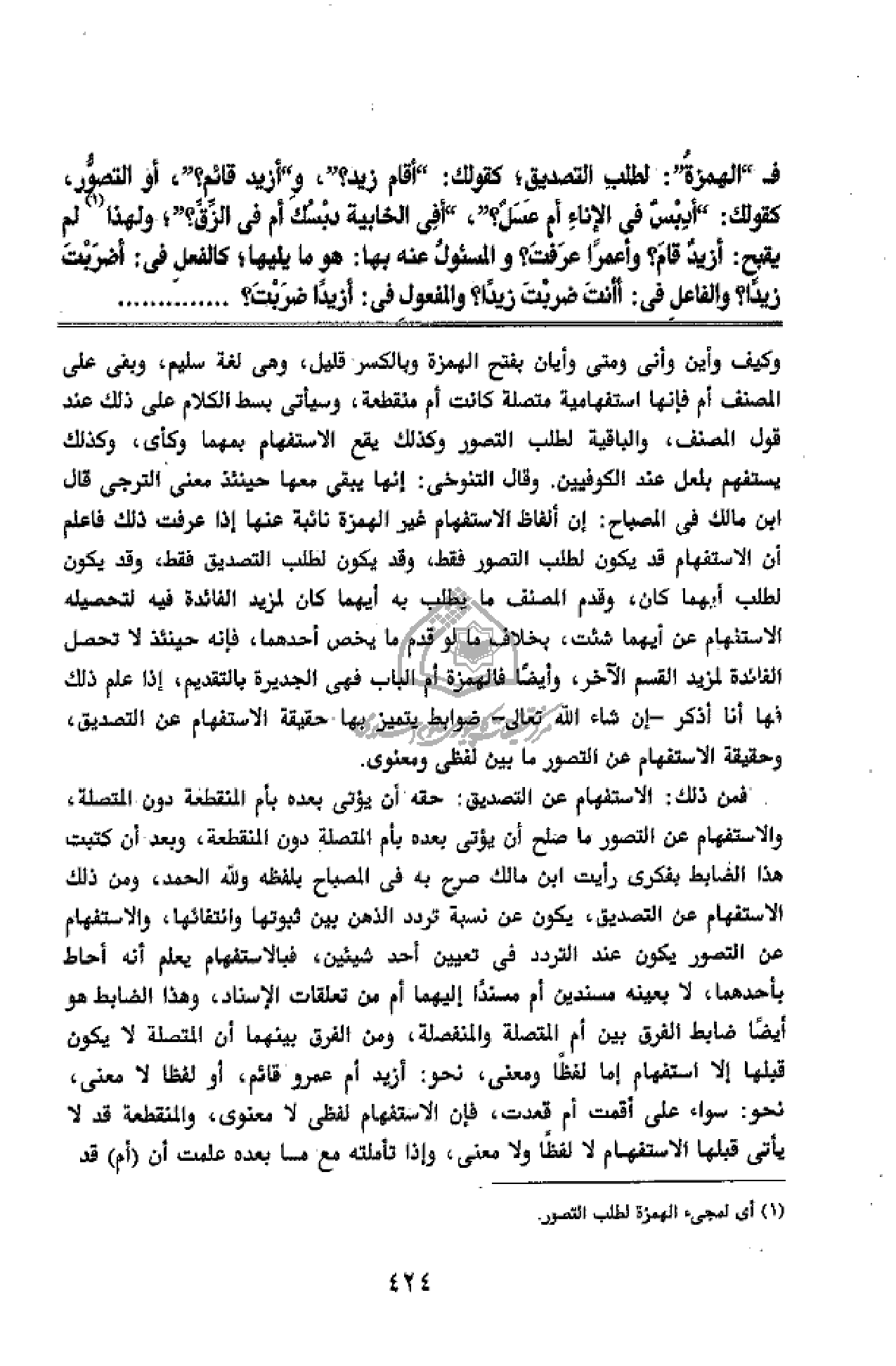 المصباح بلفظه ولله الحمد، ومن ذلك الاستفهام عن التصديق، يكون عن نسبة تردد الذهن بين ثبوتها وانتفائها، والاستفهام عن التصور يكون عند التردد فى تعيين أحد شيئين، فبالاستفهام يعلم أنه أحاط بأحدهما، لا بعينه مسندين أم مسندا إليهما أم من تعلقات الإسناد، وهذا الضابط هو أيضا ضابط الفرق بين أم المتصلة والمنفصلة، ومن الفرق بينهما أن المتصلة لا يكون قبلها إلا استفهام إما لفظا ومعنى، نحو: أزيد أم عمرو قائم، أو لفظا لا معنى، نحو: سواء على أقمت أم قعدت، فإن الاستفهام لفظى لا معنوى، والمنقطعة قد لا يأتى قبلها الاستفهام لا لفظا ولا معنى، وإذا تأملته مع ما بعده علمت أن (أم) قد