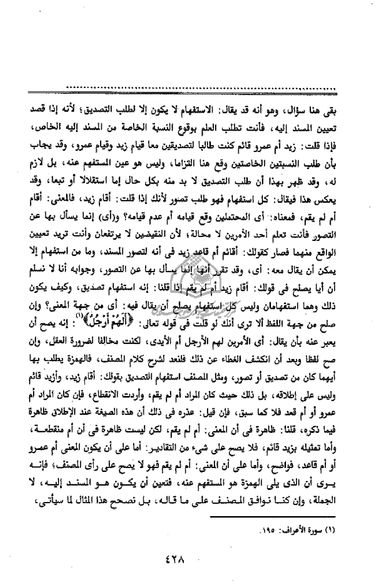 بقى هنا سؤال، وهو أنه قد يقال: الاستفهام لا يكون إلا لطلب التصديق؛ لأنه إذا قصد تعيين المسند إليه، فأنت تطلب العلم بوقوع النسبة الخاصة من المسند إليه الخاص، فإذا قلت: زيد أم عمرو قائم كنت طالبا لتصديقين معا قيام زيد وقيام عمرو، وقد يجاب بأن طلب النسبتين الخاصتين وقع هنا التزاما، وليس هو عين المستفهم عنه، بل لازم له، وقد ظهر بهذا أن طلب التصديق لا بد منه بكل حال إما استقلالا أو تبعا، وقد يعكس هذا فيقال: كل استفهام فهو طلب تصور لأنك إذا قلت: أقام زيد، فالمعنى: أقام أم لم يقم، فمعناه: أى المحتملين وقع قيامه أم عدم قيامه؟ و (أى) إنما يسأل بها عن التصور فأنت تعلم أحد الأمرين لا محالة؛ لأن النقيضين لا يرتفعان وأنت تريد تعيين الواقع منهما فصار كقولك: أقائم أم قاعد زيد فى أنه لتصور المسند، وما من استفهام إلا يمكن أن يقال معه: أى، وقد تقرر أنها إنما يسأل بها عن التصور، وجوابه أنا لا نسلم أن أيا يصلح فى قولك: أقام زيد أم لم يقم إذا قلنا: إنه استفهام تصديق، وكيف يكون ذلك وهما استفهامان وليس كل استفهام يصلح أن يقال فيه: أى من جهة المعنى؟ وإن صلح من جهة اللفظ ألا ترى أنك لو قلت فى قوله تعالى: أَلَهُمْ أَرْجُلٌ (¬1): إنه يصح أن يعبر عنه بأن يقال: أى الأمرين لهم الأرجل أم الأيدى، لكنت مخالفا لضرورة العقل، وإن صح لفظا وبعد أن انكشف الغطاء عن ذلك فلنعد لشرح كلام المصنف، فالهمزة يطلب بها أيهما كان من تصديق أو تصور، ومثل المصنف استفهام التصديق بقولك: أقام زيد، وأزيد قائم وليس على إطلاقه، بل ذلك حيث كان المراد أم لم يقم، وأردت الانقطاع، فإن كان المراد أم عمرو أو أم قعد فلا كما سبق، فإن قيل: عذره فى ذلك أن هذه الصيغة عند الإطلاق ظاهرة فيما ذكره، قلنا: ظاهرة فى أن المعنى: أم لم يقم، لكن ليست ظاهرة فى أن أم منقطعة، وأما تمثيله بزيد قائم، فلا يصح على شئ من التقادير: أما على أن يكون المعنى أم عمرو أو أم قاعد، فواضح، وأما على أن المعنى: أم لم يقم فهو لا يصح على رأى المصنف؛ فإنه يرى أن الذى يلى الهمزة هو المستفهم عنه، فتعين أن يكون هو المسند إليه، لا الجملة، وإن كنا نوافق المصنف على ما قاله، بل نصحح هذا المثال لما سيأتى،