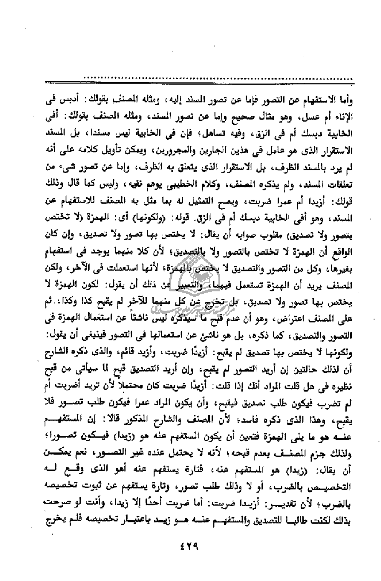 ولكونها لا يختص بها تصديق لم يقبح: أزيدا ضربت، وأزيد قائم، والذى ذكره الشارح أن لذلك حالتين إن أريد التصور لم يقبح، وإن أريد التصديق قبح لما سيأتى من قبح نظيره فى هل قلت المراد أنك إذا قلت: أزيدا ضربت كان محتملا لأن تريد أضربت أم لم تضرب فيكون طلب تصديق فيقبح، وأن يكون المراد عمرا فيكون طلب تصور فلا يقبح، وهذا الذى ذكره فاسد؛ لأن المصنف والشارح المذكور قالا: إن المستفهم عنه هو ما يلى الهمزة فتعين أن يكون المستفهم عنه هو (زيدا) فيكون تصورا؛ ولذلك جزم المصنف بعدم قبحه؛ لأنه لا يحتمل عنده غير التصور، نعم يمكن أن يقال: (زيدا) هو المستفهم عنه، فتارة يستفهم عنه أهو الذى وقع له التخصيص بالضرب، أو لا وذلك طلب تصور، وتارة يستفهم عن ثبوت تخصيصه بالضرب؛ لأن تقدير: أزيدا ضربت: أما ضربت أحدا إلا زيدا، وأنت لو صرحت بذلك لكنت طالبا للتصديق والمستفهم عنه هو زيد باعتبار تخصيصه فلم يخرج