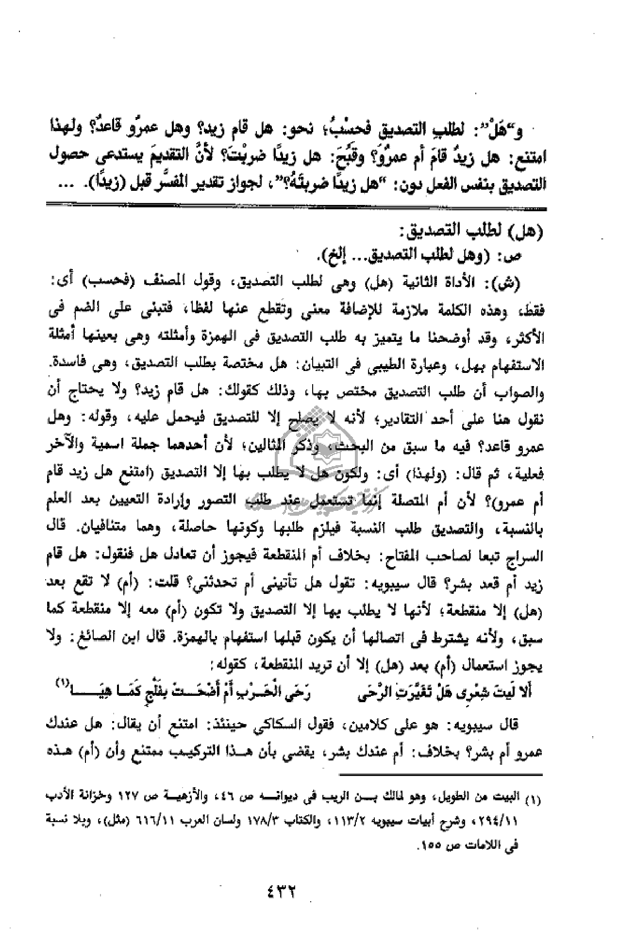 وهل خ خ: لطلب التصديق فحسب؛ نحو: هل قام زيد؟ وهل عمرو قاعد؟ ولهذا امتنع: هل زيد قام أم عمرو؟ وقبح: هل زيدا ضربت؟ لأنّ التقديم يستدعى حصول التصديق بنفس الفعل دون: هل زيدا ضربته؟ خ خ، لجواز تقدير المفسّر قبل (زيدا).