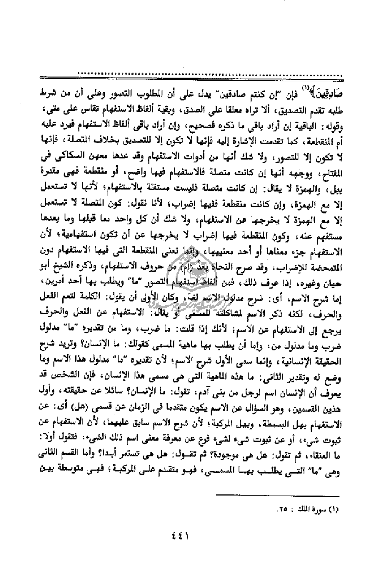 ما العنقاء، ثم تقول: هل هى موجودة؟ ثم تقول: هل هى تستمر أبدا؟ وأما القسم الثانى وهى" ما" التى يطلب بها المسمى، فهو متقدم على المركبة؛ فهى متوسطة بين