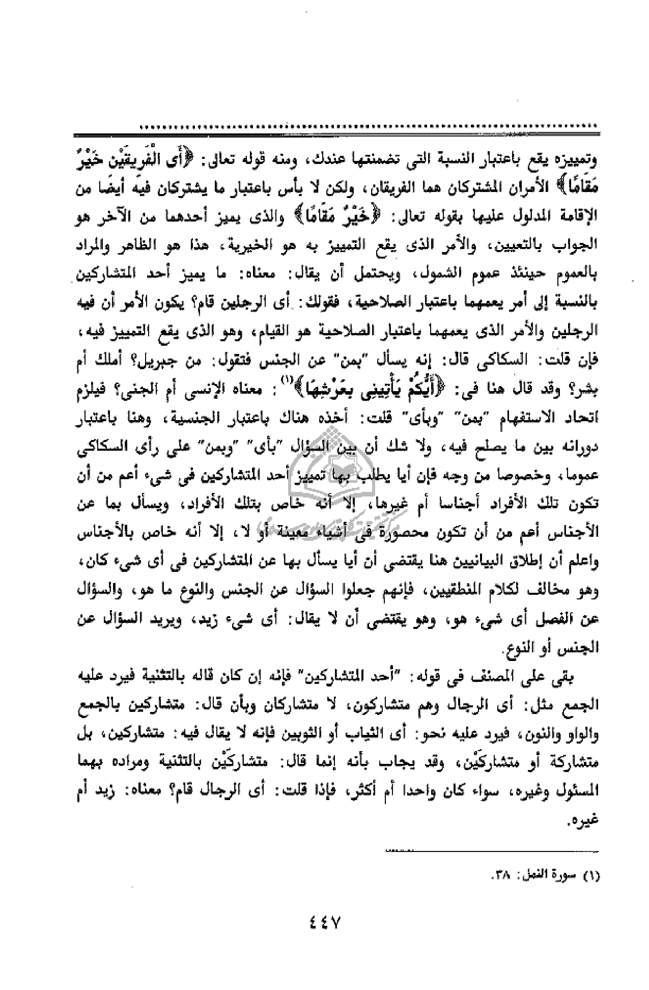 وتمييزه يقع باعتبار النسبة التى تضمنتها عندك، ومنه قوله تعالى: أَيُّ الْفَرِيقَيْنِ خَيْرٌ مَقاماً الأمران المشتركان هما الفريقان، ولكن لا بأس باعتبار ما يشتركان فيه أيضا من الإقامة المدلول عليها بقوله تعالى: خَيْرٌ مَقاماً والذى يميز أحدهما من الآخر هو الجواب بالتعيين، والأمر الذى يقع التمييز به هو الخيرية، هذا هو الظاهر والمراد بالعموم حينئذ عموم الشمول، ويحتمل أن يقال: معناه: ما يميز أحد المتشاركين بالنسبة إلى أمر يعمهما باعتبار الصلاحية، فقولك: أى الرجلين قام؟ يكون الأمر أن فيه الرجلين والأمر الذى يعمهما باعتبار الصلاحية هو القيام، وهو الذى يقع التمييز فيه، فإن قلت: السكاكى قال: إنه يسأل" بمن" عن الجنس فتقول: من جبريل؟ أملك أم بشر؟ وقد قال هنا فى: أَيُّكُمْ يَأْتِينِي بِعَرْشِها (¬1): معناه الإنسى أم الجنى؟ فيلزم اتحاد الاستفهام" بمن"" وبأى" قلت: أخذه هناك باعتبار الجنسية، وهنا باعتبار دورانه بين ما يصلح فيه، ولا شك أن بين السؤال" بأى"" وبمن" على رأى السكاكى عموما، وخصوصا من وجه فإن أيا يطلب بها تمييز أحد المتشاركين فى شئ أعم من أن تكون تلك الأفراد أجناسا أم غيرها، إلا أنه خاص بتلك الأفراد، ويسأل بما عن الأجناس أعم من أن تكون محصورة فى أشياء معينة أو لا، إلا أنه خاص بالأجناس واعلم أن إطلاق البيانيين هنا يقتضى أن أيا يسأل بها عن المتشاركين فى أى شئ كان، وهو مخالف لكلام المنطقيين، فإنهم جعلوا السؤال عن الجنس والنوع ما هو، والسؤال عن الفصل أى شئ هو، وهو يقتضى أن لا يقال: أى شئ زيد، ويريد السؤال عن الجنس أو النوع.