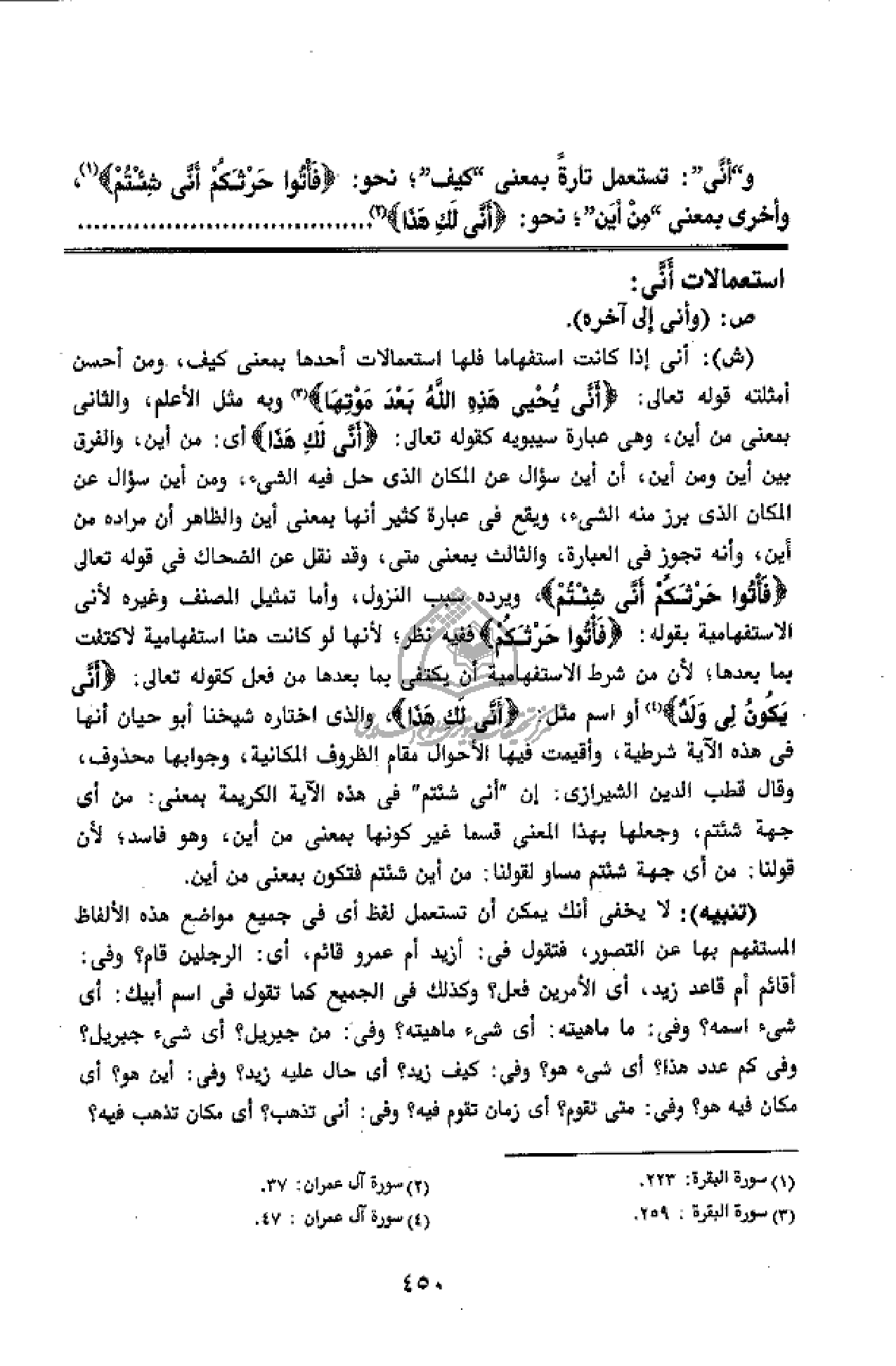 وإنّى خ خ: تستعمل تارة بمعنى كيف خ خ؛ نحو: فَأْتُوا حَرْثَكُمْ أَنَّى شِئْتُمْ (¬1)، وأخرى بمعنى من أين خ خ؛ نحو: أَنَّى لَكِ هذا (¬2) ...