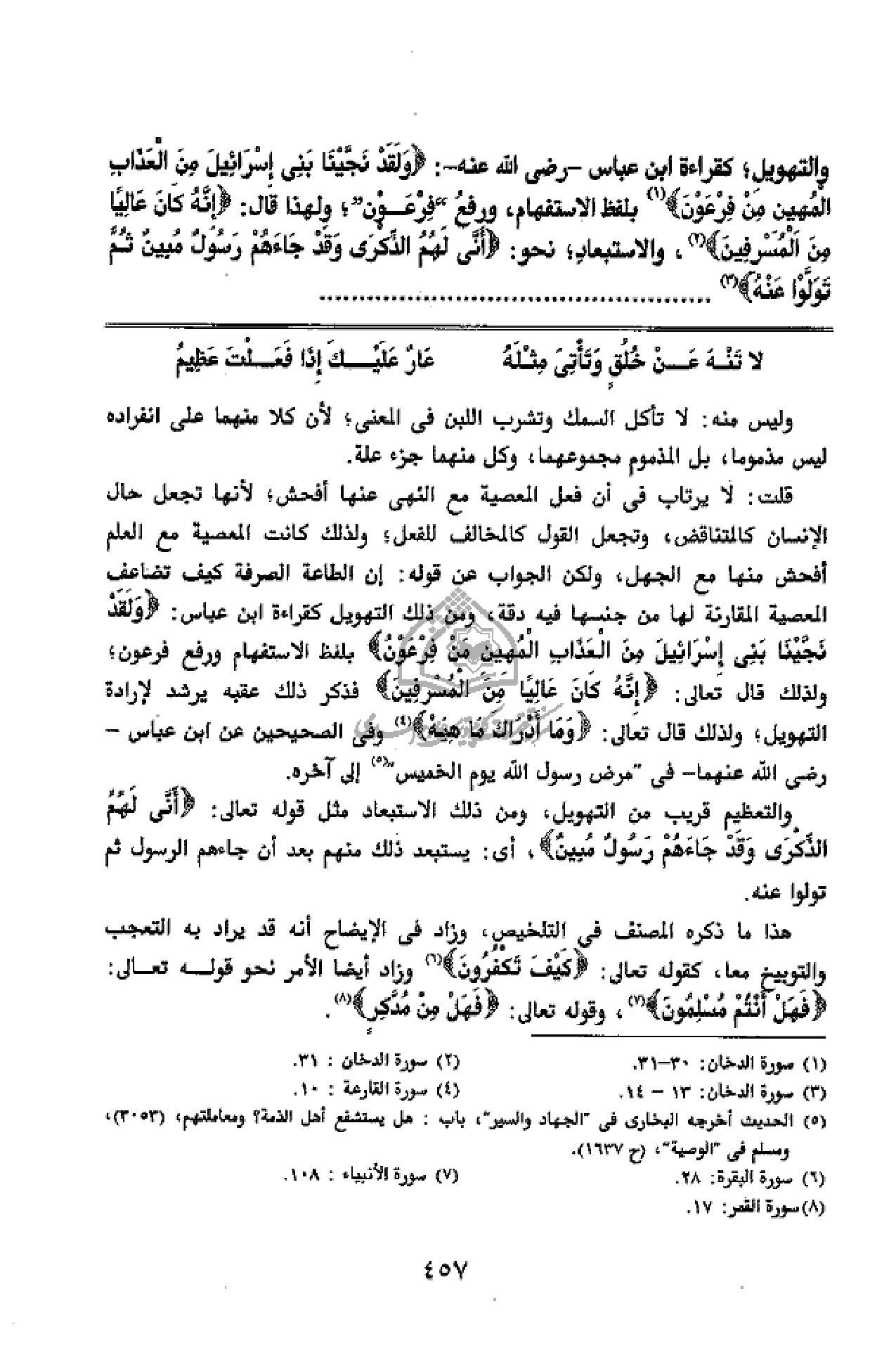 قلت: لا يرتاب فى أن فعل المعصية مع النهى عنها أفحش؛ لأنها تجعل حال الإنسان كالمتناقض، وتجعل القول كالمخالف للفعل؛ ولذلك كانت المعصية مع العلم أفحش منها مع الجهل، ولكن الجواب عن قوله: إن الطاعة الصرفة كيف تضاعف المعصية المقارنة لها من جنسها فيه دقة، ومن ذلك التهويل كقراءة ابن عباس: وَلَقَدْ نَجَّيْنا بَنِي إِسْرائِيلَ مِنَ الْعَذابِ الْمُهِينِ مِنْ فِرْعَوْنَ بلفظ الاستفهام ورفع فرعون؛ ولذلك قال تعالى: إِنَّهُ كانَ عالِياً مِنَ الْمُسْرِفِينَ فذكر ذلك عقبه يرشد لإرادة التهويل؛ ولذلك قال تعالى: وَما أَدْراكَ ما هِيَهْ (¬4) وفى الصحيحين عن ابن عباس - رضى الله عنهما - فى" مرض رسول الله يوم الخميس" (¬5) إلى آخره.