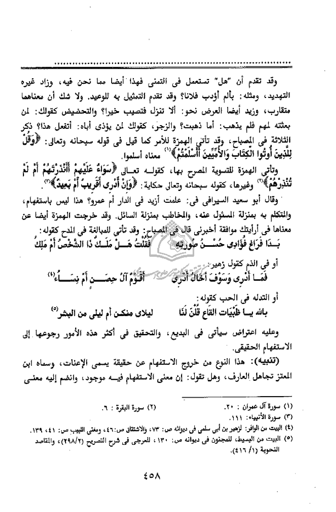 وتأتى الهمزة للتسوية المصرح بها، كقوله تعالى سَواءٌ عَلَيْهِمْ أَأَنْذَرْتَهُمْ أَمْ لَمْ تُنْذِرْهُمْ (¬2) وغيرها، كقوله سبحانه وتعالى حكاية: وَإِنْ أَدْرِي أَقَرِيبٌ أَمْ بَعِيدٌ (¬3).