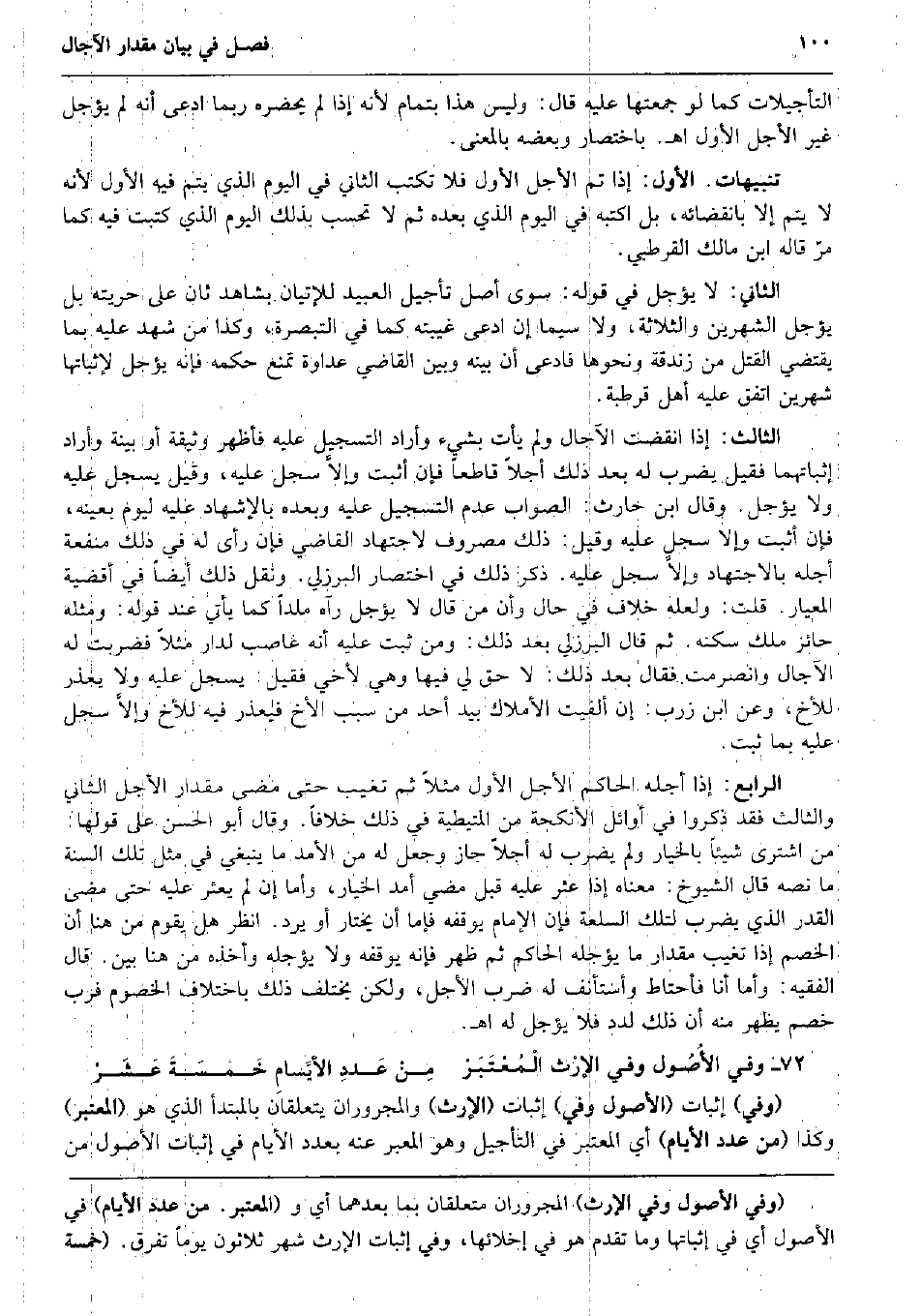 التأجيلات كَمَا لَو جمعتها عَلَيْهِ قَالَ: وَلَيْسَ هَذَا بِتمَام لِأَنَّهُ إِذا لم يحضرهُ رُبمَا ادّعى أَنه لم يُؤَجل غير الْأَجَل الأول اه. بِاخْتِصَار وَبَعضه بِالْمَعْنَى. تَنْبِيهَات. الأول: إِذا تمّ الْأَجَل الأول فَلَا تكْتب الثَّانِي فِي الْيَوْم الَّذِي يتم فِيهِ الأول لِأَنَّهُ لَا يتم إِلَّا بانقضائه، بل اكتبه فِي الْيَوْم الَّذِي بعده ثمَّ لَا تحسب بذلك الْيَوْم الَّذِي كتبت فِيهِ كَمَا مرّ قَالَه ابْن مَالك الْقُرْطُبِيّ. الثَّانِي: لَا يُؤَجل فِي قَوْله: سوى أصل تَأْجِيل العبيد للإتيان بِشَاهِد ثَان على حُرِّيَّته بل يُؤَجل الشَّهْرَيْنِ وَالثَّلَاثَة، وَلَا سِيمَا إِن ادّعى غيبته كَمَا فِي التَّبْصِرَة، وَكَذَا من شهد عَلَيْهِ بِمَا يَقْتَضِي الْقَتْل من زندقة وَنَحْوهَا فَادّعى أَن بَينه وَبَين القَاضِي عَدَاوَة تمنع حكمه فَإِنَّهُ يُؤَجل لإثباتها شَهْرَيْن اتّفق عَلَيْهِ أهل قرطبة. الثَّالِث: إِذا انْقَضتْ الْآجَال وَلم يَأْتِ بِشَيْء وَأَرَادَ التسجيل عَلَيْهِ فأظهر وَثِيقَة أَو بَيِّنَة وَأَرَادَ إثباتهما فَقيل يضْرب لَهُ بعد ذَلِك أَََجَلًا قَاطعا فَإِن أثبت وإلاَّ سجل عَلَيْهِ وَقيل يسجل عَلَيْهِ وَلَا يُؤَجل. وَقَالَ ابْن حَارِث: الصَّوَاب عدم التسجيل عَلَيْهِ وَبعده بِالْإِشْهَادِ عَلَيْهِ ليَوْم بِعَيْنِه، فَإِن أثبت وَإِلَّا سجل عَلَيْهِ وَقيل: ذَلِك مَصْرُوف لاجتهاد القَاضِي فَإِن رأى لَهُ فِي ذَلِك مَنْفَعَة أَجله بِالِاجْتِهَادِ وإلاَّ سجل عَلَيْهِ. ذكر ذَلِك فِي اخْتِصَار الْبُرْزُليّ. وَنقل ذَلِك أَيْضا فِي أقضية المعيار. قلت: وَلَعَلَّه خلاف فِي حَال وَأَن من قَالَ لَا يُؤَجل رَآهُ ملداً كَمَا يَأْتِي عِنْد قَوْله: وَمثله حائز ملك سكنه. ثمَّ قَالَ الْبُرْزُليّ بعد ذَلِك: وَمن ثَبت عَلَيْهِ أَنه غَاصِب لدار مثلا فَضربت لَهُ الْآجَال وانصرمت فَقَالَ بعد ذَلِك: لَا حق لي فِيهَا وَهِي لأخي فَقيل: يسجل عَلَيْهِ وَلَا يعْذر للْأَخ، وَعَن ابْن زرب: إِن ألفيت الْأَمْلَاك بيد أحد من سَبَب الْأَخ فيعذر فِيهِ للْأَخ وإلاَّ سجل عَلَيْهِ بِمَا ثَبت. الرَّابِع: إِذا أَجله الْحَاكِم الْأَجَل الأول مثلا ثمَّ تغيب حَتَّى مضى مِقْدَار الْأَجَل الثَّانِي وَالثَّالِث فقد ذكرُوا فِي أَوَائِل الْأَنْكِحَة من الْمُتَيْطِيَّة فِي ذَلِك خلافًا. وَقَالَ أَبُو الْحسن على قَوْلهَا: من اشْترى شَيْئا بِالْخِيَارِ وَلم يضْرب لَهُ أَََجَلًا جَازَ وَجعل لَهُ من الأمد مَا يَنْبَغِي فِي مثل تِلْكَ السّنة مَا نَصه قَالَ الشُّيُوخ: مَعْنَاهُ إِذا عثر عَلَيْهِ قبل مُضِيّ أمد الْخِيَار، وَأما إِن لم يعثر عَلَيْهِ حَتَّى مضى الْقدر الَّذِي يضْرب لتِلْك السّلْعَة فَإِن الإِمَام يوقفه فإمَّا أَن يخْتَار أَو يرد. انْظُر هَل يقوم من هُنَا أَن الْخصم إِذا تغيب مِقْدَار مَا يؤجله الْحَاكِم ثمَّ ظهر فَإِنَّهُ يوقفه وَلَا يؤجله وَأَخذه من هُنَا بَين. قَالَ الْفَقِيه: وَأما أَنا فأحتاط وأستأنف لَهُ ضرب الْأَجَل، وَلَكِن يخْتَلف ذَلِك باخْتلَاف الْخُصُوم فَرب خصم يظْهر مِنْهُ أَن ذَلِك لدد فَلَا يُؤَجل لَهُ اه. وَفِي الأُصُول وَفِي الإرْث الْمُعْتَبَرْ مِنْ عَددِ الأيَّامِ خَمْسَةَ عَشَرْ (وَفِي) إِثْبَات (الْأُصُول وَفِي) إِثْبَات (الْإِرْث) والمجروران يتعلقان بالمبتدأ الَّذِي هُوَ (الْمُعْتَبر) وَكَذَا (من عدد الْأَيَّام) أَي الْمُعْتَبر فِي التَّأْجِيل وَهُوَ الْمعبر عَنهُ بِعَدَد الْأَيَّام فِي إِثْبَات الْأُصُول من