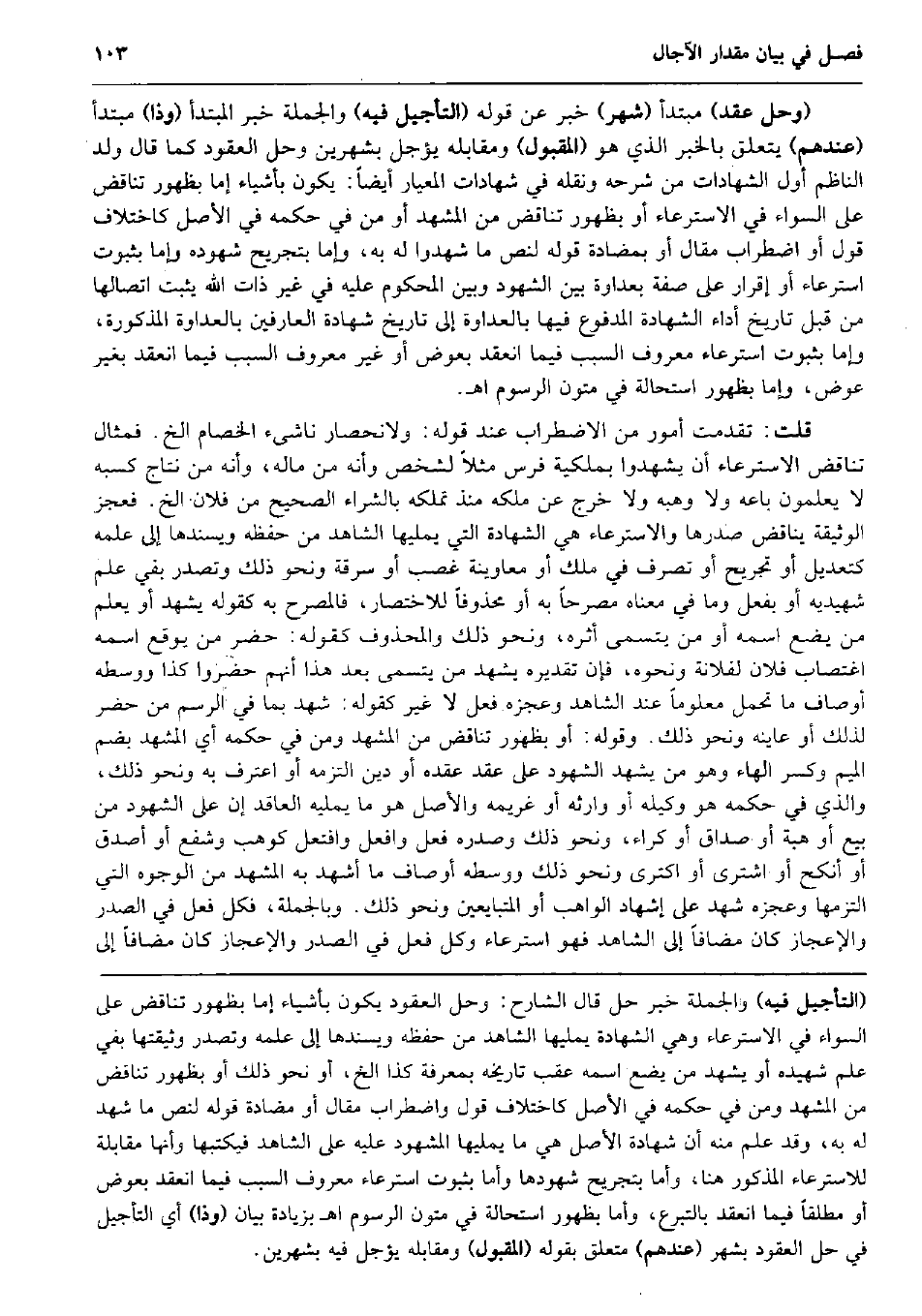 (وَحل عقد) مُبْتَدأ (شهر) خبر عَن قَوْله (التَّأْجِيل فِيهِ) وَالْجُمْلَة خبر الْمُبْتَدَأ (وَذَا) مُبْتَدأ (عِنْدهم) يتَعَلَّق بالْخبر الَّذِي هُوَ (المقبول) وَمُقَابِله يُؤَجل بشهرين وَحل الْعُقُود كَمَا قَالَ ولد النَّاظِم أول الشَّهَادَات من شَرحه وَنَقله فِي شَهَادَات المعيار أَيْضا: يكون بأَشْيَاء إِمَّا بِظُهُور تنَاقض على السوَاء فِي الاسترعاء أَو بِظُهُور تنَاقض من المشهد أَو من فِي حكمه فِي الأَصْل كاختلاف قَول أَو اضْطِرَاب مقَال أَو بمضادة قَوْله لنَصّ مَا شهدُوا لَهُ بِهِ، وَإِمَّا بتجريح شُهُوده وَإِمَّا بِثُبُوت استرعاء أَو إِقْرَار على صفة بعداوة بَين الشُّهُود وَبَين الْمَحْكُوم عَلَيْهِ فِي غير ذَات الله يثبت اتصالها من قبل تَارِيخ أَدَاء الشَّهَادَة الْمَدْفُوع فِيهَا بالعداوة إِلَى تَارِيخ شَهَادَة العارفين بالعداوة الْمَذْكُورَة، وَإِمَّا بِثُبُوت استرعاء مَعْرُوف السَّبَب فِيمَا انْعَقَد بعوض أَو غير مَعْرُوف السَّبَب فِيمَا انْعَقَد بِغَيْر عوض، وَإِمَّا بِظُهُور اسْتِحَالَة فِي متون الرسوم اه. قلت: تقدّمت أُمُور من الِاضْطِرَاب عِنْد قَوْله: ولانحصار ناشىء الْخِصَام الخ. فمثال تنَاقض الاسترعاء أَن يشْهدُوا بملكية فرس مثلا لشخص وَأَنه من مَاله، وَأَنه من نتاج كَسبه لَا يعلمُونَ بَاعه وَلَا وهبه وَلَا خرج عَن ملكه مُنْذُ تملكه بِالشِّرَاءِ الصَّحِيح من فلَان الخ. فعجز الْوَثِيقَة يُنَاقض صدرها والاسترعاء هِيَ الشَّهَادَة الَّتِي يُمْلِيهَا الشَّاهِد من حفظه ويسندها إِلَى علمه كتعديل أَو تجريح أَو تصرف فِي ملك أَو معاوينة غصب أَو سَرقَة وَنَحْو ذَلِك وتصدر بفي علم شهيديه أَو بِفعل وَمَا فِي مَعْنَاهُ مُصَرحًا بِهِ أَو محذوفاً للاختصار فالمصرح بِهِ كَقَوْلِه يشْهد أَو يعلم من يضع اسْمه أَو من يتسمى أَثَره، وَنَحْو ذَلِك والمحذوف كَقَوْلِه: حضر من يُوقع اسْمه اغتصاب فلَان لفلانة وَنَحْوه، فَإِن تَقْدِيره يشْهد من يتسمى بعد هَذَا أَنهم حَضَرُوا كَذَا ووسطه أَوْصَاف مَا تحمل مَعْلُوما عِنْد الشَّاهِد وعجزه فعل لَا غير كَقَوْلِه: شهد بِمَا فِي الرَّسْم من حضر لذَلِك أَو عاينه وَنَحْو ذَلِك. وَقَوله: أَو بِظُهُور تنَاقض من المشهد وَمن فِي حكمه أَي المشهد بِضَم الْمِيم وَكسر الْهَاء وَهُوَ من يشْهد الشُّهُود على عقد عقده أَو دين الْتَزمهُ أَو اعْترف بِهِ وَنَحْو ذَلِك، وَالَّذِي فِي حكمه هُوَ وَكيله أَو وَارثه أَو غَرِيمه وَالْأَصْل هُوَ مَا يمليه الْعَاقِد إِن على الشُّهُود من بيع أَو هبة أَو صدَاق أَو كِرَاء، وَنَحْو ذَلِك وصدره فعل وَافْعل وافتعل كوهب وشفع أَو أصدق أَو أنكح أَو اشْترى أَو اكترى وَنَحْو ذَلِك ووسطه أَوْصَاف مَا أشهد بِهِ المشهد من الْوُجُوه الَّتِي التزمها وعجزه شهد على إِشْهَاد الْوَاهِب أَو الْمُتَبَايعين وَنَحْو ذَلِك. وَبِالْجُمْلَةِ، فَكل فعل فِي الصَّدْر والإعجاز كَانَ مُضَافا إِلَى الشَّاهِد فَهُوَ استرعاء وكل فعل فِي الصَّدْر والإعجاز كَانَ مُضَافا إِلَى