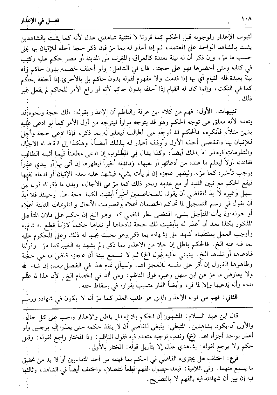 لثُبُوت الْإِعْذَار ولوجوبه قبل الحكم كَمَا قَررنَا لَا لتثنية شَاهِدي عدل لِأَنَّهُ كَمَا يثبت بالشاهدين يثبت بِالشَّاهِدِ الْوَاحِد على الْمُعْتَمد، ثمَّ إِذا أعذر لَهُ بِمَا مرّ فَإِن ذكر حجَّة أَجله للإتيان بهَا على حسب مَا مرّ، وَإِن ذكر أَن لَهُ بَيِّنَة بعيدَة كالعراق وَالْمغْرب من الْمَدِينَة أَو مصر حكم عَلَيْهِ وَكتب فِي كِتَابه وَمَتى أحضرها فَهُوَ على حجَّته. قَالَ فِي الشَّامِل: وَلَو أَحْلف خَصمه بِدُونِ حَاكم وَله بَيِّنَة بعيدَة فَلهُ الْقيام أَي بهَا إِذا قدمت وَلَا مَفْهُوم لقَوْله بِدُونِ حَاكم بل بالأحرى إِذا أحلفه بحاكم كَمَا فِي النكت، وَإِنَّمَا كَانَ لَهُ الْقيام إِذا أحلفه بِدُونِ حَاكم لِأَنَّهُ لَو رفع الْأَمر للْحَاكِم لم يفعل غير ذَلِك. تَنْبِيهَات. الأول: فهم من كَلَام ابْن عَرَفَة والناظم أَن الْإِعْذَار بقوله: أَلَك حجَّة وَنَحْوه قد يَتَعَدَّد لِأَنَّهُ مُعَلّق على توجه الحكم وَهُوَ قد يتَوَجَّه مرَارًا فَيتَوَجَّه من أول الْأَمر كَمَا لَو ادّعى عَلَيْهِ بدين مثلا، فَأنكرهُ، فَالْحكم قد توجه على الطَّالِب فيعذر لَهُ بِمَا ذكر، فَإِذا ادّعى حجَّة وَأجل للإتيان بهَا وانقضى أَجله الأول وَأَوْقفهُ أعذر لَهُ بذلك أَيْضا، وَهَكَذَا إِلَى انْقِضَاء الْآجَال والتلومات فيعذر لَهُ بذلك أَيْضا، وَكَذَا يُقَال فِي الْمَطْلُوب إِن ادّعى مطعناً فِيمَا أثْبته الطَّالِب ففائدته أَولا ليعلم مَا عِنْده من أدعائها أَو نَفيهَا، وَفَائِدَته أخيراً ليظهرها إِن أَتَى بهَا أَو يُبْدِي عذرا يُوجب تَأْخِيره كَمَا مرّ، وليظهر عَجزه إِن لم يَأْتِ بِشَيْء فَيشْهد عَلَيْهِ بِعَدَمِ الْإِتْيَان أَو ادِّعَاء نَفيهَا فَيَقَع الحكم مَعَ تبين اللدد أَو مَعَ عَدمه وَنَحْو ذَلِك كَمَا مرّ فِي الْآجَال، وَيدل لما ذَكرْنَاهُ قَول ابْن سهل وَغَيره لَا بدّ للْقَاضِي أَن يَقُول للمتخاصمين أخيراً أبقيت لَكمَا حجَّة اه. وَحِينَئِذٍ فَلَا بدّ أَن يَقُول فِي رسم التسجيل لما تحاكم الخصمان أَعْلَاهُ وانصرمت الْآجَال والتلومات الثَّابِتَة أَعْلَاهُ أَو حوله وَلم يَأْتِ المتأجل بِشَيْء اقْتضى نظر قَاضِي كَذَا وَهُوَ الخ إِن حكم على فلَان المتأجل الْمَذْكُور بِكَذَا بعد أَن أعذر لَهُ بأبقيت لَك حجَّة فادعاها أَو نفاها حكما لَازِما قطع بِهِ شغبه وَأوجب الْعَمَل بِمُقْتَضَاهُ أشهد على إشهاده بِمَا ذكر وَهُوَ بِحَيْثُ يجب لَهُ ذَلِك وعَلى الْمَحْكُوم عَلَيْهِ بِمَا فِيهِ عَنهُ الخ. فَالْحكم بَاطِل إِن خلا من الْإِعْذَار بِمَا ذكر وَلم يشْهد بِهِ الْغَيْر كَمَا مرّ. وَقَوْلنَا فادعاها أَو نفاها الخ. يَنْبَنِي عَلَيْهِ قَول (خَ) ثمَّ لَا تسمع بَيِّنَة أَن عَجزه قَاض مدعي حجَّة وظاهرها الْقبُول إِن أقرّ على نَفسه بِالْعَجزِ اه. وَسَيَأْتِي تَمام هَذَا فِي الْفَصْل بعده إِن شَاءَ الله وَلَا يُعَارض مَا مرّ عَن ابْن سهل وَغَيره قَول النَّاظِم: وَمن أَلد فِي الْخِصَام الخ. لِأَن هَذَا لما علم لدده وَأَنه يدعيها وَإِلَّا لما فر، وَأَيْضًا الفار متسبب بفراره فِي إِسْقَاط حَقه. الثَّانِي: فهم من قَوْله الْإِعْذَار الَّذِي هُوَ طلب الْعذر كَمَا مرّ أَنه لَا يكون فِي شَهَادَة ورسم