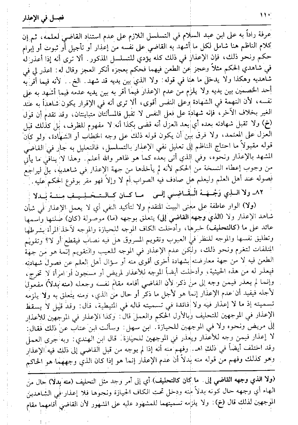عَرَفَة راداً بِهِ على ابْن عبد السَّلَام فِي التسلسل اللَّازِم على عدم استناد القَاضِي لعلمه، ثمَّ إِن كَلَام النَّاظِم هُنَا شَامِل لكل مَا أشهد بِهِ القَاضِي على نَفسه من إعذار أَو تَأْجِيل أَو ثُبُوت أَو إبرام حكم وَنَحْو ذَلِك، فَإِن الْإِعْذَار فِي ذَلِك كُله يُؤَدِّي للتسلسل الْمَذْكُور. أَلا ترى أَنه إِذا أعذر لَهُ فِي شَاهِدي الحكم مثلا وَعجز عَن الطعْن فيهمَا فَحكم بعجزه أنكر الْعَجز وَقَالَ لَهُ: اعذر لي فِي شاهديه وَهَكَذَا وَلَا يدْخل مَا هُنَا فِي قَوْله: وَلَا الَّذِي بَين يَدَيْهِ قد شهد. الخ. . لِأَنَّهُ فِيمَا أقرّ بِهِ أحد الْخَصْمَيْنِ بَين يَدَيْهِ وَلَا يلْزم من عدم الْإِعْذَار فِيمَا أقرّ بِهِ بَين يَدَيْهِ عَدمه فِيمَا أشهد بِهِ على نَفسه، لِأَن التُّهْمَة فِي الشَّهَادَة وعَلى النَّفس أقوى، أَلا ترى أَنه فِي الْإِقْرَار يكون شَاهدا بِهِ عِنْد الْغَيْر بِخِلَاف الآخر، فَإِنَّهُ شَهَادَة على فعل النَّفس لَا تقبل فالمسألتان متباينتان، وَقد تقدم أَن قَول (خَ) وَلَا تقبل شَهَادَته بعده أَي بعد الْعَزْل أَنه قضى بِكَذَا أَنه لَا مَفْهُوم للظرف، بل كَذَلِك قبل الْعَزْل على الْمُعْتَمد، وَلَا فرق بَين أَن يكون قَوْله ذَلِك على وَجه الْخطاب أَو الشَّهَادَة، وَلَو كَانَ قَوْله مَقْبُولًا مَا احْتَاجَ النَّاظِم إِلَى تَعْلِيل نفي الْإِعْذَار بالتسلسل، فالتعليل بِهِ جَار فِي القَاضِي المشهد بالإعذار وَنَحْوه، وَفِي الَّذِي أَتَى بعده كَمَا هُوَ ظَاهر وَالله أعلم. وَهَذَا لَا يُنَافِي مَا يَأْتِي من وجوب إِعْطَاء النُّسْخَة من الحكم لِأَنَّهُ لم يَأْخُذهَا من جِهَة الْإِعْذَار فِي شاهديه، بل ليراجع فصوله عِنْد أهل الْعلم وليعلم هَل صَادف فِيهِ الصَّوَاب أم لَا وإلاَّ فَهُوَ مقرّ بِوُقُوع الحكم عَلَيْهِ. وَلَا الذِي وَجَّهَهُ الْقَاضِي إِلَى مَا كَانَ كالتحْلِيفِ مِنهُ بَدلا (وَلَا) الْوَاو عاطفة على معنى الْبَيْت الْمُتَقَدّم وَلَا لتأكيد النَّفْي أَي لَا يعْمل الْإِعْذَار فِي شَأْن شَاهد الْإِعْذَار وَلَا (الَّذِي وَجهه القَاضِي إِلَى) يتَعَلَّق بِوَجْهِهِ (مَا) مَوْصُولَة (كَانَ) صلتها وَاسْمهَا عَائِد على مَا (كالتحليف) خَبَرهَا، وأدخلت الْكَاف الموجه للحيازة والموجه لآخذ الْمَرْأَة بشرطها وتطليق نَفسهَا والموجه للنَّظَر فِي الْعُيُوب وتقويم الْمَسْرُوق هَل فِيهِ نِصَاب فَيقطع أَو لَا؟ وتقويم الْمُتْلفَات لتغرم وَنَحْو ذَلِك، وَلَكِن عدم الْإِعْذَار فِي الموجه للعيب والتقويم إِنَّمَا هُوَ من جِهَة الطعْن فِيهِ لَا من جِهَة معارضته بِشَهَادَة أُخْرَى أقوى مِنْهُ أَو سُؤال أهل الْعلم عَن فُصُول شَهَادَته فيعذر لَهُ من هَذِه الْحَيْثِيَّة، وأدخلت أَيْضا الموجه للأعذار لمريض أَو مسجون أَو امْرَأَة لَا تخرج، وَإِنَّمَا لم يعْذر فِيمَن وَجه إِلَى من ذكر لِأَن القَاضِي أَقَامَهُ مقَام نَفسه وَجعله (مِنْهُ بَدَلا) مفعول لأَجله فَيُفِيد أَن عدم الْإِعْذَار إِنَّمَا هُوَ لأجل مَا ذكر أَو حَال من الَّذِي، وَمِنْه يتَعَلَّق بِهِ وَلَا يلْزمه تَسْمِيَته إِذْ مَا لَا إعذار فِيهِ وَلَا فَائِدَة فِي تَسْمِيَته قَالَه فِي الْمُتَيْطِيَّة، قَالَ: وَقد قيل لَا يسْقط الْإِعْذَار فِي الموجهين للتحليف وبالأول الحكم وَالْعَمَل قَالَ: وَكَذَا الْإِعْذَار فِي الموجهين للأعذار إِلَى مَرِيض وَنَحْوه وَلَا فِي الموجهين للحيازة. ابْن سهل: وَسَأَلت ابْن عتاب عَن ذَلِك فَقَالَ: لَا إعذار فِيمَن وَجه للأعذار ويعذر فِي الموجهين للحيازة. قَالَ ابْن الْهِنْدِيّ: وَبِه جرى الْعَمَل وَقد اخْتلف أَيْضا فِي ذَلِك اه. وَفهم مِنْهُ أَنه إِذا لم يُوَجه من قبل القَاضِي إِلَى ذَلِك فِيهِ الْإِعْذَار وَهُوَ كَذَلِك وَفهم من قَوْله مِنْهُ بَدَلا أَن عدم الْإِعْذَار إِنَّمَا هُوَ إِذا كَانَ الَّذِي وجههما هُوَ الْحَاكِم