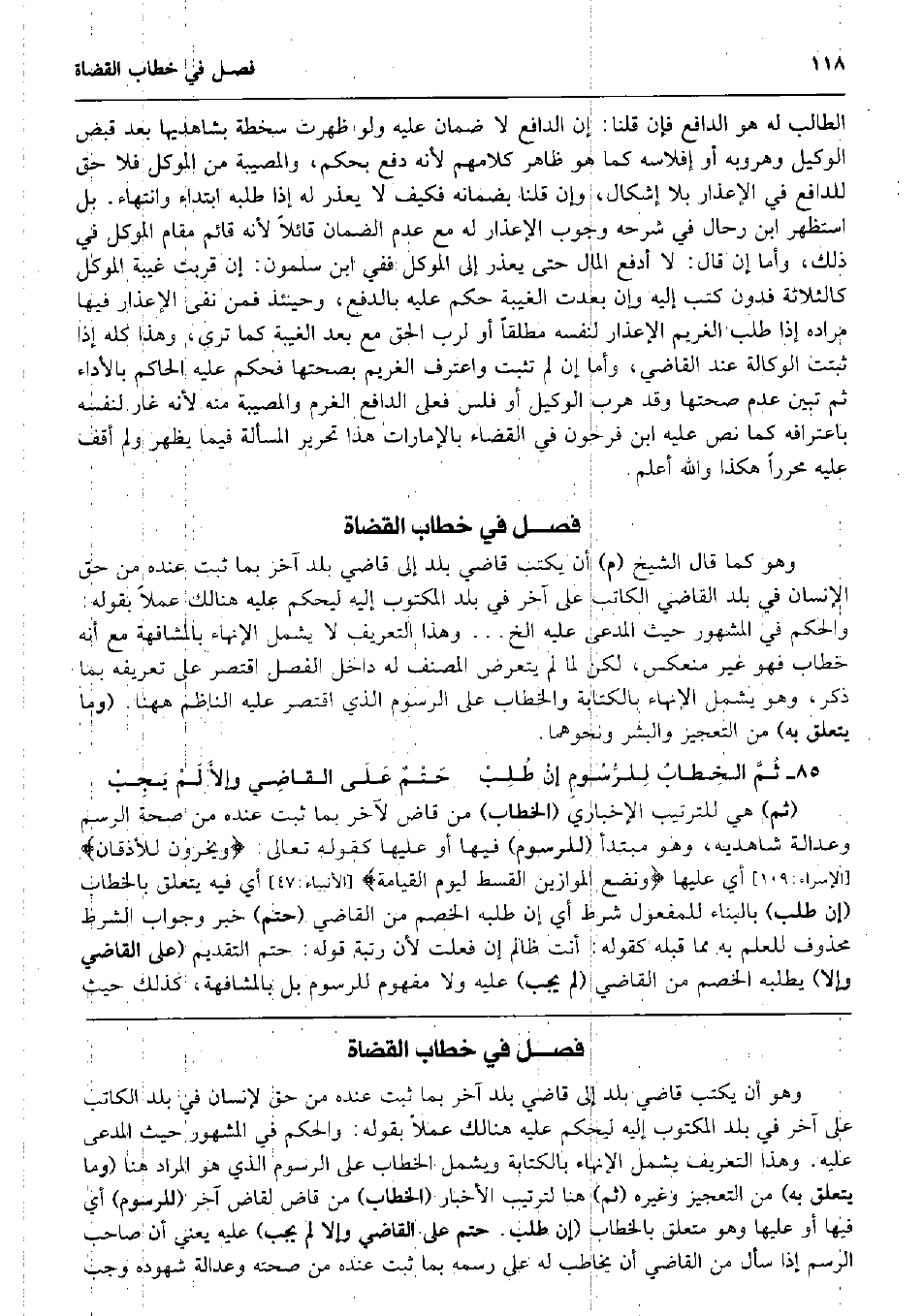 وَهُوَ كَمَا قَالَ الشَّيْخ (م) أَن يكْتب قَاضِي بلد إِلَى قَاضِي بلد آخر بِمَا ثَبت عِنْده من حق الْإِنْسَان فِي بلد القَاضِي الْكَاتِب على آخر فِي بلد الْمَكْتُوب إِلَيْهِ ليحكم عَلَيْهِ هُنَالك عملا بقوله: وَالْحكم فِي الْمَشْهُور حَيْثُ الْمُدعى عَلَيْهِ الخ ... وَهَذَا التَّعْرِيف لَا يَشْمَل الإنهاء بالمشافهة مَعَ أَنه خطاب فَهُوَ غير منعكس، لَكِن لما لم يتَعَرَّض المُصَنّف لَهُ دَاخل الْفَصْل اقْتصر على تَعْرِيفه بِمَا ذكر، وَهُوَ يَشْمَل الإنهاء بِالْكِتَابَةِ وَالْخطاب على الرسوم الَّذِي اقْتصر عَلَيْهِ النَّاظِم هَهُنَا. (وَمَا يتَعَلَّق بِهِ) من التَّعْجِيز والبشر وَنَحْوهمَا. ثُمَّ الخِطابُ لِلرُّسُومِ إنْ طُلِبْ حَتْمٌ عَلَى القاضِي وإلاَّ لَمْ يَجِبْ (ثمَّ) هِيَ للتَّرْتِيب الإخباري (الْخطاب) من قَاض لآخر بِمَا ثَبت عِنْده من صِحَة الرَّسْم وعدالة شاهديه، وَهُوَ مُبْتَدأ (للرسوم) فِيهَا أَو عَلَيْهَا كَقَوْلِه تَعَالَى: ويخرون للأذقان} (الْإِسْرَاء: 109) أَي عَلَيْهَا وَنَضَع الموازين الْقسْط ليَوْم الْقِيَامَة} (الْأَنْبِيَاء: 47) أَي فِيهِ يتَعَلَّق بِالْخِطَابِ (إِن طلب) بِالْبِنَاءِ للْمَفْعُول شَرط أَي إِن طلبه الْخصم من القَاضِي (حتم) خبر وَجَوَاب الشَّرْط مَحْذُوف للْعلم بِهِ مِمَّا قبله كَقَوْلِه: أَنْت ظَالِم إِن فعلت لِأَن رُتْبَة قَوْله: حتم التَّقْدِيم (على القَاضِي وَإِلَّا) يَطْلُبهُ الْخصم من القَاضِي (لم يجب) عَلَيْهِ وَلَا مَفْهُوم للرسوم بل بالمشافهة، كَذَلِك حَيْثُ