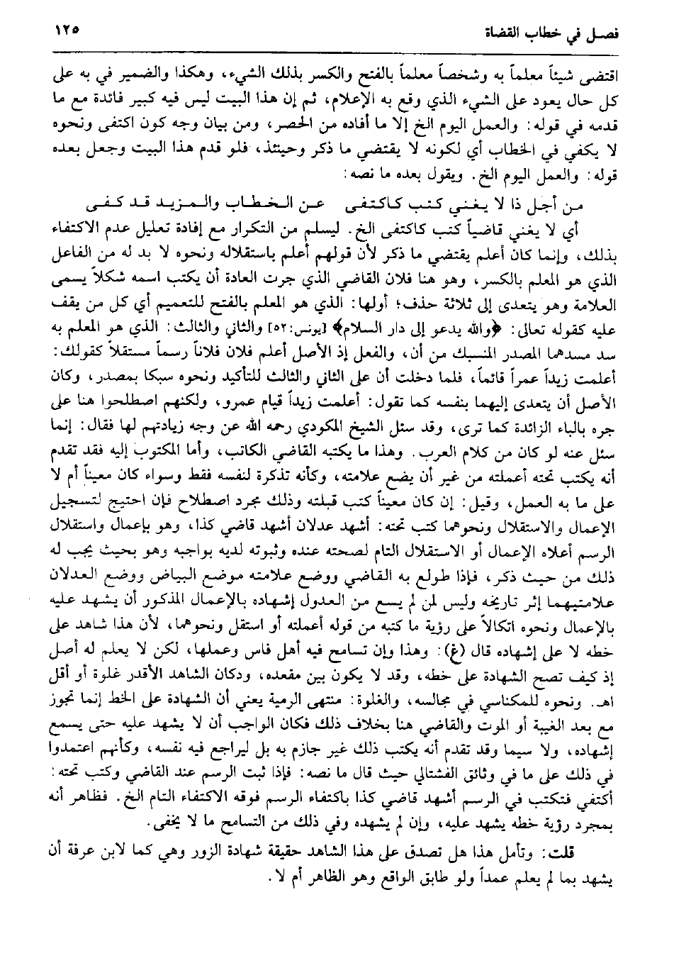 اقْتضى شَيْئا معلما بِهِ وشخصاً معلما بِالْفَتْح وَالْكَسْر بذلك الشَّيْء، وَهَكَذَا وَالضَّمِير فِي بِهِ على كل حَال يعود على الشَّيْء الَّذِي وَقع بِهِ الْإِعْلَام، ثمَّ إِن هَذَا الْبَيْت لَيْسَ فِيهِ كَبِير فَائِدَة مَعَ مَا قدمه فِي قَوْله: وَالْعَمَل الْيَوْم الخ إِلَّا مَا أَفَادَهُ من الْحصْر، وَمن بَيَان وَجه كَون اكْتفى وَنَحْوه لَا يَكْفِي فِي الْخطاب أَي لكَونه لَا يَقْتَضِي مَا ذكر وَحِينَئِذٍ، فَلَو قدم هَذَا الْبَيْت وَجعل بعده قَوْله: وَالْعَمَل الْيَوْم الخ. وَيَقُول بعده مَا نَصه: من أجل ذَا لَا يُغني كتب كاكتفى عَن الْخطاب والمزيد قد كفى أَي لَا يُغني قَاضِيا كتب كاكتفى الخ. ليسلم من التّكْرَار مَعَ إِفَادَة تَعْلِيل عدم الِاكْتِفَاء بذلك، وَإِنَّمَا كَانَ أعلم يَقْتَضِي مَا ذكر لِأَن قَوْلهم أعلم باستقلاله وَنَحْوه لَا بُد لَهُ من الْفَاعِل الَّذِي هُوَ الْمعلم بِالْكَسْرِ، وَهُوَ هُنَا فلَان القَاضِي الَّذِي جرت الْعَادة أَن يكْتب اسْمه شكلاً يُسمى الْعَلامَة وَهُوَ يتَعَدَّى إِلَى ثَلَاثَة حذف؛ أَولهَا: الَّذِي هُوَ الْمعلم بِالْفَتْح للتعميم أَي كل من يقف عَلَيْهِ كَقَوْلِه تَعَالَى: وَالله يَدْعُو إِلَى دَار السَّلَام} (يُونُس: 52) وَالثَّانِي وَالثَّالِث: الَّذِي هُوَ الْمعلم بِهِ سد مسدهما الْمصدر المنسبك من أَن، وَالْفِعْل إِذْ الأَصْل أعلم فلَان فلَانا رسماً مُسْتقِلّا كَقَوْلِك: أعلمت زيدا عمرا قَائِما، فَلَمَّا دخلت أَن على الثَّانِي وَالثَّالِث للتَّأْكِيد وَنَحْوه سبكا بمصدر، وَكَانَ الأَصْل أَن يتَعَدَّى إِلَيْهِمَا بِنَفسِهِ كَمَا تَقول: أعلمت زيدا قيام عَمْرو، وَلَكنهُمْ اصْطَلحُوا هُنَا على جَرّه بِالْبَاء الزَّائِدَة كَمَا ترى، وَقد سُئِلَ الشَّيْخ المكودي رَحمَه الله عَن وَجه زيادتهم لَهَا فَقَالَ: إِنَّمَا سُئِلَ عَنهُ لَو كَانَ من كَلَام الْعَرَب. وَهَذَا مَا يَكْتُبهُ القَاضِي الْكَاتِب، وَأما الْمَكْتُوب إِلَيْهِ فقد تقدم أَنه يكْتب تَحْتَهُ أعملته من غير أَن يضع علامته، وَكَأَنَّهُ تذكرة لنَفسِهِ فَقَط وَسَوَاء كَانَ معينا أم لَا على مَا بِهِ الْعَمَل، وَقيل: إِن كَانَ معينا كتب قبلته وَذَلِكَ مُجَرّد اصْطِلَاح فَإِن احْتِيجَ لتسجيل الإعمال والاستقلال وَنَحْوهمَا كتب تَحْتَهُ: أشهد عَدْلَانِ أشهد قَاضِي كَذَا، وَهُوَ بإعمال واستقلال الرَّسْم أَعْلَاهُ الإعمال أَو الِاسْتِقْلَال التَّام لصِحَّته عِنْده وثبوته لَدَيْهِ بواجبه وَهُوَ بِحَيْثُ يجب لَهُ ذَلِك من حَيْثُ ذكر فَإِذا طولع بِهِ القَاضِي وَوضع علامته مَوضِع الْبيَاض وَوضع العدلان علامتيهما إِثْر تَارِيخه وَلَيْسَ لمن لم يسع من الْعُدُول إشهاده بالإعمال الْمَذْكُور أَن يشْهد عَلَيْهِ بالإعمال وَنَحْوه اتكالاً على رُؤْيَة مَا كتبه من قَوْله أعملته أَو اسْتَقل وَنَحْوهمَا، لِأَن هَذَا شَاهد على خطه لَا على إشهاده قَالَ (غ) : وَهَذَا وَإِن تسَامح فِيهِ أهل فاس وعملها، لَكِن لَا يعلم لَهُ أصل إِذْ كَيفَ تصح الشَّهَادَة على خطه، وَقد لَا يكون بَين مَقْعَده، ودكان الشَّاهِد الأقدر غلوة أَو أقل اه. وَنَحْوه للمكناسي فِي مجالسه، والغلوة: مُنْتَهى الرَّمية يَعْنِي أَن الشَّهَادَة على الْخط إِنَّمَا تجوز مَعَ بعد الْغَيْبَة أَو الْمَوْت وَالْقَاضِي هُنَا بِخِلَاف ذَلِك فَكَانَ الْوَاجِب أَن لَا يشْهد عَلَيْهِ حَتَّى يسمع إشهاده، وَلَا سِيمَا وَقد تقدم أَنه يكْتب ذَلِك غير جازم بِهِ بل ليراجع فِيهِ نَفسه، وَكَأَنَّهُم اعتمدوا فِي ذَلِك على مَا فِي وثائق الفشتالي حَيْثُ قَالَ مَا نَصه: فَإِذا ثَبت الرَّسْم عِنْد القَاضِي وَكتب تَحْتَهُ: أكتفي فتكتب فِي الرَّسْم أشهد قَاضِي كَذَا باكتفاء الرَّسْم فَوْقه الِاكْتِفَاء التَّام الخ. فَظَاهر أَنه بِمُجَرَّد رُؤْيَة خطه يشْهد عَلَيْهِ، وَإِن لم يشهده وَفِي ذَلِك من الت