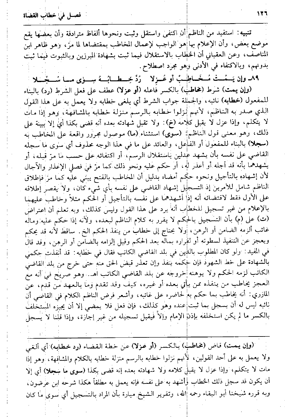 1648 - ; ى مَا سُجِّلا (وَإِن يمت) شَرط (مُخَاطب) بِالْكَسْرِ فَاعله (أَو عزلا) عطف على فعل الشَّرْط (رد) بِالْبِنَاءِ للْمَفْعُول (خطابه) نَائِبه، وَالْجُمْلَة جَوَاب الشَّرْط أَي يلغى خطابه وَلَا يعْمل بِهِ على هَذَا القَوْل الَّذِي صدر بِهِ النَّاظِم، لأَنهم نزلُوا خطابه بالرسم منزلَة خطابه بالمشافهة، وَهُوَ إِذا مَاتَ لَا يتَكَلَّم، وَإِذا عزل لَا يقبل كَلَامه (خَ) : وَلَا تقبل شَهَادَته بعده أَنه قضى بِكَذَا أَي إِلَّا بِبَيِّنَة على ذَلِك، وَهُوَ معنى قَول النَّاظِم: (سوى) اسْتثِْنَاء (مَا) مَوْصُول مجرور وَاقعَة على الْمُخَاطب بِهِ (سجلا) بِالْبِنَاءِ للْمَفْعُول أَو الْفَاعِل، والعائد على مَا فِي هَذَا الْوَجْه مَحْذُوف أَي سوى مَا سجله القَاضِي على نَفسه بِأَن يشْهد عَدْلَيْنِ باستقلال الرَّسْم، أَو اكتفائه على حسب مَا مرّ قبله، أَو يشهدهما بِأَنَّهُ قد أَجله أَو أعذر لَهُ، أَو حكم عَلَيْهِ وَنَحْو ذَلِك كَمَا مرّ فِي فَصلي الْإِعْذَار والآجال لِأَن إشهاده بالتأجيل وَنَحْوه حكم أَمْضَاهُ بِدَلِيل أَن الْمُخَاطب بِالْفَتْح يَبْنِي عَلَيْهِ كَمَا مرّ فإطلاق النَّاظِم شَامِل للأمرين إِذْ التسجيل إِشْهَاد القَاضِي على نَفسه بِأَيّ شَيْء كَانَ، وَلَا يقصر إِطْلَاقه على الأول فَقَط لاقْتِضَائه أَنه إِذا أشهدهما على نَفسه بالتأجيل أَو الحكم مثلا وخاطب عَلَيْهِمَا بالإعلام من غير تسجيل للخطاب أَنه يرد على هَذَا القَوْل وَلَيْسَ كَذَلِك، وَبِه تعلم أَن اعْتِرَاض (ت) على (م) بِأَن التسجيل بالحكم لَا يُقرر بِهِ كَلَام النَّاظِم لبعده، وَلِأَنَّهُ إِذا حكم عَلَيْهِ وَمَاله غَائِب ألزمهُ الضَّامِن أَو الرَّهْن، وَلَا يحْتَاج إِلَى خطاب من ينفذ الحكم الخ. سَاقِط لِأَنَّهُ قد يحكم ويعجز عَن التَّنْفِيذ لسطوته أَو لفراره بِمَالِه بعد الحكم وَقبل إِلْزَامه بالضامن أَو الرَّهْن، وَقد قَالَ فِي الْمُفِيد: وَلَو كَانَ الْمَطْلُوب بِالدّينِ فِي بلد القَاضِي الْكَاتِب فَقَالَ فِي خطابه: قد أنفذت حكمي بِالشَّهَادَةِ على خطّ الشُّهُود فَإِن حكمه ينفذ وَإِن تعذر قبض الْحق مِنْهُ حَتَّى خرج من بلد القَاضِي الْكَاتِب لزمَه الحكم وَلَا يوهنه خُرُوجه عَن بلد القَاضِي الْكَاتِب اه. وَهُوَ صَرِيح فِي أَنه مَعَ الْعَجز يُخَاطب من ينفذهُ مِمَّن يَأْتِي بعده أَو غَيره، كَيفَ وَقد تقدم وَمَا بالعهد من قدم، عَن الْمَازرِيّ: أَنه يُخَاطب بِمَا حكم بِهِ لحاضره على غائبه وأشعر فرض النَّاظِم الْكَلَام فِي القَاضِي أَن نَائِبه لَيْسَ لَهُ أَن يسجل بِمَا ثَبت عِنْده وَهُوَ كَذَلِك، فَإِن فعل فَلَا يمْضِي إِلَّا أَن يُجِيزهُ الْمُسْتَخْلف بِالْكَسْرِ مَا لم يكن اسْتَخْلَفَهُ بِإِذن الإِمَام وإلاَّ فَيقبل تسجيله من غير إجَازَة، وَإِذا قُلْنَا لَا يسجل