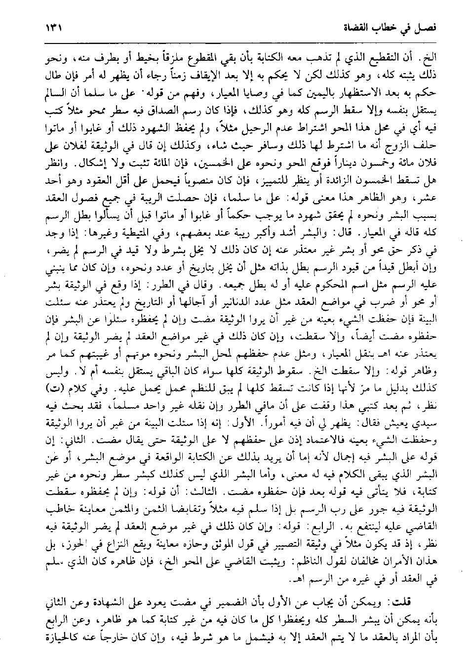 الخ. أَن التقطيع الَّذِي لم تذْهب مَعَه الْكِتَابَة بِأَن بَقِي الْمَقْطُوع ملزقاً بخيط أَو بِطرف مِنْهُ، وَنَحْو ذَلِك يُثبتهُ كُله، وَهُوَ كَذَلِك لَكِن لَا يحكم بِهِ إِلَّا بعد الإيقاف زَمنا رَجَاء أَن يظْهر لَهُ أَمر فَإِن طَال حكم بِهِ بعد الِاسْتِظْهَار بِالْيَمِينِ كَمَا فِي وَصَايَا المعيار، وَفهم من قَوْله: على مَا سلما أَن السَّالِم يسْتَقلّ بِنَفسِهِ وَإِلَّا سقط الرَّسْم كُله وَهُوَ كَذَلِك، فَإِذا كَانَ رسم الصَدَاق فِيهِ سطر ممحو مثلا كتب فِيهِ أَي فِي مَحل هَذَا المحو اشْتِرَاط عدم الرحيل مثلا، وَلم يحفظ الشُّهُود ذَلِك أَو غَابُوا أَو مَاتُوا حلف الزَّوْج أَنه مَا اشْترط لَهَا ذَلِك وسافر حَيْثُ شَاءَ، وَكَذَلِكَ إِن قَالَ فِي الْوَثِيقَة لفُلَان على فلَان مائَة وَخَمْسُونَ دِينَارا فَوَقع المحو وَنَحْوه على الْخمسين، فَإِن الْمِائَة تثبت وَلَا إِشْكَال. وَانْظُر هَل تسْقط الْخَمْسُونَ الزَّائِدَة أَو ينظر للتمييز، فَإِن كَانَ مَنْصُوبًا فَيحمل على أقل الْعُقُود وَهُوَ أحد عشر، وَهُوَ الظَّاهِر هَذَا معنى قَوْله: على مَا سلما، فَإِن حصلت الرِّيبَة فِي جَمِيع فُصُول العقد بِسَبَب الْبشر وَنَحْوه لم يُحَقّق شُهُود مَا يُوجب حكما أَو غَابُوا أَو مَاتُوا قبل أَن يسْأَلُوا بَطل الرَّسْم كُله قَالَه فِي المعيار. قَالَ: والبشر أَشد وأكبر رِيبَة عِنْد بَعضهم، وَفِي الْمُتَيْطِيَّة وَغَيرهَا: إِذا وجد فِي ذكر حق محو أَو بشر غير معتذر عَنهُ إِن كَانَ ذَلِك لَا يخل بِشَرْط وَلَا قيد فِي الرَّسْم لم يضر، وَإِن أبطل قيدا من قيود الرَّسْم بَطل بِذَاتِهِ مثل أَن يخل بتاريخ أَو عدد وَنَحْوه، وَإِن كَانَ مِمَّا يَنْبَنِي عَلَيْهِ الرَّسْم مثل اسْم الْمَحْكُوم عَلَيْهِ أَو لَهُ بَطل جَمِيعه. وَقَالَ فِي الطرر: إِذا وَقع فِي الْوَثِيقَة بشر أَو محو أَو ضرب فِي مَوَاضِع العقد مثل عدد الدَّنَانِير أَو آجالها أَو التَّارِيخ وَلم يعْتَذر عَنهُ سُئِلت الْبَيِّنَة فَإِن حفظت الشَّيْء بِعَيْنِه من غير أَن يرَوا الْوَثِيقَة مَضَت وَإِن لم يحفظوه سئلوا عَن الْبشر فَإِن حفظوه مَضَت أَيْضا، وَإِلَّا سَقَطت، وَإِن كَانَ ذَلِك فِي غير مَوَاضِع العقد لم يضر الْوَثِيقَة وَإِن لم يعْتَذر عَنهُ اه بِنَقْل المعيار، وَمثل عدم حفظهم لمحل الْبشر وَنَحْوه مَوْتهمْ أَو غيبتهم كَمَا مر وَظَاهر قَوْله: وَإِلَّا سَقَطت الخ. سُقُوط الْوَثِيقَة كلهَا سَوَاء كَانَ الْبَاقِي يسْتَقلّ بِنَفسِهِ أم لَا. وَلَيْسَ كَذَلِك بِدَلِيل مَا مرّ لِأَنَّهَا إِذا كَانَت تسْقط كلهَا لم يبْق للنظم محمل يحمل عَلَيْهِ. وَفِي كَلَام (ت) نظر، ثمَّ بعد كتبي هَذَا وقفت على أَن مافي الطرر وَإِن نَقله غير وَاحِد مُسلما، فقد بحث فِيهِ سَيِّدي يعِيش فَقَالَ: يظْهر لي أَن فِيهِ أموراً. الأول: إِنَّه إِذا سُئِلت الْبَيِّنَة من غير أَن يرَوا الْوَثِيقَة وحفظت الشَّيْء بِعَيْنِه فالاعتماد إِذن على حفظهم لَا على الْوَثِيقَة حَتَّى يُقَال مَضَت. الثَّانِي: إِن قَوْله على الْبشر فِيهِ إِجْمَال لِأَنَّهُ إِمَّا أَن يُرِيد بذلك عَن الْكِتَابَة الْوَاقِعَة فِي مَوضِع الْبشر، أَو عَن الْبشر الَّذِي يبْقى الْكَلَام فِيهِ لَهُ معنى، وَأما الْبشر الَّذِي لَيْسَ كَذَلِك كبشر سطر وَنَحْوه من غير كِتَابَة، فَلَا يَتَأَتَّى فِيهِ قَوْله بعد فَإِن حفظوه مَضَت. الثَّالِث: أَن قَوْله: وَإِن لم يحفظوه سَقَطت الْوَثِيقَة فِيهِ جور على رب الرَّسْم بل إِذا سلم فِيهِ مثلا وَتقَابَضَا الثّمن والمثمن مُعَاينَة خَاطب القَاضِي عَلَيْهِ لينْتَفع بِهِ. الرَّابِع: قَوْله: وَإِن كَانَ ذَلِك فِي غير مَوضِع العقد لم يضر الْوَثِيقَة فِيهِ نظر، إِذْ قد يكون مثلا فِي وَثِيقَة التصيير فِي قَول الموثق وحازه مُعَاينَة وَيَقَع النزاع فِي الْحَوْز، بل هَذَانِ الْأَمْرَانِ مخالفان لقَوْل النَّاظِم: وَيثبت الق