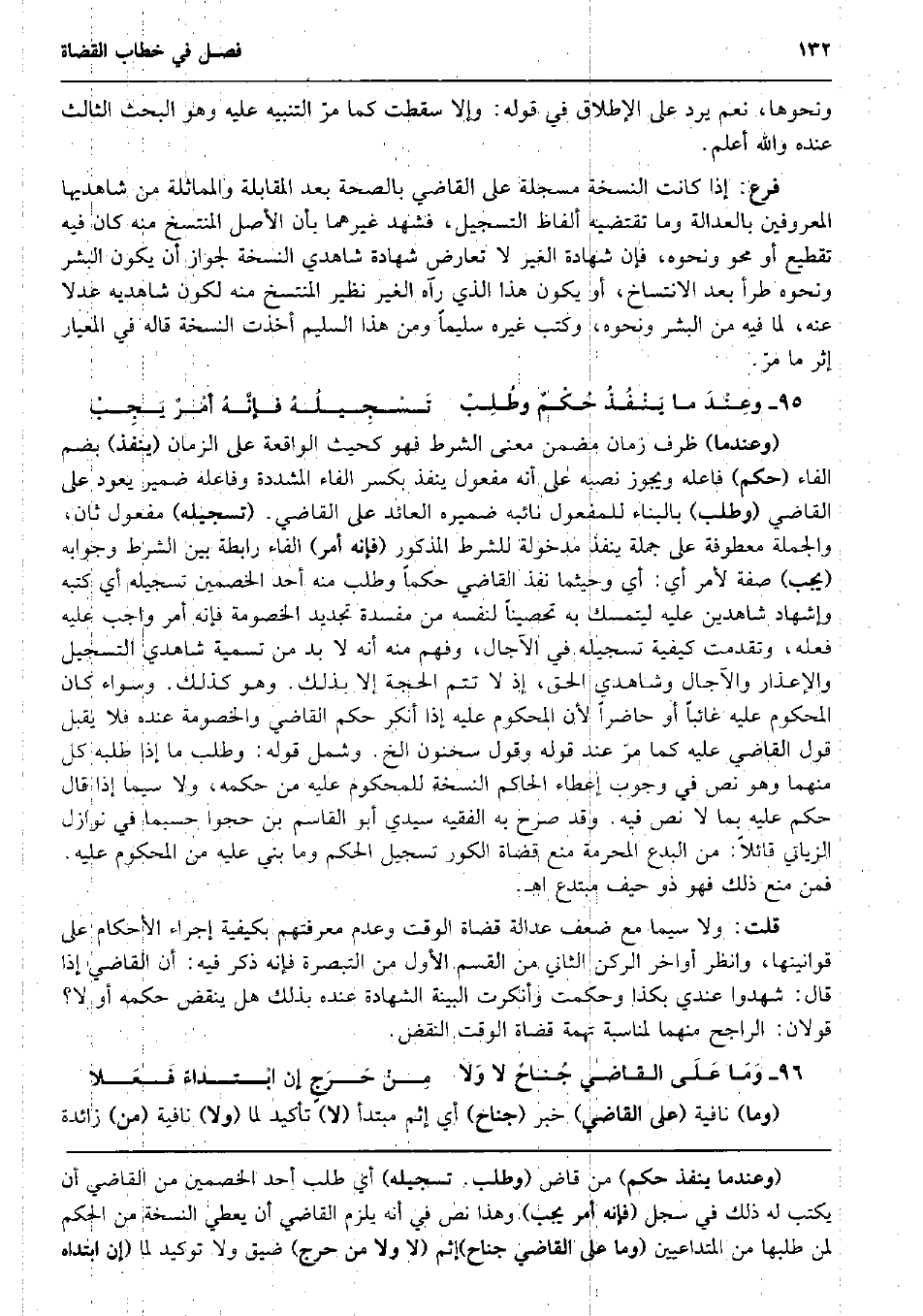 وَنَحْوهَا، نعم يرد على الْإِطْلَاق فِي قَوْله: وَإِلَّا سَقَطت كَمَا مرّ التَّنْبِيه عَلَيْهِ وَهُوَ الْبَحْث الثَّالِث عِنْده وَالله أعلم. فرع: إِذا كَانَت النُّسْخَة مسجلة على القَاضِي بِالصِّحَّةِ بعد الْمُقَابلَة والمماثلة من شاهديها المعروفين بِالْعَدَالَةِ وَمَا تَقْتَضِيه أَلْفَاظ التسجيل، فَشهد غَيرهمَا بِأَن الأَصْل المنتسخ مِنْهُ كَانَ فِيهِ تقطيع أَو محو وَنَحْوه، فَإِن شَهَادَة الْغَيْر لَا تعَارض شَهَادَة شَاهِدي النُّسْخَة لجَوَاز أَن يكون الْبشر وَنَحْوه طَرَأَ بعد الانتساخ، أَو يكون هَذَا الَّذِي رَآهُ الْغَيْر نَظِير المنتسخ مِنْهُ لكَون شاهديه عدلا عَنهُ، لما فِيهِ من الْبشر وَنَحْوه، وَكتب غَيره سليما وَمن هَذَا السَّلِيم أخذت النُّسْخَة قَالَه فِي المعيار إِثْر مَا مرّ. وعِنْدَ مَا يَنْفُذُ حُكْمٌ وطُلِبْ تَسْجِيلُهُ فإنَّهُ أمْرٌ يَجِبْ (وعندما) ظرف زمَان مضمن معنى الشَّرْط فَهُوَ كحيث الْوَاقِعَة على الزَّمَان (ينفذ) بِضَم الْفَاء (حكم) فَاعله وَيجوز نَصبه على أَنه مفعول ينفذ بِكَسْر الْفَاء الْمُشَدّدَة وفاعله ضمير يعود على القَاضِي (وَطلب) بِالْبِنَاءِ للْمَفْعُول نَائِبه ضَمِيره الْعَائِد على القَاضِي. (تسجيله) مفعول ثَان، وَالْجُمْلَة معطوفة على جملَة ينفذ مدخولة للشّرط الْمَذْكُور (فَإِنَّهُ أَمر) الْفَاء رابطة بَين الشَّرْط وَجَوَابه (يجب) صفة لأمر أَي: أَي وحيثما نفذ القَاضِي حكما وَطلب مِنْهُ أحد الْخَصْمَيْنِ تسجيله أَي كتبه وإشهاد شَاهِدين عَلَيْهِ ليتمسك بِهِ تحصيناً لنَفسِهِ من مفْسدَة تَجْدِيد الْخُصُومَة فَإِنَّهُ أَمر وَاجِب عَلَيْهِ فعله وَتَقَدَّمت كَيْفيَّة تسجيله فِي الْآجَال، وَفهم مِنْهُ أَنه لَا بُد من تَسْمِيَة شَاهِدي التسجيل والإعذار والآجال وشاهدي الْحق، إِذْ لَا تتمّ الْحجَّة إِلَّا بذلك. وَهُوَ كَذَلِك. وَسَوَاء كَانَ الْمَحْكُوم عَلَيْهِ غَائِبا أَو حَاضرا لِأَن الْمَحْكُوم عَلَيْهِ إِذا أنكر حكم القَاضِي وَالْخُصُومَة عِنْده فَلَا يقبل قَول القَاضِي عَلَيْهِ كَمَا مرّ عِنْد قَوْله وَقَول سَحْنُون الخ. وَشَمل قَوْله: وَطلب مَا إِذا طلبه كل مِنْهُمَا وَهُوَ نَص فِي وجوب إِعْطَاء الْحَاكِم النُّسْخَة للمحكوم عَلَيْهِ من حكمه، وَلَا سِيمَا إِذا قَالَ حكم عَلَيْهِ بِمَا لَا نَص فِيهِ. وَقد صرح بِهِ الْفَقِيه سَيِّدي أَبُو الْقَاسِم بن حجُّوا حَسْبَمَا فِي نَوَازِل الزياتي قَائِلا: من الْبدع الْمُحرمَة منع قُضَاة الكور تسجيل الحكم وَمَا بني عَلَيْهِ من الْمَحْكُوم عَلَيْهِ. فَمن منع ذَلِك فَهُوَ ذُو حيف مُبْتَدع اه. قلت: وَلَا سِيمَا مَعَ ضعف عَدَالَة قُضَاة الْوَقْت وَعدم معرفتهم بكيفية إِجْرَاء الْأَحْكَام على قوانينها، وَانْظُر أَوَاخِر الرُّكْن الثَّانِي من الْقسم الأول من التَّبْصِرَة فَإِنَّهُ ذكر فِيهِ: أَن القَاضِي إِذا قَالَ: شهدُوا عِنْدِي بِكَذَا وحكمت وَأنْكرت الْبَيِّنَة الشَّهَادَة عِنْده بذلك هَل ينْقض حكمه أَو لَا؟ قَولَانِ: الرَّاجِح مِنْهُمَا لمناسبة تُهْمَة قُضَاة الْوَقْت النَّقْض. وَمَا عَلَى القَاضِي جُناحٌ لَا وَلا مِنْ حَرَجٍ إِن ابْتداءً فَعَلا (وَمَا) نَافِيَة (على القَاضِي) خبر (جنَاح) أَي إِثْم مُبْتَدأ (لَا) تَأْكِيد لما (وَلَا) نَافِيَة (من) زَائِدَة
