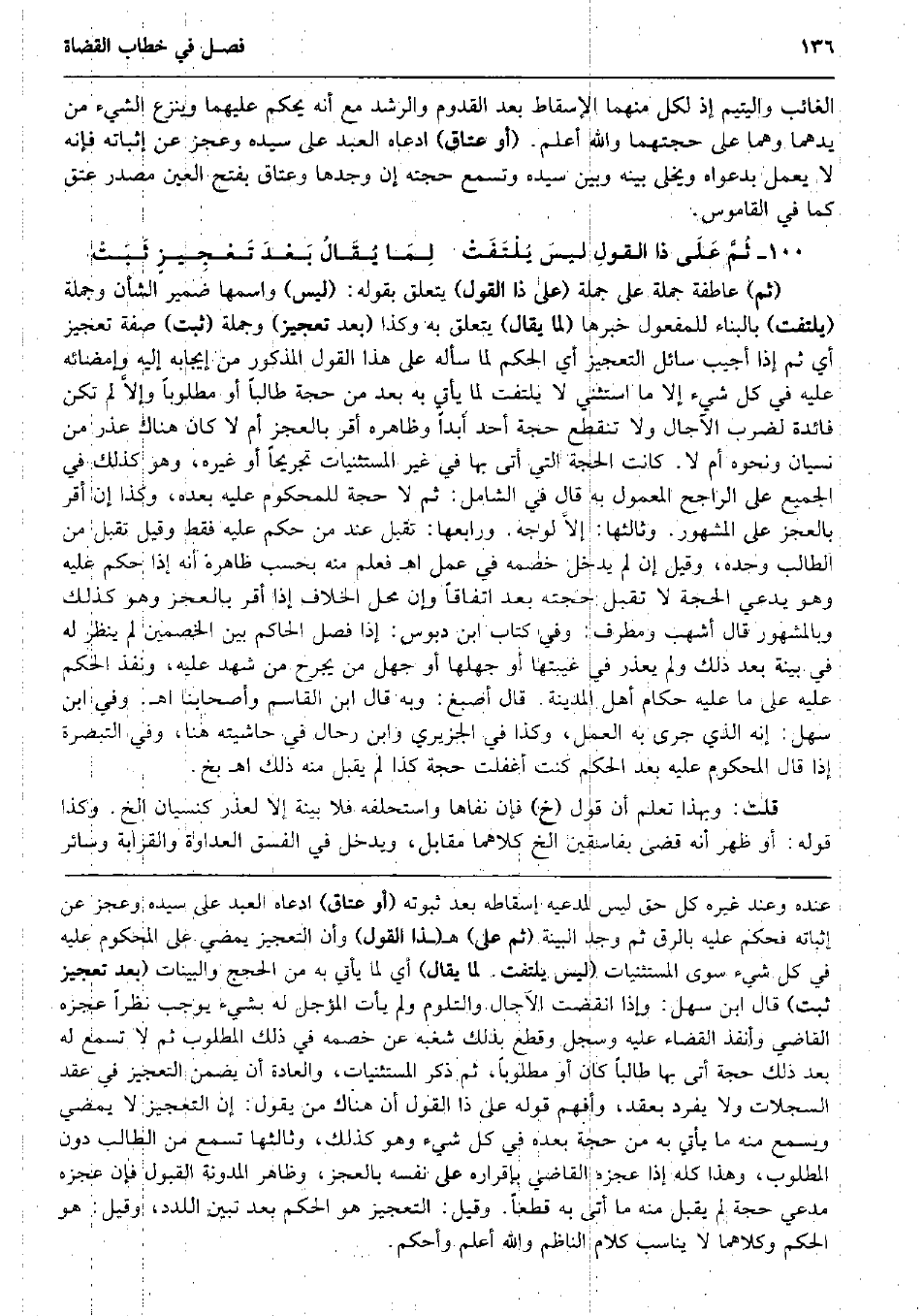 الْغَائِب واليتيم إِذْ لكل مِنْهُمَا الْإِسْقَاط بعد الْقدوم والرشد مَعَ أَنه يحكم عَلَيْهِمَا وَينْزع الشَّيْء من يدهما وهما على حجتهما وَالله أعلم. (أَو عتاق) ادَّعَاهُ العَبْد على سَيّده وَعجز عَن إثْبَاته فَإِنَّهُ لَا يعْمل بِدَعْوَاهُ ويخلى بَينه وَبَين سَيّده وَتسمع حجَّته إِن وجدهَا وعتاق بِفَتْح الْعين مصدر عتق كَمَا فِي الْقَامُوس. ثُمَّ عَلَى ذَا القولِ ليسَ يُلْتَفَتْ لِمَا يُقَالُ بَعْدَ تَعْجِيزٍ ثَبَتْ (ثمَّ) عاطفة جملَة على جملَة (على ذَا القَوْل) يتَعَلَّق بقوله: (لَيْسَ) وَاسْمهَا ضمير الشَّأْن وَجُمْلَة (يلْتَفت) بِالْبِنَاءِ للْمَفْعُول خَبَرهَا (لما يُقَال) يتَعَلَّق بِهِ وَكَذَا (بعد تعجيز) وَجُمْلَة (ثَبت) صفة تعجيز أَي ثمَّ إِذا أُجِيب سَائل التَّعْجِيز أَي الحكم لما سَأَلَهُ على هَذَا القَوْل الْمَذْكُور من إِيجَابه إِلَيْهِ وإمضائه عَلَيْهِ فِي كل شَيْء إِلَّا مَا اسْتثْنِي لَا يلْتَفت لما يَأْتِي بِهِ بعد من حجَّة طَالبا أَو مَطْلُوبا وإلاَّ لم تكن فَائِدَة لضرب الْآجَال وَلَا تَنْقَطِع حجَّة أحد أبدا وَظَاهره أقرّ بِالْعَجزِ أم لَا كَانَ هُنَاكَ عذر من نِسْيَان وَنَحْوه أم لَا. كَانَت الْحجَّة الَّتِي أَتَى بهَا فِي غير المستثنيات تجريحاً أَو غَيره، وَهُوَ كَذَلِك فِي الْجَمِيع على الرَّاجِح الْمَعْمُول بِهِ قَالَ فِي الشَّامِل: ثمَّ لَا حجَّة للمحكوم عَلَيْهِ بعده، وَكَذَا إِن أقرّ بِالْعَجزِ على الْمَشْهُور. وَثَالِثهَا: إلاَّ لوجه. وَرَابِعهَا: تقبل عِنْد من حكم عَلَيْهِ فَقَط وَقيل تقبل من الطَّالِب وَحده، وَقيل إِن لم يدْخل خَصمه فِي عمل اه فَعلم مِنْهُ بِحَسب ظَاهره أَنه إِذا حكم عَلَيْهِ وَهُوَ يَدعِي الْحجَّة لَا تقبل حجَّته بعد اتِّفَاقًا وَإِن مَحل الْخلاف إِذا أقرّ بِالْعَجزِ وَهُوَ كَذَلِك وبالمشهور قَالَ أَشهب ومطرف: وَفِي كتاب ابْن دبوس: إِذا فصل الْحَاكِم بَين الْخَصْمَيْنِ لم ينظر لَهُ فِي بَيِّنَة بعد ذَلِك وَلم يعْذر فِي غيبتها أَو جهلها أَو جهل من يجرح من شهد عَلَيْهِ، وَنفذ الحكم عَلَيْهِ على مَا عَلَيْهِ حكام أهل الْمَدِينَة. قَالَ أصبغ: وَبِه قَالَ ابْن الْقَاسِم وأصحابنا اه. وَفِي ابْن سهل: إِنَّه الَّذِي جرى بِهِ الْعَمَل، وَكَذَا فِي الجزيري وَابْن رحال فِي حَاشِيَته هُنَا، وَفِي التَّبْصِرَة إِذا قَالَ الْمَحْكُوم عَلَيْهِ بعد الحكم كنت أغفلت حجَّة كَذَا لم يقبل مِنْهُ ذَلِك اه بخ. قلت: وَبِهَذَا تعلم أَن قَول (خَ) فَإِن نفاها واستحلفه فَلَا بَيِّنَة إِلَّا لعذر كنسيان الخ. وَكَذَا قَوْله: أَو ظهر أَنه قضى بفاسقين الخ كِلَاهُمَا مُقَابل، وَيدخل فِي الْفسق الْعَدَاوَة والقرابة وَسَائِر