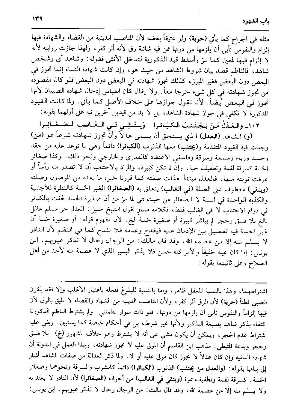 مثله فِي الْجراح كَمَا يَأْتِي (حريَّة) وَلَو عتيقاً بعضه لِأَن المناصب الدِّينِيَّة من الْقَضَاء وَالشَّهَادَة فِيهَا إِلْزَام والنفوس تأبى أَن يلْزمهَا من دونهَا مِمَّن فِيهِ شَائِبَة رق لِأَنَّهُ أثر كفر، وَلِهَذَا جَازَت رِوَايَته لِأَنَّهُ لَا إِلْزَام فِيهَا لمُعين كَمَا مرّ وَأسْقط قيد الذكورية لتدخل الْأُنْثَى فَقَوله: وَشَاهد أَي وشخص شَاهد، فالناظم قصد بَيَان شُرُوط الشَّاهِد من حَيْثُ هُوَ، وَإِن كَانَت شَهَادَة النِّسَاء إِنَّمَا تجوز فِي الْبَعْض دون الْبَعْض فَغير المبرز، كَذَلِك تجوز شَهَادَته فِي الْبَعْض دون الْبَعْض فَلَو كَانَ مَقْصُوده من تجوز شَهَادَته فِي كل شَيْء لخرجا مَعًا. وَلَا يُقَال كَانَ الْقيَاس إِدْخَال شَهَادَة الصّبيان لِأَنَّهَا تجوز فِي الْبَعْض أَيْضا. لأَنا نقُول جَوَازهَا على خلاف الأَصْل كَمَا يَأْتِي. وَلما كَانَت الْقُيُود الْمَذْكُورَة لَا تَكْفِي فِي جَوَاز شَهَادَة الشَّاهِد، بل لَا بُد من قيدين آخَرين نبه على أَولهمَا بقوله: والعَدْلُ مَنْ يَجْتَنِبُ الكَبَائرا وَيتّقِي فِي الغَالبِ الصّغَائِرا (و) الشَّاهِد (الْعدْل) الَّذِي يسْتَحق أَن يُسمى عدلا وَأَن تجوز شَهَادَته شرعا هُوَ (من) وجدت فِيهِ الْقُيُود الْمُتَقَدّمَة و (يجْتَنب) مَعهَا الذُّنُوب (الكبائرا) دَائِما وَهِي مَا توعد عَلَيْهِ من حقد وحسد ورياء وَسُمْعَة وسرقة وفاسقي الإعتقاد كالقدري والخارجي وَنَحْو ذَلِك. وَكَذَا صغائر الخسة كسرقة لقْمَة وتطفيف حَبَّة، وَإِن لم تكن كَبِيرَة، وَالْمرَاد بالاجتناب أَن لَا تصدر مِنْهُ رَأْسا أَو عرفت تَوْبَته مِنْهَا، فالعدل مُبْتَدأ حذفت صفته كَمَا قَررنَا خَبره مَا بعده من الْمَوْصُول وصلته (وَيَتَّقِي) مَعْطُوف على الصِّلَة (فِي الْغَالِب) يتَعَلَّق بِهِ (الصغائرا) الْغَيْر الخسة كالنظرة للأجنبية والكذبة الْوَاحِدَة فِي السّنة لَا الصَّغَائِر من حَيْثُ هِيَ لما مرّ من أَن صَغِيرَة الخسة لحقت بالكبائر فِي دوَام الاجتناب لَا فِي الْغَالِب فَقَط، فَكَلَامه مساوٍ لقَوْل الشَّيْخ خَلِيل: الْعدْل حر مُسلم عَاقل بَالغ بِلَا فسق وَحجر لم يُبَاشر كَبِيرَة أَو صَغِيرَة خسة الخ. لِأَن مَفْهُوم قَوْله: أَو صَغِيرَة خسة أَن غير الخسة فِيهِ تَفْصِيل بَين الإدمان عَلَيْهِ فيقدح وَعَدَمه فَلَا يقْدَح كَمَا فِي النّظم لِأَن النَّادِر لَا يسلم مِنْهُ إِلَّا من عصمه الله، وَقد قَالَ مَالك: من الرِّجَال رجال لَا تذكر عيوبهم. ابْن يُونُس: إِذا كَانَ عَيبه خَفِيفا وَالْأَمر كُله حسن فَلَا يذكر الْيَسِير الَّذِي لَا عصمَة مِنْهُ لأحد من أهل الصّلاح وعَلى ثَانِيهمَا بقوله: