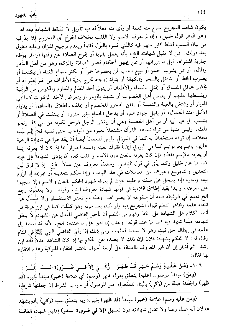 يكون شَاهد التجريح سمع مِنْهُ كلمة أَو رأى مِنْهُ فعلا لَهُ فِيهِ تَأْوِيل لَا تسْقط الشَّهَادَة مَعَه اه. وَهُوَ ظَاهر قَول خَلِيل، وَإِن لم يعرف الِاسْم وَلَا اللقب بِخِلَاف الْجرْح أَي التجريح فَلَا بدّ فِيهِ من بَيَان السَّبَب لغلط كثير مِنْهُم فِيهِ كَالَّذي فسره بالبول قَائِما وبعدم تَرْجِيح الْمِيزَان وَعَلِيهِ فَتَقول بعد قَوْلك: مِمَّن لَا تقبل شَهَادَته الخ، بِأَنَّهُ يعْمل بالربا أَو يخرج الصَّلَاة عَن وَقتهَا أَو أقرّ بِوَطْء جَارِيَة اشْتَرَاهَا قبل استبرائها أَو مِمَّن يجهل أَحْكَام قصر الصَّلَاة وَالزَّكَاة وَهُوَ من أهل السّفر وَالْمَال، أَو مِمَّن يشرب الْخمر أَو يَبِيع الْعِنَب لمن يعصرها خمرًا أَو يكثر سَماع الْغناء أَو يكذب أَو يضْرب الْخط أَو يشْتَغل بِالسحرِ وَالْكهَانَة أَو يتْرك زَوجته تخرج بادية الْأَطْرَاف من غير عذر لَهُ أَو يحضر محافل الْفُسَّاق أَو يختلي بِالنسَاء والأطفال أَو يتَوَلَّى أَخذ الْمَظَالِم والمغارم والمكوس من الرّعية ويقسطها عَلَيْهِم أَو يُعَامل أهل الغصوب أَو يشْهد بالزور أَو يتَعَرَّض لأخذ الزكوات كَمَا فِي المعيار أَو يشْتَغل بالغيبة والنميمة أَو يلقن الْفُجُور للخصوم أَو يحلف بِالطَّلَاق وَالْعتاق، أَو يدوام الْأكل عِنْد الْعمَّال، أَو يقبل جوائزهم، أَو يدْخل الْحمام بِغَيْر مئزر، أَو يلْتَفت فِي الصَّلَاة أَو ينتسب إِلَى غير أَبِيه أَو من أهل العصبية وَهِي أَن يبغض الرجل الرجل لكَونه من بني كَذَا وَنَحْو ذَلِك، وَلَيْسَ مِنْهَا من ترك تعاهد الْقُرْآن مشتغلاً بِغَيْرِهِ من الْوَاجِب حَتَّى نَسيَه فَلَا إِثْم عَلَيْهِ بِخِلَاف إِن تَركه اسْتِخْفَافًا بِهِ كَمَا فِي الْبُرْزُليّ وَلَيْسَ للعمال أَيْضا أَن يقدحوا فِي شَهَادَة الرّعية عَلَيْهِم بِأَنَّهُم يغرمونهم كَمَا فِي الْبُرْزُليّ أَيْضا فقولنا بِعَيْنِه واسْمه احْتِرَازًا مِمَّا إِذا كَانَ لَا يعرفهُ بهما أَو يعرفهُ بالإسم فَقَط، فَإِن كَانَ يعرفهُ بِالْعينِ دون الِاسْم واللقب كَفاهُ أَن يُؤَدِّي الشَّهَادَة على عينه كَمَا مرَّ عَن خَلِيل وكما يَأْتِي فِي قَول النَّاظِم: ومطلقاً مَعْرُوف عين عدلا. الخ. إِذْ لَا فرق بَين التَّعْدِيل وَالتَّجْرِيح وَغَيرهمَا من الْمُعَامَلَات فِي هَذَا الْبَاب، وَإِذا حكم بتعديله أَو تجريحه أَو لُزُوم بَيْعه وَنَحْوه فَإِنَّهُ يسجل على صفته وحليته حَيْثُ لم يعرفهُ شُهُود الحكم بِالْعينِ وَالِاسْم وَإِلَّا سجلوا على مَعْرفَته، وَبِهَذَا يُقيد إِطْلَاق اللامية فِي قَوْلهَا شَهَادَة مَعْرُوف الخ، وَقَوْلنَا: وَلَا يعلمونه رَجَعَ الخ تقدم فِي الْوَثِيقَة قبله أَن سُقُوطه لَا يضر اه. وَهَذَا مَعَ تعذر الاستفسار وَإِلَّا فَيسْأَل عَن انْتِفَاء علمه وَظَاهر النّظم قبُول التجريح فِيهِ وَلَو أثْبته بعد مَوته وَهُوَ كَذَلِك كَمَا فِي ابْن عَرَفَة فِي أثْنَاء الْكَلَام على الشَّهَادَة على الْخط وَفهم من النّظم أَن تَأْخِير القَاضِي للعدل عَن الشَّهَادَة لَا يبطل شَهَادَته فِيمَا شهد فِيهِ كَمَا مرّ عِنْد قَوْله: وَعدل إِن أدّى على مَا عِنْده. الخ. لِأَنَّهُ قد اسْتندَ إِلَى علمه فِي إبِْطَال حق ثَبت وَهُوَ لَا يسْتَند لعلمه، وَمن ذَلِك إِذا رأى القَاضِي النَّبِي صلى الله عَلَيْهِ وَسلم فِي الْمَنَام وَقَالَ لَهُ: لَا تحكم بِشَهَادَة فلَان فَإِن ذَلِك لَا يصده عَن الحكم بهَا إِذا كَانَ الشَّاهِد عدلا قَالَه ابْن رشد. ثمَّ أَشَارَ إِلَى أَن غير الْمَعْرُوف بِالْعَدَالَةِ على أَرْبَعَة أَحْوَال بِاعْتِبَار افتقاره للتزكية وَعدم افتقاره لَهَا فَقَالَ: وَمَنْ عَلْيهِ وَسْمُ خيْرٍ قَدْ ظَهَرْ زُكِّيَ إلاَّ فِي ضَرُورَةِ السَّفَرْ (وَمن) مُبْتَدأ مَوْصُول (عَلَيْهِ) يتَعَلَّق بقوله ظهر (وسم) أَي عَلامَة (خير) مُبْتَدأ خَبره (قد ظهر) وَالْجُمْلَة صلَة من (زكي) بِالْبِنَاءِ للْمَفْعُول 