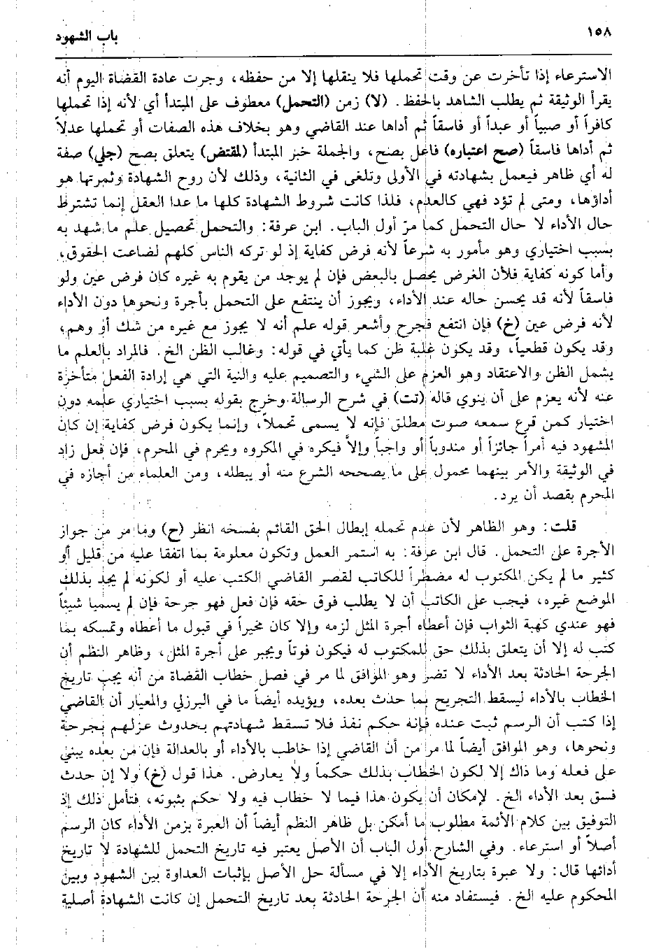 الاسترعاء إِذا تَأَخَّرت عَن وَقت تحملهَا فَلَا ينقلها إِلَّا من حفظه، وَجَرت عَادَة الْقُضَاة الْيَوْم أَنه يقْرَأ الْوَثِيقَة ثمَّ يطْلب الشَّاهِد بِالْحِفْظِ. (لَا) زمن (التَّحَمُّل) مَعْطُوف على الْمُبْتَدَأ أَي لِأَنَّهُ إِذا تحملهَا كَافِرًا أَو صَبيا أَو عبدا أَو فَاسِقًا ثمَّ أَدَّاهَا عِنْد القَاضِي وَهُوَ بِخِلَاف هَذِه الصِّفَات أَو تحملهَا عدلا ثمَّ أَدَّاهَا فَاسِقًا (صَحَّ اعْتِبَاره) فَاعل بصح، وَالْجُمْلَة خبر الْمُبْتَدَأ (لمقتض) يتَعَلَّق بصح (جلي) صفة لَهُ أَي ظَاهر فَيعْمل بِشَهَادَتِهِ فِي الأولى وتلغى فِي الثَّانِيَة وَذَلِكَ لِأَن روح الشَّهَادَة وثمرتها هُوَ أَدَاؤُهَا، وَمَتى لم تُؤَد فَهِيَ كَالْعدمِ، فَلِذَا كَانَت شُرُوط الشَّهَادَة كلهَا مَا عدا الْعقل إِنَّمَا تشْتَرط حَال الْأَدَاء لَا حَال التَّحَمُّل كَمَا مرّ أول الْبَاب. ابْن عَرَفَة: والتحمل تَحْصِيل علم مَا شهد بِهِ بِسَبَب اخْتِيَاري وَهُوَ مَأْمُور بِهِ شرعا لِأَنَّهُ فرض كِفَايَة إِذْ لَو تَركه النَّاس كلهم لضاعت الْحُقُوق، وَأما كَونه كِفَايَة فَلِأَن الْغَرَض يحصل بِالْبَعْضِ فَإِن لم يُوجد من يقوم بِهِ غَيره كَانَ فرض عين وَلَو فَاسِقًا لِأَنَّهُ قد يحسن حَاله عِنْد الْأَدَاء، وَيجوز أَن ينْتَفع على التَّحَمُّل بِأُجْرَة وَنَحْوهَا دون الْأَدَاء لِأَنَّهُ فرض عين (خَ) فَإِن انْتفع فجرح وأشعر قَوْله علم أَنه لَا يجوز مَعَ غَيره من شكّ أَو وهم، وَقد يكون قَطْعِيا، وَقد يكون غَلَبَة ظن كَمَا يَأْتِي فِي قَوْله: وغالب الظَّن الخ. فَالْمُرَاد بِالْعلمِ مَا يَشْمَل الظَّن والاعتقاد وَهُوَ الْعَزْم على الشَّيْء والتصميم عَلَيْهِ وَالنِّيَّة الَّتِي هِيَ إِرَادَة الْفِعْل مُتَأَخِّرَة عَنهُ لِأَنَّهُ يعزم على أَن يَنْوِي قَالَه (تت) فِي شرح الرسَالَة وَخرج بقوله بِسَبَب اخْتِيَاري علمه دون اخْتِيَار كمن قرع سَمعه صَوت مُطلق فَإِنَّهُ لَا يُسمى تحملاً، وَإِنَّمَا يكون فرض كِفَايَة إِن كَانَ الْمَشْهُود فِيهِ أمرا جَائِزا أَو مَنْدُوبًا أَو وَاجِبا وإلاَّ فَيكْرَه فِي الْمَكْرُوه وَيحرم فِي الْمحرم، فَإِن فعل زَاد فِي الْوَثِيقَة وَالْأَمر بَينهمَا مَحْمُول على مَا يُصَحِّحهُ الشَّرْع مِنْهُ أَو يُبطلهُ، وَمن الْعلمَاء من أجَازه فِي الْمحرم بِقصد أَن يرد. قلت: وَهُوَ الظَّاهِر لِأَن عدم تحمله إبِْطَال الْحق الْقَائِم بفسخه انْظُر (ح) وَمَا مر من جَوَاز الْأُجْرَة على التَّحَمُّل. قَالَ ابْن عَرَفَة: بِهِ اسْتمرّ الْعَمَل وَتَكون مَعْلُومَة بِمَا اتفقَا عَلَيْهِ من قَلِيل أَو كثير مَا لم يكن الْمَكْتُوب لَهُ مُضْطَرّا لِلْكَاتِبِ لقصر القَاضِي الْكتب عَلَيْهِ أَو لكَونه لم يجد بذلك الْموضع غَيره، فَيجب على الْكَاتِب أَن لَا يطْلب فَوق حَقه فَإِن فعل فَهُوَ جرحة فَإِن لم يسميا شَيْئا فَهُوَ عِنْدِي كَهِبَة الثَّوَاب فَإِن أعطَاهُ أُجْرَة الْمثل لزمَه وَإِلَّا كَانَ مُخَيّرا فِي قبُول مَا أعطَاهُ وتمسكه بِمَا كتب لَهُ إِلَّا أَن يتَعَلَّق بذلك حق للمكتوب لَهُ فَيكون فوتاً وَيجْبر على أُجْرَة الْمثل، وَظَاهر النّظم أَن الجرحة الْحَادِثَة بعد الْأَدَاء لَا تضر وَهُوَ الْمُوَافق لما مر فِي فصل خطاب الْقُضَاة من أَنه يجب تَارِيخ الْخطاب بِالْأَدَاءِ ليسقط التجريح بِمَا حدث بعده، وَيُؤَيِّدهُ أَيْضا مَا فِي الْبُرْزُليّ والمعيار أَن القَاضِي إِذا كتب أَن الرَّسْم ثَبت عِنْده فَإِنَّهُ حكم نفذ فَلَا تسْقط شَهَادَتهم بحدوث عزلهم بجرحة وَنَحْوهَا، وَهُوَ الْمُوَافق أَيْضا لما مر من أَن القَاضِي إِذا خَاطب بِالْأَدَاءِ أَو بِالْعَدَالَةِ فَإِن من بعده يَبْنِي على فعله وَمَا ذَاك إِلَّا لكَون الْخطاب بذلك حكما وَلَا يُعَارض. هَذَا قَول (خَ) وَلَا إِن حدث فسق بعد الْأَدَاء الخ. لِإِمْكَان أَن يكون هَذَا فِيمَا لَا خطاب فِيهِ وَلَ