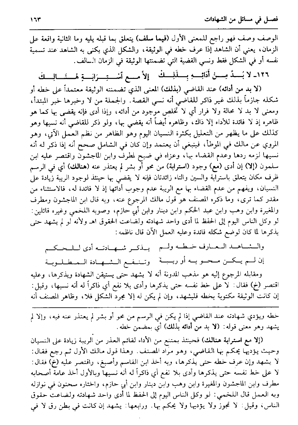 الْوَصْف وصف فَهُوَ رَاجع للمعنى الأول (فِيمَا سلف) يتَعَلَّق بِمَا قبله يَلِيهِ وَمَا الثَّانِيَة وَاقعَة على الزَّمَان، يَعْنِي أَن الشَّاهِد إِذا عرف خطه فِي الْوَثِيقَة، والشكل الَّذِي يكنى بِهِ الشَّاهِد عِنْد تَسْمِيَة نَفسه أَو فِي الشكل فَقَط وَنسي الْقَضِيَّة الَّتِي تضمنتها الْوَثِيقَة فِي الزَّمَان السالف. لَا بُدَّ مِنْ أَدَائِهِ بِذَلِكْ إلاَّ مَعَ اسْتِرَابَةٍ هُنَالِكَ (لَا بُد من أَدَائِهِ) عِنْد القَاضِي (بذلك) الْمَعْنى الَّذِي تضمنته الْوَثِيقَة مُعْتَمدًا على خطه أَو شكله جَازِمًا بذلك غير ذَاكر للْقَاضِي أَنه نسي الْقِصَّة. وَالْجُمْلَة من لَا وخبرها خبر الْمُبْتَدَأ، وَمعنى لَا بُد لَا محَالة وَلَا فرار أَي لَا تخلص مَوْجُود من أَدَائِهِ، وَإِذا أدّى فَإِنَّهُ يقْضى بهَا كَمَا هُوَ ظَاهره إِذْ لَا فَائِدَة للْأَدَاء إِلَّا ذَاك، وَظَاهره أَيْضا أَنه يقْضِي بهَا، وَلَو ذكر للْقَاضِي أَنه نَسِيَهَا وَهُوَ كَذَلِك على مَا يظْهر من التَّعْلِيل بِكَثْرَة النسْيَان الْيَوْم وَهُوَ الظَّاهِر من نظم الْعَمَل الْآتِي، وَهُوَ الْمَرْوِيّ عَن مَالك فِي الْمُوَطَّأ، فَيَنْبَغِي أَن يعْتَمد وَإِن كَانَ فِي الشَّامِل صحّح أَنه إِذا ذكر لَهُ أَنه نَسِيَهَا لزمَه ردهَا وَعدم الْقَضَاء بهَا، وَعَزاهُ فِي ضيح لمطرف وَابْن الْمَاجشون وَاقْتصر عَلَيْهِ ابْن سَلمُون (إِلَّا) إِن أدّى (مَعَ) وجود (استرابة) من محو أَو بشر لم يعْتَذر عَنهُ (هُنَالك) أَي فِي الرَّسْم ظرف مَكَان يتَعَلَّق باسترابة وَالسِّين وَالتَّاء زائدتان فَإِنَّهُ لَا يقْضِي بهَا حِينَئِذٍ لوُجُود الرِّيبَة زِيَادَة على النسْيَان، وَيفهم من عدم الْقَضَاء بهَا مَعَ الرِّيبَة عدم وجوب أَدَائِهَا إِذْ لَا فَائِدَة لَهُ، فالاستثناء من مُقَدّر كَمَا ترى، وَمَا ذكره المُصَنّف هُوَ قَول مَالك المرجوع عَنهُ، وَبِه قَالَ ابْن الْمَاجشون ومطرف والمغيرة وَابْن وهب وَابْن عبد الحكم وَابْن دِينَار وَابْن أبي حَازِم، وَصَوَّبَهُ اللَّخْمِيّ وَغَيره قائلين: لَو وكل النَّاس الْيَوْم إِلَى الْحِفْظ لما أدّى وَاحِد شَهَادَته ولضاعت الْحُقُوق اه وَلِأَنَّهُ لَو لم يشْهد حَتَّى يذكرهَا لما كَانَ لوضع شكله فَائِدَة وَعَلِيهِ الْعَمَل الْآن قَالَ ناظمه: وَالشَّاهِد الْعَارِف خطه وَلم يذكر شَهَادَته أدّى للْحكم إِن لم يكن محو بِهِ أَو رِيبَة وَتَنْفَع الشَّهَادَة الْمَطْلُوبَة وَمُقَابِله المرجوع إِلَيْهِ هُوَ مَذْهَب الْمُدَوَّنَة أَنه لَا يشْهد حَتَّى يستيقن الشَّهَادَة ويذكرها، وَعَلِيهِ اقْتصر (خَ) فَقَالَ: لَا على خطّ نَفسه حَتَّى يذكرهَا وَأدّى بِلَا نفع أَي ذَاكِرًا لَهُ أَنه نَسِيَهَا، وَقيل: إِن كَانَت الْوَثِيقَة مَكْتُوبَة بِخَطِّهِ فليشهد، وَإِن لم يكن لَهُ إِلَّا مُجَرّد الشكل فَلَا، وَظَاهر المُصَنّف أَنه