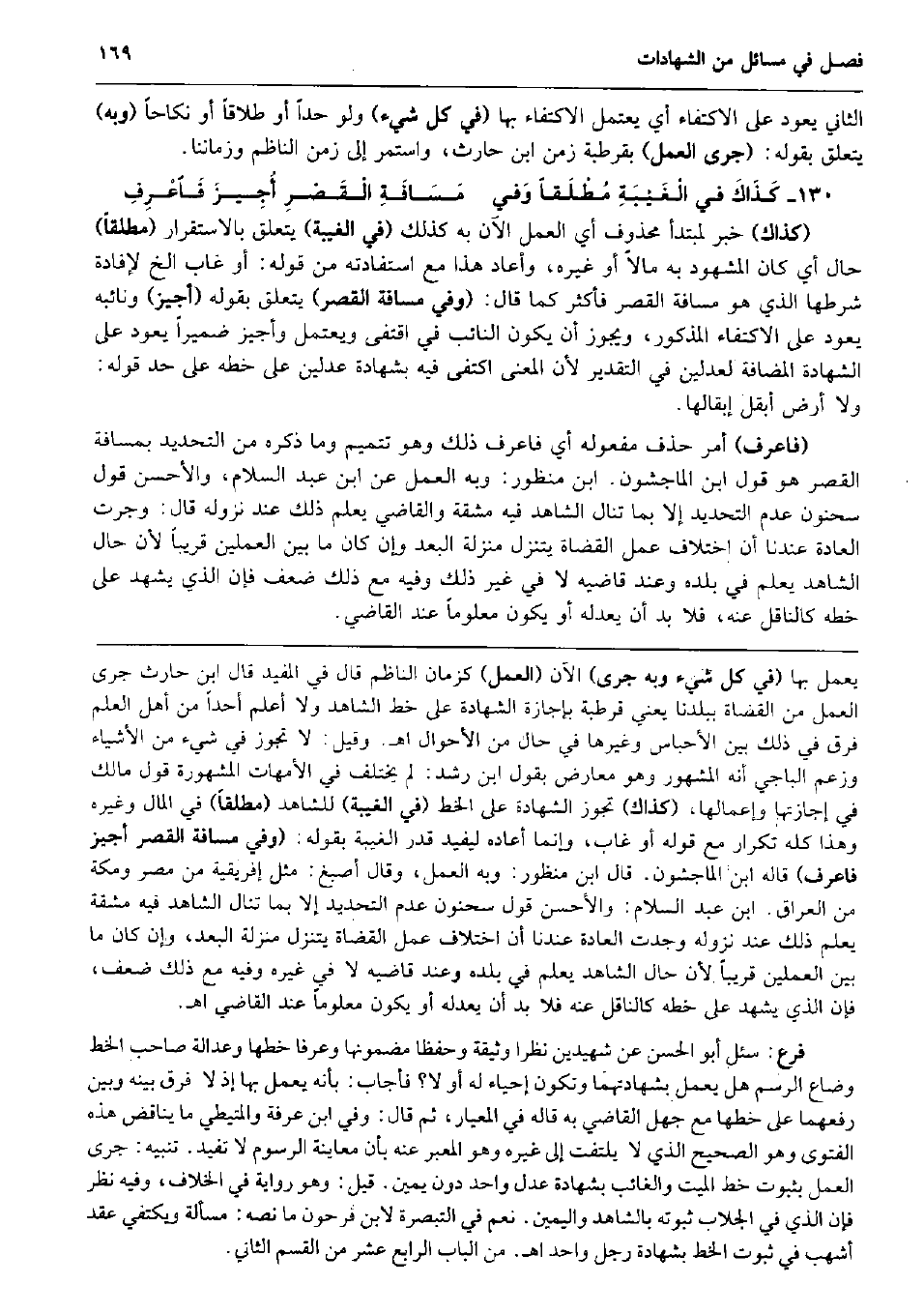الثَّانِي يعود على الِاكْتِفَاء أَي يعتمل الِاكْتِفَاء بهَا (فِي كل شَيْء) وَلَو حدا أَو طَلَاقا أَو نِكَاحا (وَبِه) يتَعَلَّق بقوله: (جرى الْعَمَل) بقرطبة زمن ابْن حَارِث، وَاسْتمرّ إِلَى زمن النَّاظِم وزماننا. كَذَاكَ فِي الْغَيْبَةِ مُطْلَقاً وَفي مَسَافَةِ الْقَصْرِ أُجِيزَ فَاعْرِفِ (كَذَاك) خبر لمبتدأ مَحْذُوف أَي الْعَمَل الْآن بِهِ كَذَلِك (فِي الْغَيْبَة) يتَعَلَّق بالاستقرار (مُطلقًا) حَال أَي كَانَ الْمَشْهُود بِهِ مَالا أَو غَيره، وَأعَاد هَذَا مَعَ استفادته من قَوْله: أَو غَابَ الخ لإِفَادَة شَرطهَا الَّذِي هُوَ مَسَافَة الْقصر فَأكْثر كَمَا قَالَ: (وَفِي مَسَافَة الْقصر) يتَعَلَّق بقوله (أُجِيز) ونائبه يعود على الِاكْتِفَاء الْمَذْكُور، وَيجوز أَن يكون النَّائِب فِي اقتفى ويعتمل وأجيز ضميراً يعود على الشَّهَادَة المضافة لعدلين فِي التَّقْدِير لِأَن الْمَعْنى اكْتفى فِيهِ بِشَهَادَة عَدْلَيْنِ على خطه على حد قَوْله: وَلَا أَرض أبقل إبقالها. (فاعرف) أَمر حذف مَفْعُوله أَي فاعرف ذَلِك وَهُوَ تتميم وَمَا ذكره من التَّحْدِيد بمسافة الْقصر هُوَ قَول ابْن الْمَاجشون. ابْن مَنْظُور: وَبِه الْعَمَل عَن ابْن عبد السَّلَام، وَالْأَحْسَن قَول سَحْنُون عدم التَّحْدِيد إِلَّا بِمَا تنَال الشَّاهِد فِيهِ مشقة وَالْقَاضِي يعلم ذَلِك عِنْد نُزُوله قَالَ: وَجَرت الْعَادة عندنَا أَن اخْتِلَاف عمل الْقُضَاة يتنزل منزلَة الْبعد وَإِن كَانَ مَا بَين العملين قَرِيبا لِأَن حَال الشَّاهِد يعلم فِي بَلَده وَعند قاضيه لَا فِي غير ذَلِك وَفِيه مَعَ ذَلِك ضعف فَإِن الَّذِي يشْهد على خطه كالناقل عَنهُ، فَلَا بُد أَن يعدله أَو يكون مَعْلُوما عِنْد القَاضِي.