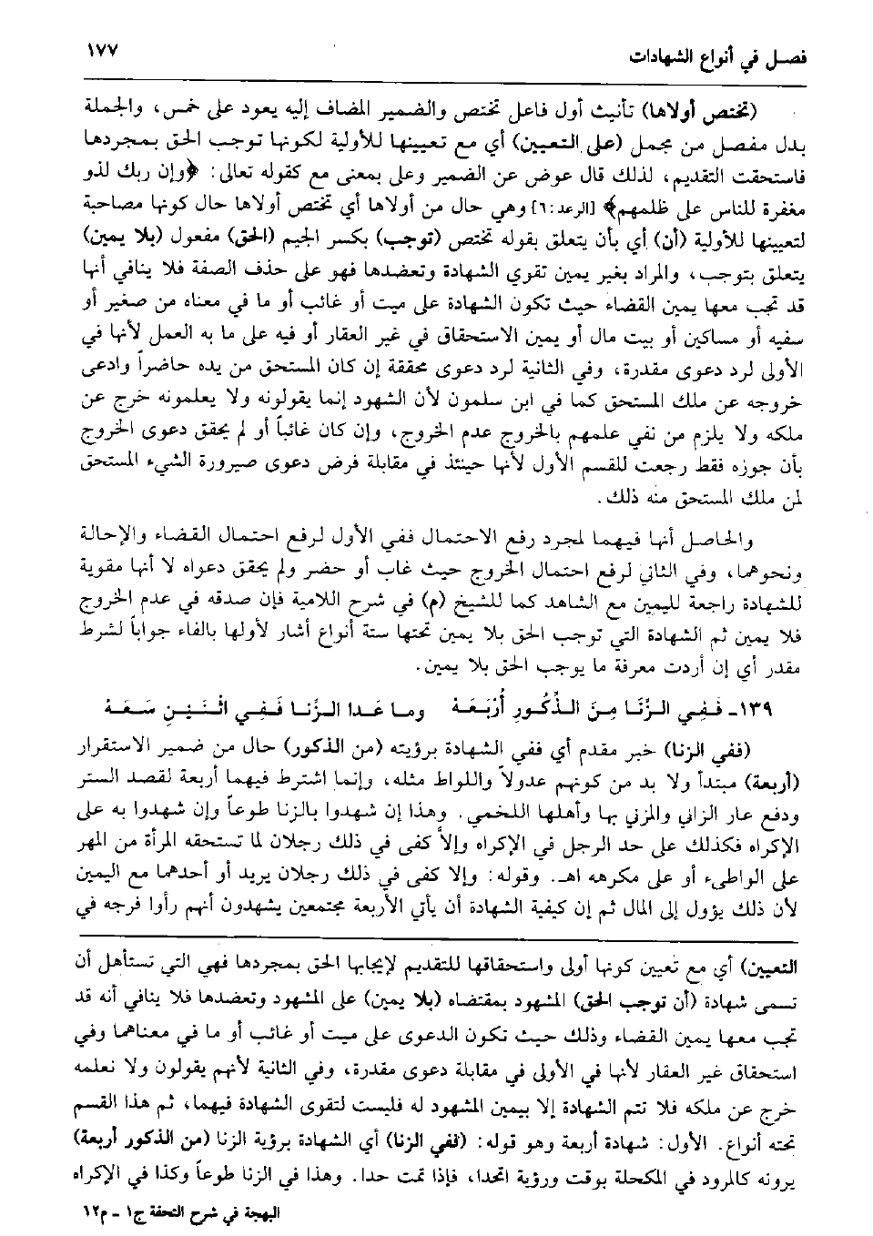 (تخْتَص أولاها) تَأْنِيث أول فَاعل تخْتَص وَالضَّمِير الْمُضَاف إِلَيْهِ يعود على خمس، وَالْجُمْلَة بدل مفصل من مُجمل (على التَّعْيِين) أَي مَعَ تَعْيِينهَا للأولية لكَونهَا توجب الْحق بمجردها فاستحقت التَّقْدِيم، لذَلِك قَالَ عوض عَن الضَّمِير وعَلى بِمَعْنى مَعَ كَقَوْلِه تَعَالَى: وَإِن رَبك لذُو مغْفرَة للنَّاس على ظلمهم} (الرَّعْد: 6) وَهِي حَال من أولاها أَي تخْتَص أولاها حَال كَونهَا مصاحبة لتعيينها للأولية (أَن) أَي بِأَن يتَعَلَّق بقوله تخْتَص (توجب) بِكَسْر الْجِيم (الْحق) مفعول (بِلَا يَمِين) يتَعَلَّق بتوجب، وَالْمرَاد بِغَيْر يَمِين تقَوِّي الشَّهَادَة وتعضدها فَهُوَ على حذف الصّفة فَلَا يُنَافِي أَنَّهَا قد تجب مَعهَا يَمِين الْقَضَاء حَيْثُ تكون الشَّهَادَة على ميت أَو غَائِب أَو مَا فِي مَعْنَاهُ من صَغِير أَو سَفِيه أَو مَسَاكِين أَو بَيت مَال أَو يَمِين الِاسْتِحْقَاق فِي غير الْعقار أَو فِيهِ على مَا بِهِ الْعَمَل لِأَنَّهَا فِي الأولى لرد دَعْوَى مقدرَة، وَفِي الثَّانِيَة لرد دَعْوَى مُحَققَة إِن كَانَ الْمُسْتَحق من يَده حَاضرا وَادّعى خُرُوجه عَن ملك الْمُسْتَحق كَمَا فِي ابْن سَلمُون لِأَن الشُّهُود إِنَّمَا يَقُولُونَهُ وَلَا يعلمونه خرج عَن ملكه وَلَا يلْزم من نفي علمهمْ بِالْخرُوجِ عدم الْخُرُوج، وَإِن كَانَ غَائِبا أَو لم يُحَقّق دَعْوَى الْخُرُوج بِأَن جوزه فَقَط رجعت للقسم الأول لِأَنَّهَا حِينَئِذٍ فِي مُقَابلَة فرض دَعْوَى صيرورة الشَّيْء الْمُسْتَحق لمن ملك الْمُسْتَحق مِنْهُ ذَلِك. وَالْحَاصِل أَنَّهَا فيهمَا لمُجَرّد رفع الِاحْتِمَال فَفِي الأول لرفع احْتِمَال الْقَضَاء والإحالة وَنَحْوهمَا، وَفِي الثَّانِي لرفع احْتِمَال الْخُرُوج حَيْثُ غَابَ أَو حضر وَلم يُحَقّق دَعْوَاهُ لَا أَنَّهَا مقوية للشَّهَادَة رَاجِعَة للْيَمِين مَعَ الشَّاهِد كَمَا للشَّيْخ (م) فِي شرح اللامية فَإِن صدقه فِي عدم الْخُرُوج فَلَا يَمِين ثمَّ الشَّهَادَة الَّتِي توجب الْحق بِلَا يَمِين تحتهَا سِتَّة أَنْوَاع أَشَارَ لأولها بِالْفَاءِ جَوَابا لشرط مُقَدّر أَي إِن أردْت معرفَة مَا يُوجب الْحق بِلَا يَمِين. فَفِي الزِّنَا مِنَ الذِّكُورِ أُرْبَعَهْ وَمَا عَدا الزِّنا فَفِي اثْنَيْنِ سَعَهْ (فَفِي الزِّنَا) خبر مقدم أَي فَفِي الشَّهَادَة بِرُؤْيَتِهِ (من الذُّكُور) حَال من ضمير الِاسْتِقْرَار (أَرْبَعَة) مُبْتَدأ وَلَا بُد من كَونهم عُدُولًا واللواط مثله، وَإِنَّمَا اشْترط فيهمَا أَرْبَعَة لقصد السّتْر وَدفع عَار الزَّانِي والمزني بهَا وَأَهْلهَا اللَّخْمِيّ. وَهَذَا إِن شهدُوا بِالزِّنَا طَوْعًا وَإِن شهدُوا بِهِ على الْإِكْرَاه فَكَذَلِك على حد الرجل فِي الْإِكْرَاه وإلاَّ كفى فِي ذَلِك رجلَانِ لما تستحقه الْمَرْأَة من الْمهْر على الواطىء أَو على مكرهه اه. وَقَوله: وَإِلَّا كفى فِي ذَلِك رجلَانِ يُرِيد أَو أَحدهمَا مَعَ الْيَمين لِأَن ذَلِك يؤول إِلَى المَال ثمَّ إِن كَيْفيَّة الشَّهَادَة أَن يَأْتِي الْأَرْبَعَة مُجْتَمعين يشْهدُونَ أَنهم رَأَوْا فرجه فِي