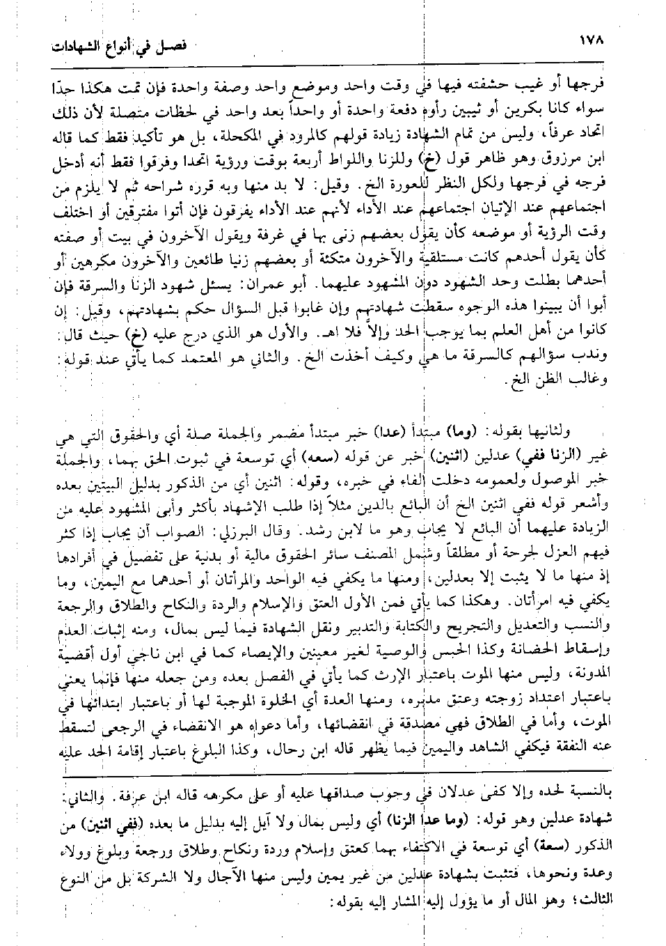 فرجهَا أَو غيب حشفته فِيهَا فِي وَقت وَاحِد وَمَوْضِع وَاحِد وَصفَة وَاحِدَة فَإِن تمت هَكَذَا حدّا سَوَاء كَانَا بكرين أَو ثيبين رَأَوْهُ دفْعَة وَاحِدَة أَو وَاحِدًا بعد وَاحِد فِي لحظات مُتَّصِلَة لِأَن ذَلِك اتِّحَاد عرفا وَلَيْسَ من تَمام الشَّهَادَة زِيَادَة قَوْلهم كالمرود فِي المكحلة، بل هُوَ تَأْكِيد فَقَط كَمَا قَالَه ابْن مَرْزُوق وَهُوَ ظَاهر قَول (خَ) وللزنا واللواط أَرْبَعَة بِوَقْت ورؤية اتحدا وَفرقُوا فَقَط أَنه أَدخل فرجه فِي فرجهَا وَلكُل النّظر للعورة الخ. وَقيل: لَا بُد مِنْهَا وَبِه قَرَّرَهُ شراحه ثمَّ لَا يلْزم من اجْتِمَاعهم عِنْد الْإِتْيَان اجْتِمَاعهم عِنْد الْأَدَاء لأَنهم عِنْد الْأَدَاء يفرقون فَإِن أَتَوا مفترقين أَو اخْتلف وَقت الرُّؤْيَة أَو مَوْضِعه كَأَن يَقُول بَعضهم زنى بهَا فِي غرفَة وَيَقُول الْآخرُونَ فِي بَيت أَو صفته كَأَن يَقُول أحدهم كَانَت مستلقية وَالْآخرُونَ متكئة أَو بَعضهم زَنَيَا طائعين وَالْآخرُونَ مكرهين أَو أَحدهمَا بطلت وحد الشُّهُود دون الْمَشْهُود عَلَيْهِمَا. أَبُو عمرَان: يسئل شُهُود الزِّنَا وَالسَّرِقَة فَإِن أَبَوا أَن يبينوا هَذِه الْوُجُوه سَقَطت شَهَادَتهم وَإِن غَابُوا قبل السُّؤَال حكم بِشَهَادَتِهِم، وَقيل: إِن كَانُوا من أهل الْعلم بِمَا يُوجب الْحَد وإلاَّ فَلَا اه. وَالْأول هُوَ الَّذِي درج عَلَيْهِ (خَ) حَيْثُ قَالَ: وَندب سُؤَالهمْ كالسرقة مَا هِيَ وَكَيف أخذت الخ. وَالثَّانِي هُوَ الْمُعْتَمد كَمَا يَأْتِي عِنْد قَوْله: وغالب الظَّن الخ. ولثانيها بقوله: (وَمَا) مُبْتَدأ (عدا) خبر مُبْتَدأ مُضْمر وَالْجُمْلَة صلَة أَي والحقوق الَّتِي هِيَ غير (الزِّنَا فَفِي) عَدْلَيْنِ (اثْنَيْنِ) خبر عَن قَوْله (سعه) أَي توسعة فِي ثُبُوت الْحق بهما، وَالْجُمْلَة خبر الْمَوْصُول ولعمومه دخلت الْفَاء فِي خَبره، وَقَوله: اثْنَيْنِ أَي من الذُّكُور بِدَلِيل الْبَيْتَيْنِ بعده وأشعر قَوْله فَفِي اثْنَيْنِ الخ أَن البَائِع بِالدّينِ مثلا إِذا طلب الْإِشْهَاد بِأَكْثَرَ وأبى الْمَشْهُود عَلَيْهِ من الزِّيَادَة عَلَيْهِمَا أَن البَائِع لَا يُجَاب وَهُوَ مَا لِابْنِ رشد. وَقَالَ الْبُرْزُليّ: الصَّوَاب أَن يُجَاب إِذا كثر فيهم الْعَزْل لجرحة أَو مُطلقًا وَشَمل المُصَنّف سَائِر الْحُقُوق مَالِيَّة أَو بدنية على تَفْصِيل فِي أفرادها إِذْ مِنْهَا مَا لَا يثبت إِلَّا بعدلين، وَمِنْهَا مَا يَكْفِي فِيهِ الْوَاحِد والمرأتان أَو أَحدهمَا مَعَ الْيَمين، وَمَا يَكْفِي فِيهِ امْرَأَتَانِ. وَهَكَذَا كَمَا يَأْتِي فَمن الأول الْعتْق وَالْإِسْلَام وَالرِّدَّة وَالنِّكَاح وَالطَّلَاق وَالرَّجْعَة وَالنّسب وَالتَّعْدِيل وَالتَّجْرِيح وَالْكِتَابَة وَالتَّدْبِير وَنقل الشَّهَادَة فِيمَا لَيْسَ بِمَال، وَمِنْه إِثْبَات الْعَدَم وَإِسْقَاط الْحَضَانَة وَكَذَا الْحَبْس وَالْوَصِيَّة لغير مُعينين والإيصاء كَمَا فِي ابْن نَاجِي أول أقضية الْمُدَوَّنَة، وَلَيْسَ مِنْهَا الْمَوْت بِاعْتِبَار الْإِرْث كَمَا يَأْتِي فِي الْفَصْل بعده وَمن جعله مِنْهَا فَإِنَّمَا يَعْنِي بِاعْتِبَار اعْتِدَاد زَوجته وَعتق مدبره، وَمِنْهَا الْعدة أَي الْخلْوَة الْمُوجبَة لَهَا أَو بِاعْتِبَار ابتدائها فِي الْمَوْت، وَأما فِي الطَّلَاق فَهِيَ مصدقة فِي انْقِضَائِهَا، وَأما دَعْوَاهُ هُوَ الِانْقِضَاء فِي الرجعى لتسقط عَنهُ النَّفَقَة فَيَكْفِي الشَّاهِد وَالْيَمِين فِيمَا يظْهر قَالَه ابْن رحال، وَكَذَا الْبلُوغ بِاعْتِبَار إِقَامَة الْحَد عَلَيْهِ