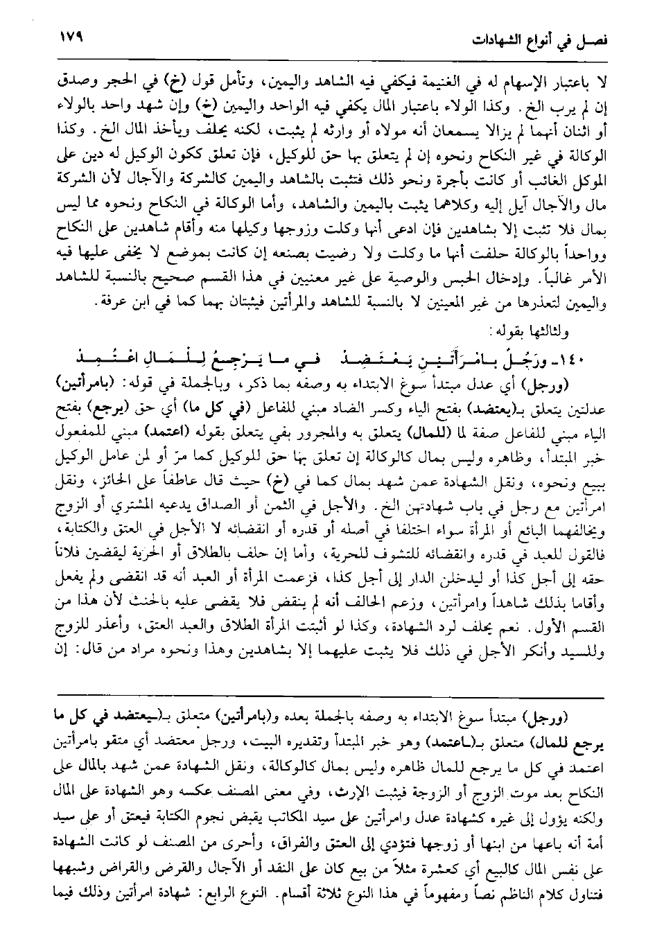 لَا بِاعْتِبَار الإسهام لَهُ فِي الْغَنِيمَة فَيَكْفِي فِيهِ الشَّاهِد وَالْيَمِين، وَتَأمل قَول (خَ) فِي الْحجر وَصدق إِن لم يرب الخ. وَكَذَا الْوَلَاء بِاعْتِبَار المَال يَكْفِي فِيهِ الْوَاحِد وَالْيَمِين (خَ) وَإِن شهد وَاحِد بِالْوَلَاءِ أَو اثْنَان أَنَّهُمَا لم يَزَالَا يسمعان أَنه مَوْلَاهُ أَو وَارثه لم يثبت، لكنه يحلف وَيَأْخُذ المَال الخ. وَكَذَا الْوكَالَة فِي غير النِّكَاح وَنَحْوه إِن لم يتَعَلَّق بهَا حق للْوَكِيل، فَإِن تعلق ككون الْوَكِيل لَهُ دين على الْمُوكل الْغَائِب أَو كَانَت بِأُجْرَة وَنَحْو ذَلِك فَتثبت بِالشَّاهِدِ وَالْيَمِين كالشركة والآجال لِأَن الشّركَة مَال والآجال آيل إِلَيْهِ وَكِلَاهُمَا يثبت بِالْيَمِينِ وَالشَّاهِد، وَأما الْوكَالَة فِي النِّكَاح وَنَحْوه مِمَّا لَيْسَ بِمَال فَلَا تثبت إِلَّا بِشَاهِدين فَإِن ادّعى أَنَّهَا وكلت وَزوجهَا وكيلها مِنْهُ وَأقَام شَاهِدين على النِّكَاح وواحداً بِالْوكَالَةِ حَلَفت أَنَّهَا مَا وكلت وَلَا رضيت بصنعه إِن كَانَت بِموضع لَا يخفى عَلَيْهَا فِيهِ الْأَمر غَالِبا. وَإِدْخَال الْحَبْس وَالْوَصِيَّة على غير مَعْنيين فِي هَذَا الْقسم صَحِيح بِالنِّسْبَةِ للشَّاهِد وَالْيَمِين لتعذرها من غير المعينين لَا بِالنِّسْبَةِ للشَّاهِد والمرأتين فيثبتان بهما كَمَا فِي ابْن عَرَفَة. ولثالثها بقوله: ورَجُلٌ بامْرَأَتَيْنِ يَعْتَضِدْ فِي مَا يَرْجِعُ لِلْمَالِ اعْتُمِدْ (وَرجل) أَي عدل مُبْتَدأ سوغ الِابْتِدَاء بِهِ وَصفه بِمَا ذكر وَبِالْجُمْلَةِ فِي قَوْله: (بامرأتين) عدلتين يتَعَلَّق ب (يعتضد) بِفَتْح الْيَاء وَكسر الضَّاد مَبْنِيّ للْفَاعِل (فِي كل مَا) أَي حق (يرجع) بِفَتْح الْيَاء مَبْنِيّ للْفَاعِل صفة لما (لِلْمَالِ) يتَعَلَّق بِهِ وَالْمَجْرُور بفي يتَعَلَّق بقوله (اعْتمد) مَبْنِيّ للْمَفْعُول خبر الْمُبْتَدَأ، وَظَاهره وَلَيْسَ بِمَال كَالْوكَالَةِ إِن تعلق بهَا حق للْوَكِيل كَمَا مرّ أَو لمن عَامل الْوَكِيل بِبيع وَنَحْوه، وَنقل الشَّهَادَة عَمَّن شهد بِمَال كَمَا فِي (خَ) حَيْثُ قَالَ عاطفاً على الْحَائِز، وَنقل امْرَأتَيْنِ مَعَ رجل فِي بَاب شَهَادَتهنَّ الخ. وَالْأَجَل فِي الثّمن أَو الصَدَاق يَدعِيهِ المُشْتَرِي أَو الزَّوْج ويخالفهما البَائِع أَو الْمَرْأَة سَوَاء اخْتلفَا فِي أَصله أَو قدره أَو انقضائه لَا الْأَجَل فِي الْعتْق وَالْكِتَابَة، فَالْقَوْل للْعَبد فِي قدره وانقضائه للتشوف للحرية، وَأما إِن حلف بِالطَّلَاق أَو الْحُرِّيَّة ليقضين فلَانا حَقه إِلَى أجل كَذَا أَو ليدخلن الدَّار إِلَى أجل كَذَا، فَزَعَمت الْمَرْأَة أَو العَبْد أَنه قد انْقَضى وَلم يفعل وَأَقَامَا بذلك شَاهدا وَامْرَأَتَيْنِ، وَزعم الْحَالِف أَنه لم ينْقض فَلَا يقْضى عَلَيْهِ بِالْحِنْثِ لِأَن هَذَا من الْقسم الأول. نعم يحلف لرد الشَّهَادَة، وَكَذَا لَو أَثْبَتَت الْمَرْأَة الطَّلَاق وَالْعَبْد الْعتْق، وأعذر للزَّوْج وَللسَّيِّد وَأنكر الْأَجَل فِي ذَلِك فَلَا يثبت عَلَيْهِمَا إِلَّا بِشَاهِدين وَهَذَا وَنَحْوه مُرَاد من قَالَ: إِن