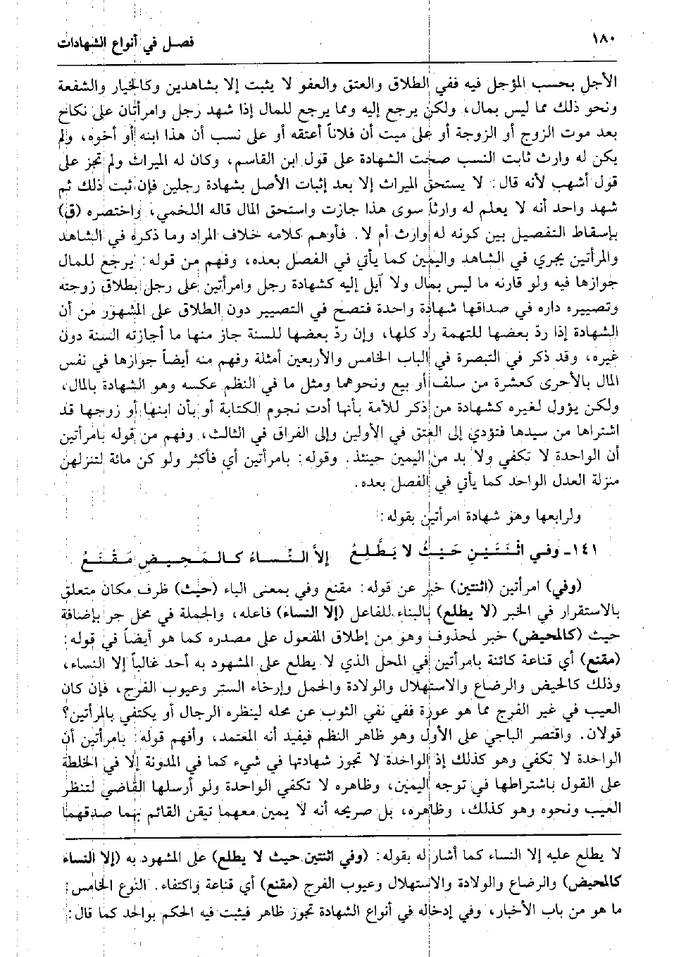 الْأَجَل بِحَسب الْمُؤَجل فِيهِ فَفِي الطَّلَاق وَالْعِتْق وَالْعَفو لَا يثبت إِلَّا بِشَاهِدين وكالخيار وَالشُّفْعَة وَنَحْو ذَلِك مِمَّا لَيْسَ بِمَال، وَلَكِن يرجع إِلَيْهِ وَمِمَّا يرجع لِلْمَالِ إِذا شهد رجل وَامْرَأَتَانِ على نِكَاح بعد موت الزَّوْج أَو الزَّوْجَة أَو على ميت أَن فلَانا أعْتقهُ أَو على نسب أَن هَذَا ابْنه أَو أَخُوهُ، وَلم يكن لَهُ وَارِث ثَابت النّسَب صحت الشَّهَادَة على قَول ابْن الْقَاسِم، وَكَانَ لَهُ الْمِيرَاث وَلم تجز على قَول أَشهب لِأَنَّهُ قَالَ: لَا يسْتَحق الْمِيرَاث إِلَّا بعد إِثْبَات الأَصْل بِشَهَادَة رجلَيْنِ فَإِن ثَبت ذَلِك ثمَّ شهد وَاحِد أَنه لَا يعلم لَهُ وَارِثا سوى هَذَا جَازَت وَاسْتحق المَال قَالَه اللَّخْمِيّ، وَاخْتَصَرَهُ (ق) بِإِسْقَاط التَّفْصِيل بَين كَونه لَهُ وَارِث أم لَا. فأوهم كَلَامه خلاف المُرَاد وَمَا ذكره فِي الشَّاهِد والمرأتين يجْرِي فِي الشَّاهِد وَالْيَمِين كَمَا يَأْتِي فِي الْفَصْل بعده، وَفهم من قَوْله: يرجع لِلْمَالِ جَوَازهَا فِيهِ وَلَو قارنه مَا لَيْسَ بِمَال وَلَا آيل إِلَيْهِ كَشَهَادَة رجل وَامْرَأَتَيْنِ على رجل بِطَلَاق زَوجته وتصييره دَاره فِي صَدَاقهَا شَهَادَة وَاحِدَة فَتَصِح فِي التصيير دون الطَّلَاق على الْمَشْهُور من أَن الشَّهَادَة إِذا ردّ بَعْضهَا للتُّهمَةِ رد كلهَا، وَإِن ردّ بَعْضهَا للسّنة جَازَ مِنْهَا مَا أجازته السّنة دون غَيره، وَقد ذكر فِي التَّبْصِرَة فِي الْبَاب الْخَامِس وَالْأَرْبَعِينَ أَمْثِلَة وَفهم مِنْهُ أَيْضا جَوَازهَا فِي نفس المَال بالأحرى كعشرة من سلف أَو بيع وَنَحْوهمَا وَمثل مَا فِي النّظم عَكسه وَهُوَ الشَّهَادَة بِالْمَالِ، وَلَكِن يؤول لغيره كَشَهَادَة من ذكر للْأمة بِأَنَّهَا أدَّت نُجُوم الْكِتَابَة أَو بِأَن ابْنهَا أَو زَوجهَا قد اشْتَرَاهَا من سَيِّدهَا فتؤدي إِلَى الْعتْق فِي الْأَوَّلين وَإِلَى الْفِرَاق فِي الثَّالِث، وَفهم من قَوْله بامرأتين أَن الْوَاحِدَة لَا تَكْفِي وَلَا بُد من الْيَمين حِينَئِذٍ. وَقَوله: بامرأتين أَي فَأكْثر وَلَو كن مائَة لتنزلهن منزلَة الْعدْل الْوَاحِد كَمَا يَأْتِي فِي الْفَصْل بعده. ولرابعها وَهُوَ شَهَادَة امْرَأتَيْنِ بقوله: وَفِي اثْنَتَيْنِ حَيْثُ لَا يَطَّلِعُ إلاَّ النِّساءُ كالمَحِيضِ مَقْنَعُ (وَفِي) امْرَأتَيْنِ (اثْنَتَيْنِ) خبر عَن قَوْله: مقنع وَفِي بِمَعْنى الْبَاء (حَيْثُ) ظرف مَكَان مُتَعَلق بالاستقرار فِي الْخَبَر (لَا يطلع) بِالْبِنَاءِ للْفَاعِل (إِلَّا النِّسَاء) فَاعله، وَالْجُمْلَة فِي مَحل جر بِإِضَافَة حَيْثُ (كالمحيض) خبر لمَحْذُوف وَهُوَ من إِطْلَاق الْمَفْعُول على مصدره كَمَا هُوَ أَيْضا فِي قَوْله: (مقنع) أَي قناعة كائنة بامرأتين فِي الْمحل الَّذِي لَا يطلع على الْمَشْهُود بِهِ أحد غَالِبا إِلَّا النِّسَاء، وَذَلِكَ كالحيض وَالرّضَاع والاستهلال والولادة وَالْحمل وإرخاء السّتْر وعيوب الْفرج، فَإِن كَانَ الْعَيْب فِي غير الْفرج مِمَّا هُوَ عَورَة فَفِي نفي الثَّوْب عَن مَحَله لينظره الرِّجَال أَو يَكْتَفِي بالمرأتين؟ قَولَانِ. وَاقْتصر الْبَاجِيّ على الأول وَهُوَ ظَاهر النّظم فَيُفِيد أَنه الْمُعْتَمد، وَأفهم قَوْله: بامرأتين أَن الْوَاحِدَة لَا تَكْفِي وَهُوَ كَذَلِك إِذْ الْوَاحِدَة لَا تجوز شهادتها فِي شَيْء كَمَا فِي الْمُدَوَّنَة إِلَّا فِي الْخلطَة على القَوْل باشتراطها فِي توجه الْيَمين، وَظَاهره لَا تَكْفِي الْوَاحِدَة وَلَو أرسلها القَاضِي لتنظر الْعَيْب وَنَحْوه وَهُوَ كَذَلِك، وَظَاهره، بل صَرِيحه أَنه لَا يَمِين مَعَهُمَا تَيَقّن الْقَائِم بهما صدقهما
