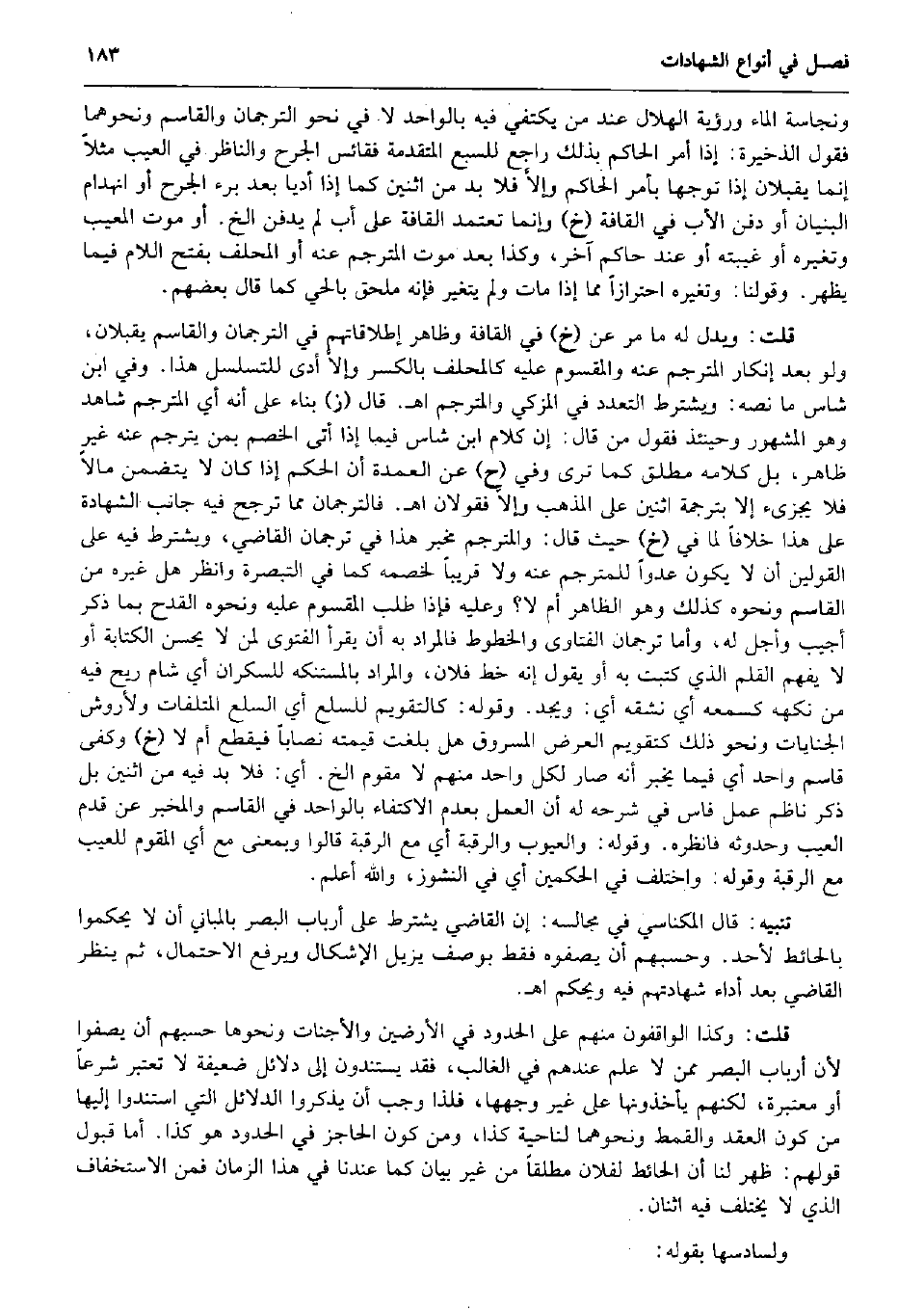 ونجاسة المَاء ورؤية الْهلَال عِنْد من يَكْتَفِي فِيهِ بِالْوَاحِدِ لَا فِي نَحْو الترجمان وَالقَاسِم وَنَحْوهمَا فَقَوْل الذَّخِيرَة: إِذا أَمر الْحَاكِم بذلك رَاجع للسبع الْمُتَقَدّمَة فقائس الْجرْح والناظر فِي الْعَيْب مثلا إِنَّمَا يقبلان إِذا توجها بِأَمْر الْحَاكِم وإلاَّ فَلَا بُد من اثْنَيْنِ كَمَا إِذا أديا بعد برْء الْجرْح أَو انهدام الْبُنيان أَو دفن الْأَب فِي الْقَافة (خَ) وَإِنَّمَا تعتمد الْقَافة على أَب لم يدْفن الخ. أَو موت الْمَعِيب وتغيره أَو غيبته أَو عِنْد حَاكم آخر، وَكَذَا بعد موت المترجم عَنهُ أَو المحلف بِفَتْح اللَّام فِيمَا يظْهر. وَقَوْلنَا: وتغيره احْتِرَازًا مِمَّا إِذا مَاتَ وَلم يتَغَيَّر فَإِنَّهُ مُلْحق بالحي كَمَا قَالَ بَعضهم. قلت: وَيدل لَهُ مَا مر عَن (خَ) فِي الْقَافة وَظَاهر إطلاقاتهم فِي الترجمان وَالقَاسِم يقبلان، وَلَو بعد إِنْكَار المترجم عَنهُ والمقسوم عَلَيْهِ كالمحلف بِالْكَسْرِ وإلاَّ أدّى للتسلسل هَذَا. وَفِي ابْن شَاس مَا نَصه: وَيشْتَرط التَّعَدُّد فِي الْمُزَكي والمترجم اه. قَالَ (ز) بِنَاء على أَنه أَي المترجم شَاهد وَهُوَ الْمَشْهُور وَحِينَئِذٍ فَقَوْل من قَالَ: إِن كَلَام ابْن شَاس فِيمَا إِذا أَتَى الْخصم بِمن يترجم عَنهُ غير ظَاهر بل كَلَامه مُطلق كَمَا ترى وَفِي (ح) عَن الْعُمْدَة أَن الحكم إِذا كَانَ لَا يتَضَمَّن مَالا فَلَا يجزىء إِلَّا بترجمة اثْنَيْنِ على الْمَذْهَب وإلاَّ فَقَوْلَانِ اه. فالترجمان مِمَّا ترجح فِيهِ جَانب الشَّهَادَة على هَذَا خلافًا لما فِي (خَ) حَيْثُ قَالَ: والمترجم مخبر هَذَا فِي ترجمان القَاضِي، وَيشْتَرط فِيهِ على الْقَوْلَيْنِ أَن لَا يكون عدوا للمترجم عَنهُ وَلَا قَرِيبا لخصمه كَمَا فِي التَّبْصِرَة وَانْظُر هَل غَيره من الْقَاسِم وَنَحْوه كَذَلِك وَهُوَ الظَّاهِر أم لَا؟ وَعَلِيهِ فَإِذا طلب الْمَقْسُوم عَلَيْهِ وَنَحْوه الْقدح بِمَا ذكر أُجِيب وَأجل لَهُ، وَأما ترجمان الْفَتَاوَى والخطوط فَالْمُرَاد بِهِ أَن يقْرَأ الْفَتْوَى لمن لَا يحسن الْكِتَابَة أَو لَا يفهم الْقَلَم الَّذِي كتبت بِهِ أَو يَقُول إِنَّه خطّ فلَان، وَالْمرَاد بالمستنكه للسكران أَي شام ريح فِيهِ من نكهه كسمعه أَي نشقه أَي: ويجد. وَقَوله: كالتقويم للسلع أَي السّلع الْمُتْلفَات ولأروش الْجِنَايَات وَنَحْو ذَلِك كتقويم الْعرض الْمَسْرُوق هَل بلغت قِيمَته نِصَابا فَيقطع أم لَا (خَ) وَكفى قَاسم وَاحِد أَي فِيمَا يخبر أَنه صَار لكل وَاحِد مِنْهُم لَا مقوم الخ. أَي: فَلَا بُد فِيهِ من اثْنَيْنِ بل ذكر ناظم عمل فاس فِي شَرحه لَهُ أَن الْعَمَل بِعَدَمِ الِاكْتِفَاء بِالْوَاحِدِ فِي الْقَاسِم والمخبر عَن قدم الْعَيْب وحدوثه فَانْظُرْهُ. وَقَوله: والعيوب والرقبة أَي مَعَ الرَّقَبَة قَالُوا وَبِمَعْنى مَعَ أَي الْمُقَوّم للعيب مَعَ الرَّقَبَة وَقَوله: وَاخْتلف فِي الْحكمَيْنِ أَي فِي النُّشُوز، وَالله أعلم. تَنْبِيه: قَالَ المكناسي فِي مجالسه: إِن القَاضِي يشْتَرط على أَرْبَاب الْبَصَر بالمباني أَن لَا يحكموا بِالْحَائِطِ لأحد. وحسبهم أَن يصفوه فَقَط بِوَصْف يزِيل الْإِشْكَال وَيرْفَع الِاحْتِمَال، ثمَّ ينظر القَاضِي بعد أَدَاء شَهَادَتهم فِيهِ وَيحكم اه. قلت: وَكَذَا الواقفون مِنْهُم على الْحُدُود فِي الْأَرْضين والأجنات وَنَحْوهَا حسبهم أَن يصفوا لِأَن أَرْبَاب الْبَصَر مِمَّن لَا علم عِنْدهم فِي الْغَالِب، فقد يستندون إِلَى دَلَائِل ضَعِيفَة لَا تعْتَبر شرعا أَو مُعْتَبرَة، لكِنهمْ يأخذونها على غير وَجههَا، فَلِذَا وَجب أَن يذكرُوا الدَّلَائِل الَّتِي استندوا إِلَيْهَا من كَون العقد والقمط وَنَحْوهمَا لناحية كَذَا، وَمن كَون الحاجز فِي الْحُدُود هُوَ كَذَا. أما قبُول قَوْلهم: ظهر لنا أَن الْحَائِط لفُلَان مُطلقًا من غير بَيَان كَمَا عندنَا فِي هَذَا الزَّ