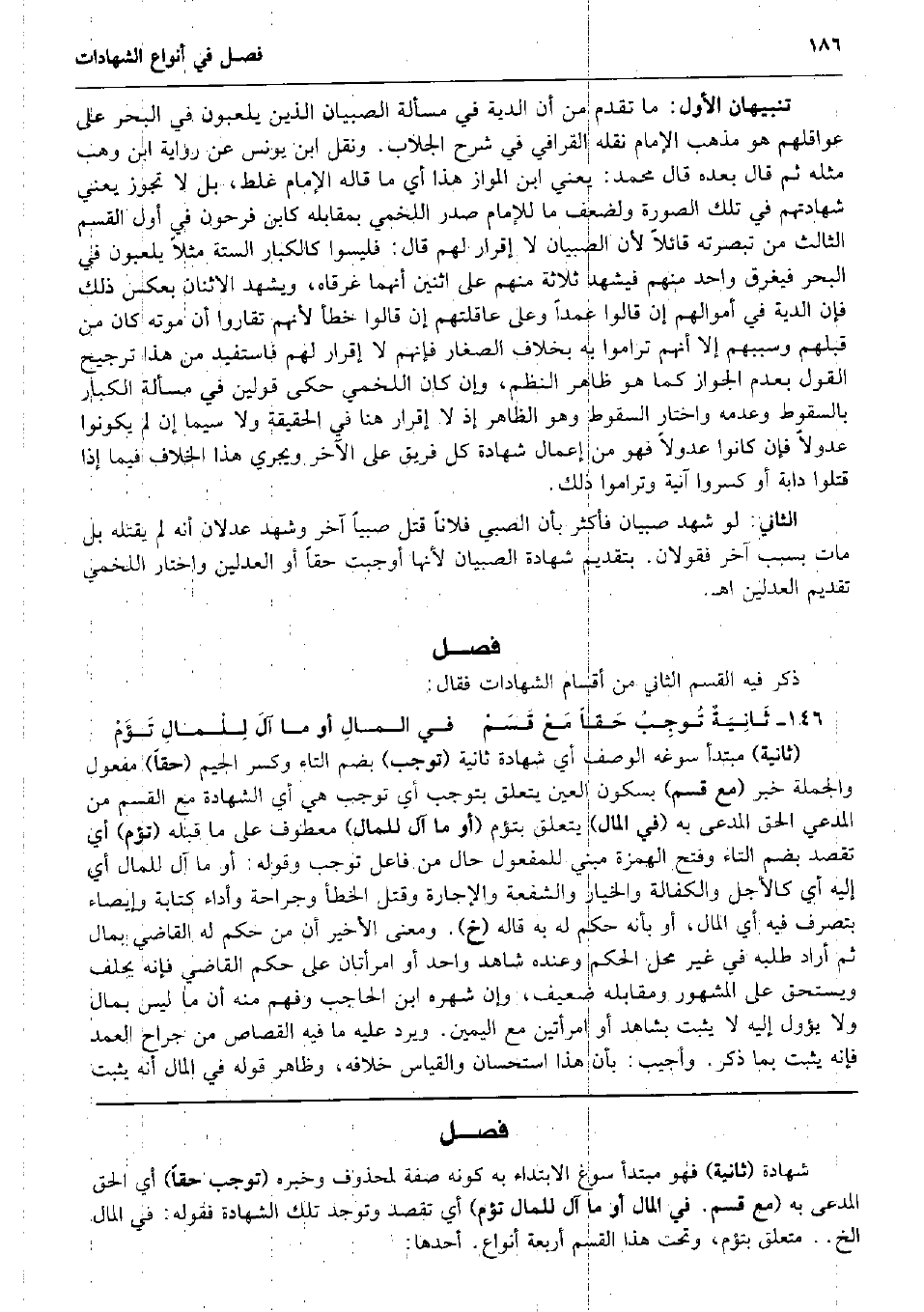 ذكر فِيهِ الْقسم الثَّانِي من أَقسَام الشَّهَادَات فَقَالَ: ثَانِيَةٌ تُوجِبُ حَقاً مَعْ قَسَمْ فِي المالِ أَو مَا آلَ لِلْمالِ تَؤَمْ (ثَانِيَة) مُبْتَدأ سوغه الْوَصْف أَي شَهَادَة ثَانِيَة (توجب) بِضَم التَّاء وَكسر الْجِيم (حَقًا) مفعول وَالْجُمْلَة خبر (مَعَ قسم) بِسُكُون الْعين يتَعَلَّق بتوجب أَي توجب هِيَ أَي الشَّهَادَة مَعَ الْقسم من الْمُدَّعِي الْحق الْمُدعى بِهِ (فِي المَال) يتَعَلَّق بتؤم (أَو مَا آل لِلْمَالِ) مَعْطُوف على مَا قبله (تؤم) أَي تقصد بِضَم التَّاء وَفتح الْهمزَة مَبْنِيّ للْمَفْعُول حَال من فَاعل توجب وَقَوله: أَو مَا آل لِلْمَالِ أَي إِلَيْهِ أَي كالأجل وَالْكَفَالَة وَالْخيَار وَالشُّفْعَة وَالْإِجَارَة وَقتل الْخَطَأ وجراحة وَأَدَاء كِتَابَة وإيصاء بِتَصَرُّف فِيهِ أَي المَال، أَو بِأَنَّهُ حكم لَهُ بِهِ قَالَه (خَ) . وَمعنى الْأَخير أَن من حكم لَهُ القَاضِي بِمَال ثمَّ أَرَادَ طلبه فِي غير مَحل الحكم وَعِنْده شَاهد وَاحِد أَو امْرَأَتَانِ على حكم القَاضِي فَإِنَّهُ يحلف وَيسْتَحق على الْمَشْهُور وَمُقَابِله ضَعِيف، وَإِن شهره ابْن الْحَاجِب وَفهم مِنْهُ أَن مَا لَيْسَ بِمَال وَلَا يؤول إِلَيْهِ لَا يثبت بِشَاهِد أَو امْرَأتَيْنِ مَعَ الْيَمين. وَيرد عَلَيْهِ مَا فِيهِ الْقصاص من جراح الْعمد فَإِنَّهُ يثبت بِمَا ذكر. وَأجِيب: بِأَن هَذَا اسْتِحْسَان وَالْقِيَاس خِلَافه، وَظَاهر قَوْله فِي المَال أَنه يثبت