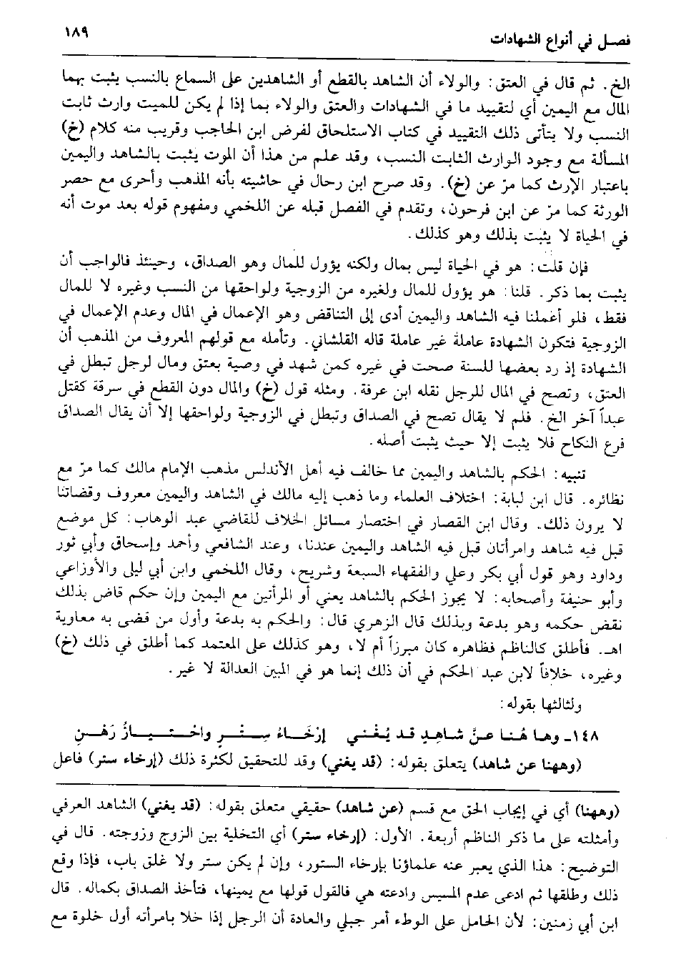 الخ. ثمَّ قَالَ فِي الْعتْق: وَالْوَلَاء أَن الشَّاهِد بِالْقطعِ أَو الشَّاهِدين على السماع بِالنّسَبِ يثبت بهما المَال مَعَ الْيَمين أَي لتقييد مَا فِي الشَّهَادَات وَالْعِتْق وَالْوَلَاء بِمَا إِذا لم يكن للْمَيت وَارِث ثَابت النّسَب وَلَا يَتَأَتَّى ذَلِك التَّقْيِيد فِي كتاب الِاسْتِلْحَاق لفرض ابْن الْحَاجِب وَقَرِيب مِنْهُ كَلَام (خَ) الْمَسْأَلَة مَعَ وجود الْوَارِث الثَّابِت النّسَب، وَقد علم من هَذَا أَن الْمَوْت يثبت بِالشَّاهِدِ وَالْيَمِين بِاعْتِبَار الْإِرْث كَمَا مرّ عَن (خَ) . وَقد صرح ابْن رحال فِي حَاشِيَته بِأَنَّهُ الْمَذْهَب وَأَحْرَى مَعَ حصر الْوَرَثَة كَمَا مرّ عَن ابْن فَرِحُونَ، وَتقدم فِي الْفَصْل قبله عَن اللَّخْمِيّ وَمَفْهُوم قَوْله بعد موت أَنه فِي الْحَيَاة لَا يثبت بذلك وَهُوَ كَذَلِك. فَإِن قلت: هُوَ فِي الْحَيَاة لَيْسَ بِمَال وَلكنه يؤول لِلْمَالِ وَهُوَ الصَدَاق، وَحِينَئِذٍ فَالْوَاجِب أَن يثبت بِمَا ذكر. قُلْنَا: هُوَ يؤول لِلْمَالِ وَلغيره من الزَّوْجِيَّة ولواحقها من النّسَب وَغَيره لَا لِلْمَالِ فَقَط، فَلَو أعملنا فِيهِ الشَّاهِد وَالْيَمِين أدّى إِلَى التَّنَاقُض وَهُوَ الإعمال فِي المَال وَعدم الإعمال فِي الزَّوْجِيَّة فَتكون الشَّهَادَة عاملة غير عاملة قَالَه القلشاني. وتأمله مَعَ قَوْلهم الْمَعْرُوف من الْمَذْهَب أَن الشَّهَادَة إِذْ رد بَعْضهَا للسّنة صحت فِي غَيره كمن شهد فِي وَصِيَّة بِعِتْق وَمَال لرجل تبطل فِي الْعتْق، وَتَصِح فِي المَال للرجل نَقله ابْن عَرَفَة. وَمثله قَول (خَ) وَالْمَال دون الْقطع فِي سَرقَة كَقَتل عبدا آخر الخ. فَلم لَا يُقَال تصح فِي الصَدَاق وَتبطل فِي الزَّوْجِيَّة ولواحقها إِلَّا أَن يُقَال الصَدَاق فرع النِّكَاح فَلَا يثبت إِلَّا حَيْثُ يثبت أَصله. تَنْبِيه: الحكم بِالشَّاهِدِ وَالْيَمِين مِمَّا خَالف فِيهِ أهل الأندلس مَذْهَب الإِمَام مَالك كَمَا مرّ مَعَ نَظَائِره. قَالَ ابْن لبَابَة: اخْتِلَاف الْعلمَاء وَمَا ذهب إِلَيْهِ مَالك فِي الشَّاهِد وَالْيَمِين مَعْرُوف وقضاتنا لَا يرَوْنَ ذَلِك. وَقَالَ ابْن الْقصار فِي اخْتِصَار مسَائِل الْخلاف للْقَاضِي عبد الْوَهَّاب: كل مَوضِع قبل فِيهِ شَاهد وَامْرَأَتَانِ قبل فِيهِ الشَّاهِد وَالْيَمِين عندنَا، وَعند الشَّافِعِي وَأحمد وَإِسْحَاق وَأبي ثَوْر وَدَاوُد وَهُوَ قَول أبي بكر وَعلي وَالْفُقَهَاء السَّبْعَة وَشُرَيْح، وَقَالَ اللَّخْمِيّ وَابْن أبي ليلى وَالْأَوْزَاعِيّ وَأَبُو حنيفَة وَأَصْحَابه: لَا يجوز الحكم بِالشَّاهِدِ يَعْنِي أَو الْمَرْأَتَيْنِ مَعَ الْيَمين وَإِن حكم قَاض بذلك نقض حكمه وَهُوَ بِدعَة وَبِذَلِك قَالَ الزُّهْرِيّ قَالَ: وَالْحكم بِهِ بِدعَة وَأول من قضى بِهِ مُعَاوِيَة اه. فَأطلق كالناظم فَظَاهره كَانَ مبرزاً أم لَا، وَهُوَ كَذَلِك على الْمُعْتَمد كَمَا أطلق فِي ذَلِك (خَ) وَغَيره، خلافًا لِابْنِ عبد الحكم فِي أَن ذَلِك إِنَّمَا هُوَ فِي الْمُبين الْعَدَالَة لَا غير. ولثالثها بقوله: وَهَا هُنا عنَّ شاهِدٍ قد يُغْني إرْخَاءُ سِتْرٍ واحْتيازُ رَهْنِ (وَهَهُنَا عَن شَاهد) يتَعَلَّق بقوله: (قد يُغني) وَقد للتحقيق لِكَثْرَة ذَلِك (إرخاء ستر) فَاعل