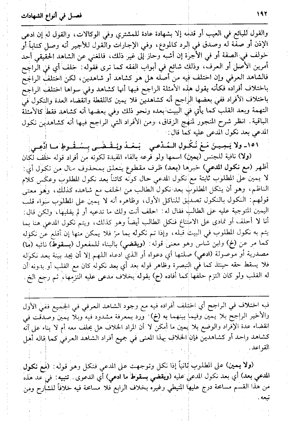وَالْقَوْل للْبَائِع فِي الْعَيْب أَو قدمه إِلَّا بِشَهَادَة عَادَة للْمُشْتَرِي وَفِي الوكالات، وَالْقَوْل لَهُ إِن ادّعى الْإِذْن أَو صفة لَهُ وَصدق فِي الرَّد كَالْمُودعِ، وَفِي الْإِجَارَات وَالْقَوْل للْأَجِير أَنه وصل كتابا أَو خُولِفَ فِي الصّفة أَو فِي الْأُجْرَة إِن أشبه وَحَازَ إِلَى غير ذَلِك، فالمغني عَن الشَّاهِد الْحَقِيقِيّ أحد أَمريْن الأَصْل أَو الْعرف، وَذَلِكَ شَائِع فِي أَبْوَاب الْفِقْه كَمَا ترى فَقَوله: خلف أَي فِي الرَّاجِح فالشاهد الْعرفِيّ وَإِن اخْتلف فِيهِ من أَصله هَل هُوَ كشاهد أَو شَاهِدين، لَكِن اخْتلف الرَّاجِح باخْتلَاف أَفْرَاده فَكَأَنَّهُ يَقُول هَذِه الْأَمْثِلَة الرَّاجِح فِيهَا أَنَّهَا كشاهد وَفِي سواهَا اخْتلف الرَّاجِح باخْتلَاف الْأَفْرَاد فَفِي بَعْضهَا الرَّاجِح أَنه كشاهدين فَلَا يَمِين كاللقطة وانقضاء الْعدة والنكول فِي التُّهْمَة وَبعد الْقلب كَمَا يَأْتِي فِي الْبَيْت بعده وَنَحْو ذَلِك وَفِي بَعْضهَا أَنه كشاهد فَقَط كالأمثلة الْبَاقِيَة. انْظُر شرح المنجور لمنهج الزقاق، وَمن الْأَفْرَاد الَّتِي الرَّاجِح فِيهَا أَنه كشاهدين نُكُول الْمُدَّعِي بعد نُكُول الْمُدعى عَلَيْهِ كَمَا قَالَ: [وَلَا يَمِينَ مَعْ نُكُولِ المُدَّعي بَعْدُ ويُقْض صلى الله عَلَيْهِ وَسلم