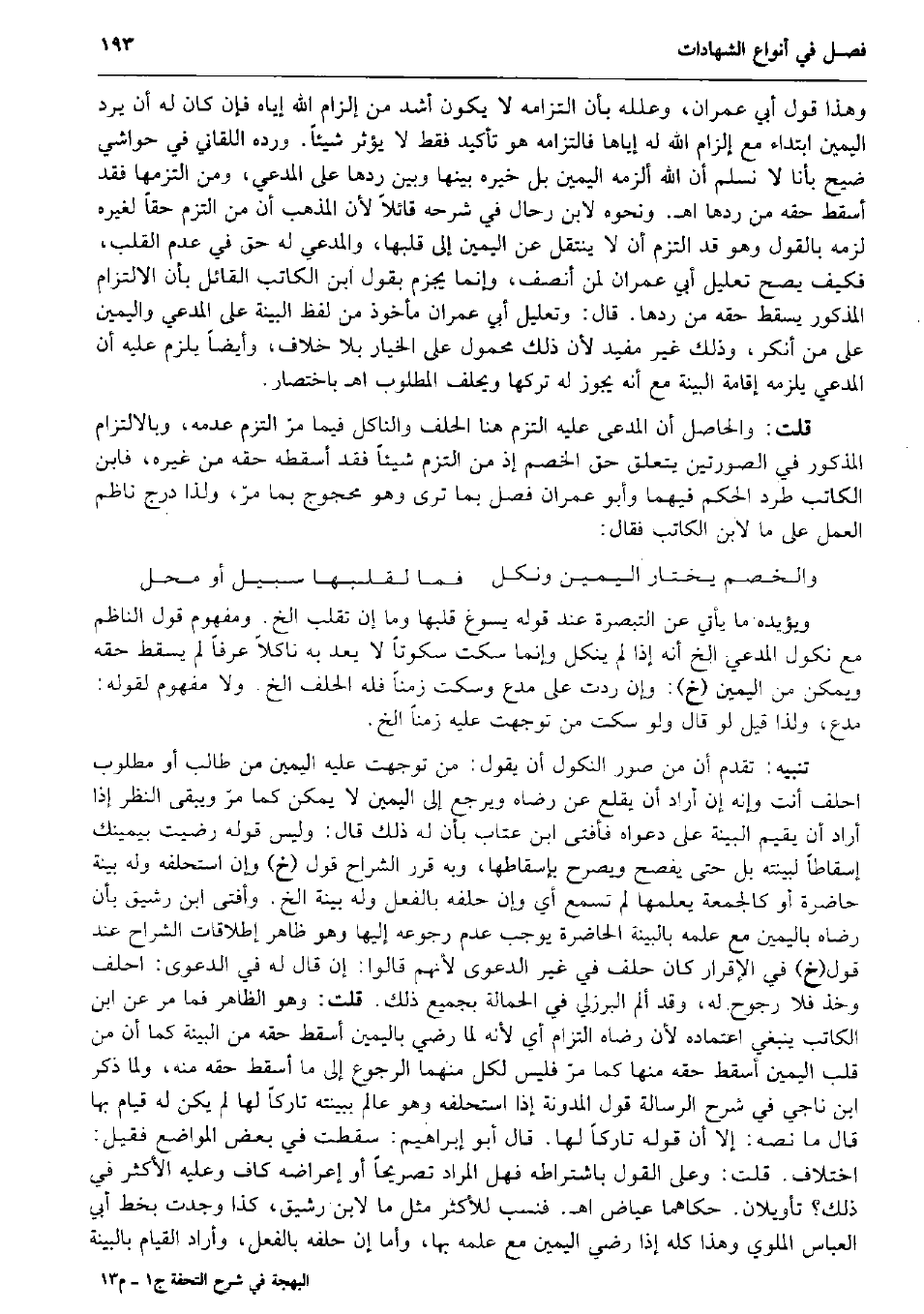 وَهَذَا قَول أبي عمرَان، وَعلله بِأَن الْتِزَامه لَا يكون أَشد من إِلْزَام الله إِيَّاه فَإِن كَانَ لَهُ أَن يرد الْيَمين ابْتِدَاء مَعَ إِلْزَام الله لَهُ إِيَّاهَا فالتزامه هُوَ تَأْكِيد فَقَط لَا يُؤثر شَيْئا. ورده اللَّقَّانِيّ فِي حَوَاشِي ضيح بِأَنا لَا نسلم أَن الله ألزمهُ الْيَمين بل خَيره بَينهَا وَبَين ردهَا على الْمُدَّعِي، وَمن التزمها فقد أسقط حَقه من ردهَا اه. وَنَحْوه لِابْنِ رحال فِي شَرحه قَائِلا لِأَن الْمَذْهَب أَن من الْتزم حَقًا لغيره لزمَه بالْقَوْل وَهُوَ قد الْتزم أَن لَا ينْتَقل عَن الْيَمين إِلَى قَلبهَا، وَالْمُدَّعِي لَهُ حق فِي عدم الْقلب، فَكيف يَصح تَعْلِيل أبي عمرَان لمن أنصف، وَإِنَّمَا يجْزم بقول ابْن الْكَاتِب الْقَائِل بِأَن الِالْتِزَام الْمَذْكُور يسْقط حَقه من ردهَا. قَالَ: وتعليل أبي عمرَان مَأْخُوذ من لفظ الْبَيِّنَة على الْمُدَّعِي وَالْيَمِين على من أنكر، وَذَلِكَ غير مُفِيد لِأَن ذَلِك مَحْمُول على الْخِيَار بِلَا خلاف، وَأَيْضًا يلْزم عَلَيْهِ أَن الْمُدَّعِي يلْزمه إِقَامَة الْبَيِّنَة مَعَ أَنه يجوز لَهُ تَركهَا وَيحلف الْمَطْلُوب اه بِاخْتِصَار. قلت: وَالْحَاصِل أَن الْمُدعى عَلَيْهِ الْتزم هُنَا الْحلف والناكل فِيمَا مرّ الْتزم عَدمه، وبالالتزام الْمَذْكُور فِي الصُّورَتَيْنِ يتَعَلَّق حق الْخصم إِذْ من الْتزم شَيْئا فقد أسْقطه حَقه من غَيره، فَابْن الْكَاتِب طرد الحكم فيهمَا وَأَبُو عمرَان فصل بِمَا ترى وَهُوَ محجوج بِمَا مرّ، وَلذَا درج ناظم الْعَمَل على مَا لِابْنِ الْكَاتِب فَقَالَ: والخصم يخْتَار الْيَمين وَنكل فَمَا لقلبها سَبِيل أَو مَحل وَيُؤَيِّدهُ مَا يَأْتِي عَن التَّبْصِرَة عِنْد قَوْله يسوغ قَلبهَا وَمَا إِن تقلب الخ. وَمَفْهُوم قَول النَّاظِم مَعَ نُكُول الْمُدَّعِي الخ أَنه إِذا لم ينكل وَإِنَّمَا سكت سكُوتًا لَا يعد بِهِ ناكلاً عرفا لم يسْقط حَقه وَيُمكن من الْيَمين (خَ) : وَإِن ردَّتْ على مُدع وَسكت زَمنا فَلهُ الْحلف الخ. وَلَا مَفْهُوم لقَوْله: مُدع، وَلذَا قيل لَو قَالَ وَلَو سكت من تَوَجَّهت عَلَيْهِ زَمنا الخ. تَنْبِيه: تقدم أَن من صور النّكُول أَن يَقُول: من تَوَجَّهت عَلَيْهِ الْيَمين من طَالب أَو مَطْلُوب احْلِف أَنْت وَإنَّهُ إِن أَرَادَ أَن يقْلع عَن رِضَاهُ وَيرجع إِلَى الْيَمين لَا يُمكن كَمَا مرّ وَيبقى النّظر إِذا أَرَادَ أَن يُقيم الْبَيِّنَة على دَعْوَاهُ فَأفْتى ابْن عتاب بِأَن لَهُ ذَلِك قَالَ: وَلَيْسَ قَوْله رضيت بيمينك إِسْقَاطًا لبينته بل حَتَّى يفصح وَيُصَرح بإسقاطها، وَبِه قرر الشُّرَّاح قَول (خَ) وَإِن استحلفه وَله بَيِّنَة حَاضِرَة أَو كَالْجُمُعَةِ يعلمهَا لم تسمع أَي وَإِن حلفه بِالْفِعْلِ وَله بَيِّنَة الخ. وَأفْتى ابْن رَشِيق بِأَن رِضَاهُ بِالْيَمِينِ مَعَ علمه بِالْبَيِّنَةِ الْحَاضِرَة يُوجب عدم رُجُوعه إِلَيْهَا وَهُوَ ظَاهر إطلاقات الشُّرَّاح عِنْد قَول (خَ) فِي الْإِقْرَار كَانَ حلف فِي غير الدَّعْوَى لأَنهم قَالُوا: إِن قَالَ لَهُ فِي الدَّعْوَى: احْلِف وَخذ فَلَا رجوح لَهُ، وَقد ألم الْبُرْزُليّ فِي الْحمالَة بِجَمِيعِ ذَلِك. قلت: وَهُوَ الظَّاهِر فَمَا مر عَن ابْن الْكَاتِب يَنْبَغِي اعْتِمَاده لِأَن رِضَاهُ الْتِزَام أَي لِأَنَّهُ لما رَضِي بِالْيَمِينِ أسقط حَقه من الْبَيِّنَة كَمَا أَن من قلب الْيَمين أسقط حَقه مِنْهَا كَمَا مرّ فَلَيْسَ لكل مِنْهُمَا الرُّجُوع إِلَى مَا أسقط حَقه مِنْهُ، وَلما ذكر ابْن نَاجِي فِي شرح الرسَالَة قَول الْمُدَوَّنَة إِذا استحلفه وَهُوَ عَالم بِبَيِّنَتِهِ تَارِكًا لَهَا لم يكن لَهُ قيام بهَا قَالَ مَا نَصه: إِلَّا أَن قَوْله تَارِكًا لَهَا. قَالَ أَبُو إِبْرَاهِيم: سَقَطت فِي بعض الْمَوَاضِع فَقيل: اخْتِلَاف. قلت: وعَلى القَوْل باشتراطه فَهَل المُرَاد تَصْرِيحًا أَو 