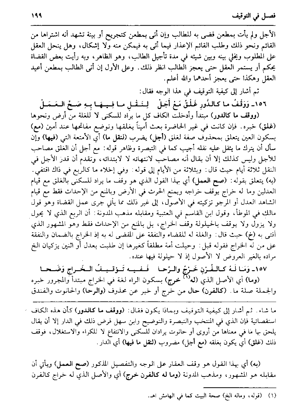 الْأَجَل وَلم يَأْتِ بمطعن قضى بِهِ للطَّالِب وَإِن أَتَى بمطعن كتجريح أَو بَيِّنَة تشهد أَنه اشْتَرَاهَا من الْقَائِم وَنَحْو ذَلِك وَطلب الْقَائِم الْإِعْذَار فِيمَا أَتَى بِهِ فَيمكن مِنْهُ وَلَا إِشْكَال، وَهل ينْحل الْعقل على الْمَطْلُوب ويخلي بَينه وَبَين شَيْئه فِي مُدَّة تَأْجِيل الطَّالِب، وَهُوَ الظَّاهِر، وَبِه رَأَيْت بعض الْقُضَاة يحكم أَو يسْتَمر الْعقل حَتَّى يعجز الطَّالِب انْظُر ذَلِك. وعَلى الأول إِن أَتَى الطَّالِب بمطعن أُعِيد الْعقل وَهَكَذَا حَتَّى يعجز أَحدهمَا وَالله أعلم. ثمَّ أَشَارَ إِلَى كَيْفيَّة التَّوْقِيف فِي هَذَا الْوَجْه فَقَالَ: وَوَقْفُ مَا كالدُّورِ غَلْقٌ مَعْ أَجَلْ لِنَقْلِ مَا فِيهَا بِهِ صَحَّ العَمَلْ (ووقف مَا كالدور) مُبْتَدأ وأدخلت الْكَاف كل مَا يُرَاد للسُّكْنَى لَا للغلة من أَرض وَنَحْوهَا (غلق) خَبره. فَإِن كَانَت فِي غير الْحَاضِرَة بعث أَمينا يغلقها وتوضع مفاتحها عِنْد أَمِين (مَعَ) بِسُكُون الْعين يتَعَلَّق بِمَحْذُوف صفة لغلق (أجل) يضْرب (لنقل مَا) أَي الْأَمْتِعَة الَّتِي (فِيهَا) وَإِن سَأَلَ أَن يتْرك مَا يثقل عَلَيْهِ نَقله أُجِيب كَمَا فِي التَّبْصِرَة وَظَاهر قَوْله: مَعَ أجل أَن الغلق مصاحب للأجل وَلَيْسَ كَذَلِك إِلَّا أَن يُقَال أَنه مصاحب لانتهائه لَا لابتدائه، وَتقدم أَن قدر الْأَجَل فِي النَّقْل ثَلَاثَة أَيَّام حَيْثُ قَالَ: وبثلاثة من الْأَيَّام إِلَى قَوْله: وَفِي إخلاء مَا كالربع فِي ذَاك اقتفي. (بِهِ) يتَعَلَّق بقوله: (صَحَّ الْعَمَل) أَي بِهَذَا القَوْل الَّذِي هُوَ وقف مَا يُرَاد للسُّكْنَى بالغلق مَعَ قيام العدلين وَمَا لَهُ خراج يُوقف خراجه وَيمْنَع الْحَرْث فِي الأَرْض وبالمنع من الإحداث فَقَط مَعَ قيام الشَّاهِد الْعدْل أَو المرجو تزكيته فِي الْأُصُول، إِلَى غير ذَلِك مِمَّا يَأْتِي جرى عمل الْقُضَاة وَهُوَ قَول مَالك فِي الْمُوَطَّأ، وَقَول ابْن الْقَاسِم فِي الْعُتْبِيَّة وَمُقَابِله مَذْهَب الْمُدَوَّنَة: أَن الرّبع الَّذِي لَا يحول وَلَا يَزُول وَلَا يُوقف بالحيلولة وقف الْخراج، بل بِالْمَنْعِ من الإحداث فَقَط وَهُوَ الْمَشْهُور الَّذِي أفتى بِهِ (خَ) حَيْثُ قَالَ: وَالْغلَّة لَهُ للْقَضَاء وَالنَّفقَة على المقضى لَهُ بِهِ إِذْ الْخراج بِالضَّمَانِ وَالنَّفقَة على من لَهُ الْخراج فَقَوله قبل: وحيلت أمة مُطلقًا كَغَيْرِهَا إِن طلبت بِعدْل أَو اثْنَيْنِ يزكيان الخ مُرَاده بِالْغَيْر الْعرُوض لَا الْأُصُول إِذْ لَا حيلولة فِيهَا عِنْده. وَمَا لَهُ كالفُرْنِ خَرْجٌ والرَّحا فَفيه تَوْقيفُ الخَراجِ وَضَحا (وَمَا) أَي الأَصْل الَّذِي (لَهُ خرج) بِسُكُون الرَّاء لُغَة فِي الْخراج مُبْتَدأ وَالْمَجْرُور خَبره وَالْجُمْلَة صلَة مَا. (كالفرن) حَال من خرج أَو خبر عَن مَحْذُوف (والرحا) والحانوت والفندق