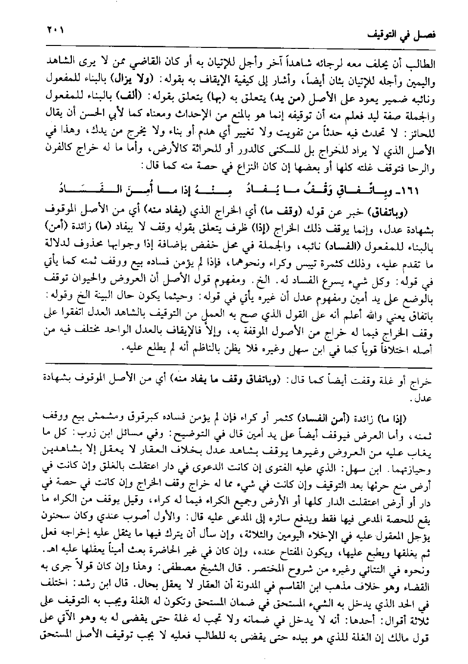 أَن يحلف مَعَه لرجائه شَاهدا آخر وَأجل للإتيان بِهِ أَو كَانَ القَاضِي مِمَّن لَا يرى الشَّاهِد وَالْيَمِين وأجله للإتيان بثان أَيْضا، وَأَشَارَ إِلَى كَيْفيَّة الإيقاف بِهِ بقوله: (وَلَا يزَال) بِالْبِنَاءِ للْمَفْعُول ونائبه ضمير يعود على الأَصْل (من يَد) يتَعَلَّق بِهِ (بهَا) يتَعَلَّق بقوله: (ألف) بِالْبِنَاءِ للْمَفْعُول وَالْجُمْلَة صفة ليد فَعلم مِنْهُ أَن توقيفه إِنَّمَا هُوَ بِالْمَنْعِ من الإحداث وَمَعْنَاهُ كَمَا لأبي الْحسن أَن يُقَال للحائز: لَا تحدث فِيهِ حَدثا من تَفْوِيت وَلَا تَغْيِير أَي هدم أَو بِنَاء وَلَا يخرج من يدك، وَهَذَا فِي الأَصْل الَّذِي لَا يُرَاد للخراج بل للسُّكْنَى كالدور أَو للحراثة كالأرض، وَأما مَا لَهُ خراج كالفرن والرحا فتوقف غَلَّته كلهَا أَو بَعْضهَا إِن كَانَ النزاع فِي حِصَّة مِنْهُ كَمَا قَالَ: وبِاتِّفاقِ وَقْفُ مَا يُفادُ مِنْهُ إِذا مَا أُمِنَ الفَسَادُ (وباتفاق) خبر عَن قَوْله (وقف مَا) أَي الْخراج الَّذِي (يفاد مِنْهُ) أَي من الأَصْل الْمَوْقُوف بِشَهَادَة عدل، وَإِنَّمَا يُوقف ذَلِك الْخراج (إِذا) ظرف يتَعَلَّق بقوله وقف لَا بيفاد (مَا) زَائِدَة (أَمن) بِالْبِنَاءِ للْمَفْعُول (الْفساد) نَائِبه، وَالْجُمْلَة فِي مَحل خفض بِإِضَافَة إِذا وجوابها مَحْذُوف لدلَالَة مَا تقدم عَلَيْهِ، وَذَلِكَ كثمرة تيبس وكراء وَنَحْوهمَا، فَإِذا لم يُؤمن فَسَاده بيع ووقف ثمنه كَمَا يَأْتِي فِي قَوْله: وكل شَيْء يسْرع الْفساد لَهُ. الخ. وَمَفْهُوم قَول الأَصْل أَن الْعرُوض وَالْحَيَوَان توقف بِالْوَضْعِ على يَد أَمِين وَمَفْهُوم عدل أَن غَيره يَأْتِي فِي قَوْله: وحيثما يكون حَال الْبَيِّنَة الخ وَقَوله: بِاتِّفَاق يَعْنِي وَالله أعلم أَنه على القَوْل الَّذِي صَحَّ بِهِ الْعَمَل من التَّوْقِيف بِالشَّاهِدِ الْعدْل اتَّفقُوا على وقف الْخراج فِيمَا لَهُ خراج من الْأُصُول الموقفة بِهِ، وإلاَّ فالإيقاف بِالْعَدْلِ الْوَاحِد مُخْتَلف فِيهِ من أَصله اخْتِلَافا قَوِيا كَمَا فِي ابْن سهل وَغَيره فَلَا يظنّ بالناظم أَنه لم يطلع عَلَيْهِ.