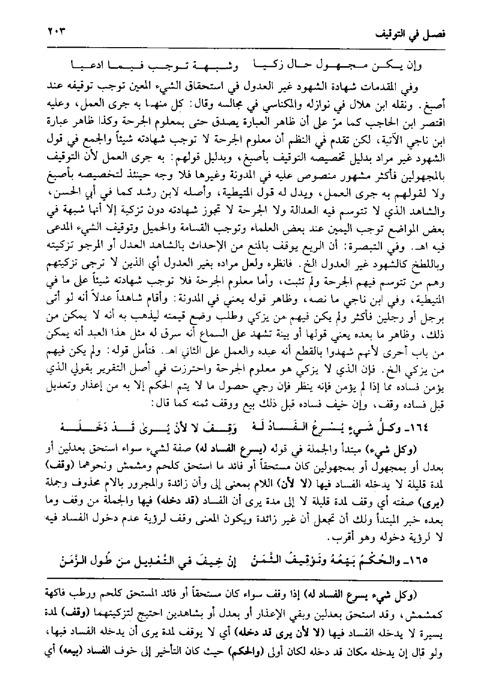1648 - ; قَدْ دَخَلَهْ (وكل شَيْء) مُبْتَدأ وَالْجُمْلَة فِي قَوْله (يسْرع الْفساد لَهُ) صفة لشَيْء سَوَاء اسْتحق بعدلين أَو بِعدْل أَو بِمَجْهُول أَو بمجهولين كَانَ مُسْتَحقّا أَو فائد مَا اسْتحق كلحم ومشمش وَنَحْوهمَا (وقف) لمُدَّة قَليلَة لَا يدْخلهُ الْفساد فِيهَا (لَا لِأَن) اللَّام بِمَعْنى إِلَى وَأَن زَائِدَة وَالْمَجْرُور بَالَام مَحْذُوف وَجُمْلَة (يرى) صفته أَي وقف لمُدَّة قَليلَة لَا إِلَى مُدَّة يرى أَن الْفساد (قد دخله) فِيهَا وَالْجُمْلَة من وقف وَمَا بعده خبر الْمُبْتَدَأ وَلَك أَن تجْعَل أَن غير زَائِدَة وَيكون الْمَعْنى وقف لرؤية عدم دُخُول الْفساد فِيهِ لَا لرؤية دُخُوله وَهُوَ أقرب. والحُكْمُ بَيْعُهُ وتَوْقِيفُ الثَّمَنْ إنْ خِيفَ فِي التَّعْدِيل من طُول الزَّمَنْ