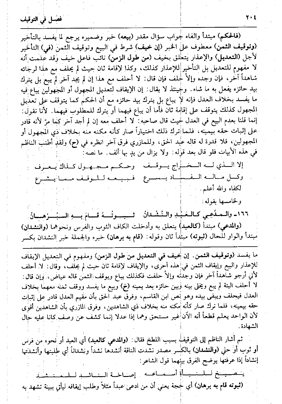 (فَالْحكم) مُبْتَدأ وَالْفَاء جَوَاب سُؤال مُقَدّر (بَيْعه) خبر وضميره يرجع لما يفْسد بِالتَّأْخِيرِ (وتوقيف الثّمن) مَعْطُوف على الْخَبَر (إِن خيف) شَرط فِي البيع وتوقيف الثّمن (فِي) التَّأْخِير لأجل (التَّعْدِيل) والإعذار يتَعَلَّق بخيف (من طول الزَّمن) نَائِب فَاعل خيف وَقد علمت أَنه لَا مَفْهُوم للتعديل بل التَّأْخِير للإعذار كَذَلِك، وَكَذَا لإِقَامَة ثَان حَيْثُ لم يحلف مَعَ هَذَا لرجائه شَاهدا آخر، فَإِن وجده وإلاَّ حلف فَإِن قَالَ: لَا أَحْلف مَعَ هَذَا إِن لم يجد آخر لم يبع بل يتْرك بيد حائزه يفعل بِهِ مَا شَاءَ. وَحِينَئِذٍ لَا يُقَال: إِن الإيقاف لتعديل الْمَجْهُول أَو المجهولين يُبَاع فِيهِ مَا يفْسد بِخِلَاف الْعدْل فَإِنَّهُ لَا يُبَاع بل يتْرك بيد حائزه مَعَ أَن الحكم كَمَا يتَوَقَّف على تَعْدِيل الْمَجْهُول كَذَلِك يتَوَقَّف على إِقَامَة ثَان فَأَما أَن يُبَاع فيهمَا أَو يتْرك للمطلوب فيهمَا. لأَنا نقُول: إِنَّمَا قُلْنَا بِعَدَمِ البيع فِي الْعدْل حَيْثُ قَالَ صَاحبه: لَا أَحْلف مَعَه إِن لم أجد آخر كَمَا مرّ لِأَنَّهُ قَادر على إِثْبَات حَقه بِيَمِينِهِ، فَلَمَّا ترك ذَلِك اخْتِيَارا صَار كَأَنَّهُ مكنه مِنْهُ بِخِلَاف ذِي الْمَجْهُول أَو المجهولين، فَلَا قدرَة لَهُ قَالَه عبد الْحق، وللمازري فرق آخر اُنْظُرْهُ فِي (ح) وَلَقَد أطنب النَّاظِم فِي هَذِه الأبيات فَلَو قَالَ بعد قَوْله: وَلَا يزَال من يدٍ بهَا ألف. مَا نَصه: إِلَّا الَّذِي لَهُ الْخراج يُوقف وَحكم مَجْهُول كَذَاك يعرف وكل مَاله الْفساد يسْرع فبيعه للْوَقْف مِمَّا يشرع لكفاه وَالله أعلم. ولخامسها بقوله: والمدَّعِي كالعَبْدِ والنِّشْدانُ ثبوتُهُ قامَ بهِ البُرْهانُ (وَالْمُدَّعِي) مُبْتَدأ (كَالْعَبْدِ) يتَعَلَّق بِهِ وأدخلت الْكَاف الثَّوْب وَالْفرس وَنَحْوهمَا (والنشدان) مُبْتَدأ وَالْوَاو للْحَال (ثُبُوته) مُبْتَدأ ثَان وَقَوله: (قَامَ بِهِ برهَان) خَبره وَالْجُمْلَة خبر النشدان بِكَسْر