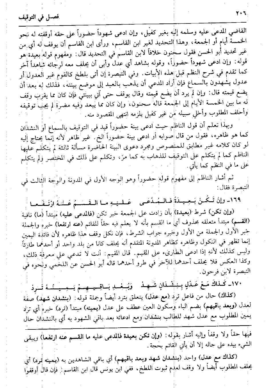 القَاضِي الْمُدعى عَلَيْهِ وَسلمهُ إِلَيْهِ بِغَيْر كَفِيل، وَإِن ادّعى شُهُودًا حضوراً على حَقه أوقفته لَهُ نَحْو الْخَمْسَة أَيَّام أَو الْجُمُعَة، وَهَذَا التَّحْدِيد لغير ابْن الْقَاسِم، وَرَأى ابْن الْقَاسِم أَن يُوقف لَهُ أَي من غير تَحْدِيد أَبُو الْحسن فَقَوْل سَحْنُون خلافًا لِابْنِ الْقَاسِم فِي التَّحْدِيد قَالَ: وَمَفْهُوم قَوْله بعيدَة هُوَ قَوْله: وَإِن ادّعى شُهُودًا حضوراً، وَقَوله بِشَاهِد أَي عدل وأبى أَن يحلف مَعَه لرجائه شَاهدا آخر كَمَا تقدم فِي شرح النّظم قبل هَذِه الأبيات. وَفِي التَّبْصِرَة إِن أَتَى بلطخ كالقوم غير الْعُدُول أَو عدُول يشْهدُونَ بِالسَّمَاعِ فَإِن أَرَادَ الْمُدَّعِي أَن يذهب بِالْعَبدِ إِلَى مَوضِع بَينته، فَذَلِك لَهُ بعد أَن يضع قِيمَته قَالَ: وَإِن لم يرد أَن يضع قِيمَته وَقَالَ يُوقف حَتَّى آتِي ببينتي فَإِن كَانَ مِمَّا يقرب وقف لَهُ مَا بَين الْخَمْسَة الْأَيَّام إِلَى الْجُمُعَة قَالَه سَحْنُون، وَإِن كَانَ مِمَّا يبعد وَفِيه مضرَّة لم يجب توقيفه وأحلف الْمَطْلُوب وأخلي سَبيله من غير كَفِيل يلْزمه انْتهى الْمَقْصُود مِنْهُ. وَبِهَذَا تعلم أَن قَول النَّاظِم حَيْثُ ادّعى بَيِّنَة حضوراً قيد فِي التَّوْقِيف بِالسَّمَاعِ أَو النشدان كَمَا هُوَ ظَاهره، فَقَوْل من قَالَ صَوَابه أَو ادّعى بَيِّنَة حضوراً الخ. غير ظَاهر لِأَنَّهُ إِنَّمَا يحْتَاج إِلَيْهِ لَو كَانَ كَلَامه غير مُطَابق للمنصوص وَمُجَرَّد دَعْوَى الْبَيِّنَة الْحَاضِرَة مَسْأَلَة ثَالِثَة لم يتَكَلَّم عَلَيْهَا النَّاظِم كَمَا لم يتَكَلَّم على التَّوْقِيف للذهاب بِهِ كَمَا مرّ، وَتكلم على ذَلِك فِي الْمُخْتَصر وَلم يتَكَلَّم على مَا فِي النّظم كَمَا يَأْتِي. ثمَّ أَشَارَ النَّاظِم إِلَى مَفْهُوم قَوْله حضوراً وَهُوَ الْوَجْه الأول فِي الْمُدَوَّنَة والوجة الثَّالِث فِي التَّبْصِرَة فَقَالَ: وإنْ تَكُنْ بَعِيدَةً فالمُدَّعَى عَليْهِ مَا القَسَمُ عَنْهُ ارْتَفَعا (وَإِن تكن) شَرط (بعيدَة) بِأَن زَادَت على الْجُمُعَة خبر تكن (فالمدعى عَلَيْهِ) مُبْتَدأ (مَا) نَافِيَة (الْقسم) مُبْتَدأ مُتَعَلّقه مَحْذُوف أَي مَا الْقسم بِأَنَّهُ لَا يعلم فِيهِ حَقًا للقائم (عَنهُ ارتفعا) خَبره وَالْجُمْلَة خبر الأول وَالْجُمْلَة من الأول وَخَبره جَوَاب الشَّرْط، فَإِن نكل وقف هَذَا ظَاهره لِأَن فَائِدَة الْيَمين إِنَّمَا تظهر فِي النّكُول وَظَاهره كظاهر الْمُدَوَّنَة الْمُتَقَدّم أَنه يحلف كَانَا من بلد وَاحِد أَو أَحدهمَا طارئاً وَلَيْسَ كَذَلِك لِأَنَّهُ إِذا ادّعى الطارىء على الْمُقِيم. قَالَ الْمُقِيم: أَنْت لَا تَدعِي عَليّ معرفَة ذَلِك، وَكَذَا الْعَكْس فَلَا يحلف أَحدهمَا للْآخر فِي طرُو أَحدهمَا قَالَه أَبُو الْحسن عَن اللَّخْمِيّ وَنَحْوه فِي التَّبْصِرَة لِابْنِ فَرِحُونَ. كَذاكَ مَعْ عَدْلٍ بِنِشْدَانٍ شَهِدْ وَبُعْدِ بَاقِيهِمْ يَمِينُهُ تَرِدْ (كَذَاك) حَال من فَاعل ترد (مَعَ عدل) يتَعَلَّق بترد أَيْضا وَجُمْلَة قَوْله: (بنشدان شهد) صفة لعدل (وَبعد باقيهم) بِضَم الْبَاء وَسُكُون الْعين عطف على عدل (يَمِينه) مُبْتَدأ (ترد) خَبره أَي ترد يَمِين الْمَطْلُوب مَعَ عدل شهد للطَّالِب بنشدان وَمَعَ ادعائه بعد بَاقِي الشُّهُود بِهِ أَي بالنشدان
