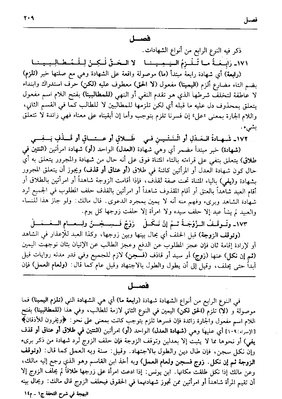1648 - ; كِنْ لِلْمُطالِبينا (رَابِعَة) أَي شَهَادَة رَابِعَة مُبْتَدأ (مَا) مَوْصُولَة وَاقعَة على الشَّهَادَة وَهِي مَعَ صلتها خبر (تلْزم) بِضَم التَّاء مضارع ألزم (اليمينا) مفعول (لَا الْحق) مَعْطُوف عَلَيْهِ (لَكِن) حرف اسْتِدْرَاك وَابْتِدَاء لَا عاطفة لتخلف شَرطهَا الَّذِي هُوَ تقدم النَّفْي أَو النَّهْي (للمطالبينا) بِفَتْح اللَّام اسْم مفعول يتَعَلَّق بِمَحْذُوف دلّ عَلَيْهِ مَا قبله أَي لَكِن تلزمها للمطالبين لَا للطَّالِب كَمَا فِي الْقسم الثَّانِي، وَاللَّام الجارة بِمَعْنى (على) إِن فسرنا تلْزم بتوجب وَأما إِن أبقيناه على مَعْنَاهُ فَهِيَ زَائِدَة لَا تتَعَلَّق بِشَيْء. شَهادةُ العَدْلِ أَو اثْنَتْينِ فِي طَلاقٍ أَو عتاقٍ أَو قَذْفٍ يَفِي (شَهَادَة) خبر مُبْتَدأ مُضْمر أَي وَهِي شَهَادَة (الْعدْل) الْوَاحِد (أَو) شَهَادَة امْرَأتَيْنِ (اثْنَتَيْنِ فِي طَلَاق) يتَعَلَّق بتفي على قِرَاءَته بِالتَّاءِ الْمُثَنَّاة فَوق على أَنه حَال من شَهَادَة وَالْمَجْرُور يتَعَلَّق بِهِ أَي حَال كَون شَهَادَة الْعدْل أَو الْمَرْأَتَيْنِ كائنة فِي طَلَاق (أَو عتاق أَو قذف) وَيجوز أَن يتَعَلَّق الْمَجْرُور بِشَهَادَة و (يَفِي) بِالْيَاءِ الْمُثَنَّاة تَحت صفة لقذف، فَإِذا أَقَامَت الزَّوْجَة شَاهدا أَو امْرَأتَيْنِ بِالطَّلَاق أَو أَقَامَ العَبْد شَاهدا بِالْعِتْقِ أَو أَقَامَ الْمَقْذُوف شَاهدا أَو امْرَأتَيْنِ بِالْقَذْفِ حلف الْمَطْلُوب فِي الْجَمِيع لرد شَهَادَة الشَّاهِد وبرىء وَفهم مِنْهُ أَنه لَا يَمِين بِمُجَرَّد الدَّعْوَى. قَالَ مَالك: وَلَو جَازَ هَذَا للنِّسَاء وَالْعَبِيد لم يَشَأْ عبد إِلَّا حلف سَيّده وَلَا امْرَأَة إِلَّا حَلَفت زَوجهَا كل يَوْم. وتُوقَفُ الزَّوْجَةُ ثمَّ إنْ نَكَلْ زَوْجٌ فَسِجْنٌ ولِعامٍ العَمَلْ (وَتوقف الزَّوْجَة) قبل الْحلف أَي يُحَال بَينهَا وَبَين زَوجهَا، وَكَذَا العَبْد للإعذار فِي الشَّاهِد أَو لإِرَادَة إِقَامَة ثَان فَإِن عجز الْمَطْلُوب عَن الدّفع وَعجز الطَّالِب عَن الْإِتْيَان بثان تَوَجَّهت الْيَمين (ثمَّ إِن نكل) عَنْهَا (زوج) أَو سيد أَو قَاذف (فسجن) لَازم للْجَمِيع وَفِي قدر مدَّته رِوَايَات قيل أبدا حَتَّى يحلف، وَقيل إِلَى أَن يطول والطول بِالِاجْتِهَادِ وَقيل عَام كَمَا قَالَ: (ولعام الْعَمَل) فَإِن