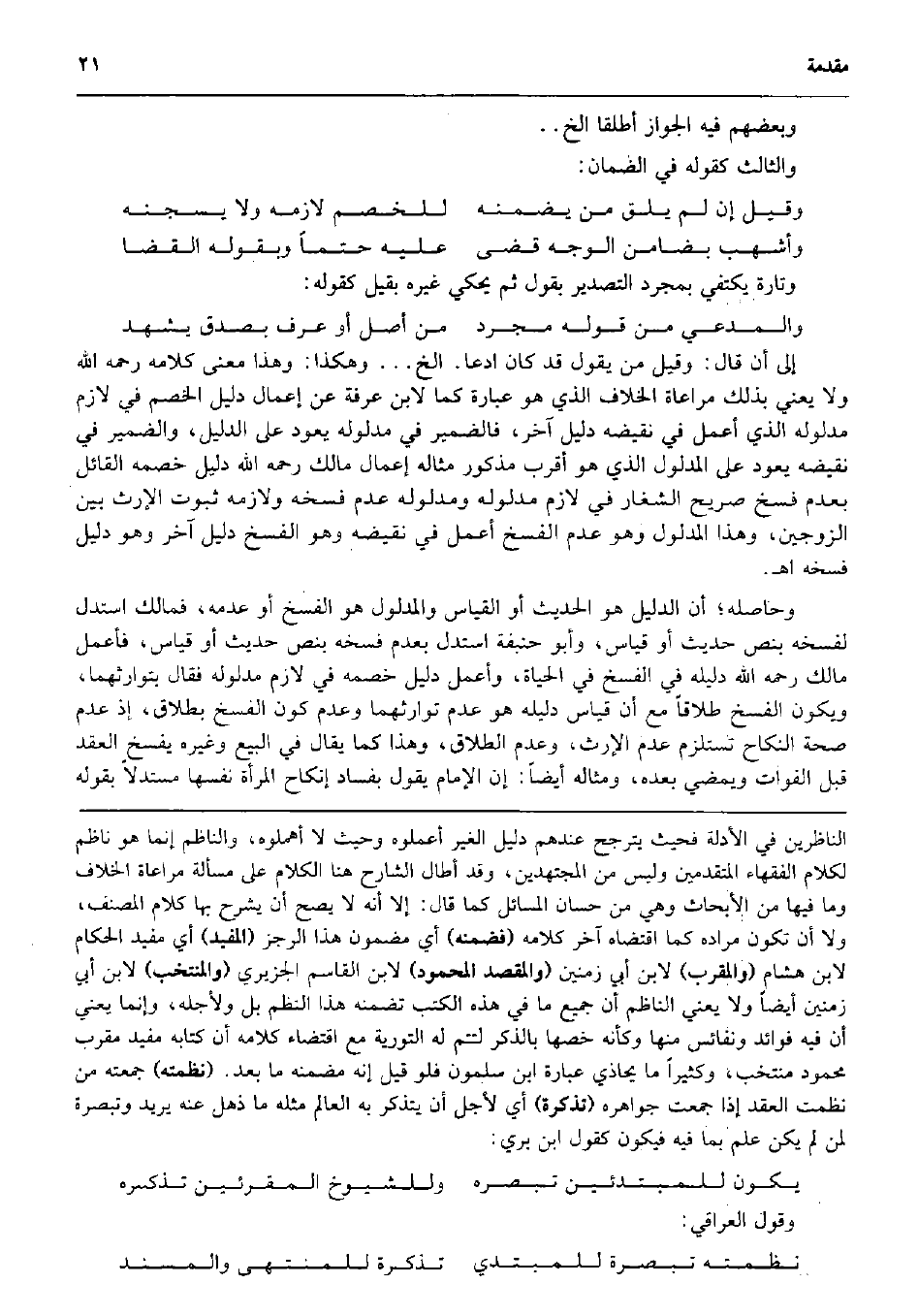 وَبَعْضهمْ فِيهِ الْجَوَاز أطلقا الخ. . وَالثَّالِث كَقَوْلِه فِي الضَّمَان: وَقيل إِن لم يلق من يضمنهُ للخصم لَازمه وَلَا يسجنه وَأَشْهَب بضامن الْوَجْه قضى عَلَيْهِ حتما وَبِقَوْلِهِ القضا وَتارَة يَكْتَفِي بِمُجَرَّد التصدير بقول ثمَّ يَحْكِي غَيره بقيل كَقَوْلِه: وَالْمُدَّعِي من قَوْله مُجَرّد من أصل أَو عرف بِصدق يشْهد إِلَى أَن قَالَ: وَقيل من يَقُول قد كَانَ ادعا. الخ ... وَهَكَذَا: وَهَذَا معنى كَلَامه رَحمَه الله وَلَا يَعْنِي بذلك مُرَاعَاة الْخلاف الَّذِي هُوَ عبارَة كَمَا لِابْنِ عَرَفَة عَن إِعْمَال دَلِيل الْخصم فِي لَازم مَدْلُوله الَّذِي أعمل فِي نقيضه دَلِيل آخر، فَالضَّمِير فِي مَدْلُوله يعود على الدَّلِيل، وَالضَّمِير فِي نقيضه يعود على الْمَدْلُول الَّذِي هُوَ أقرب مَذْكُور مِثَاله إِعْمَال مَالك رَحمَه الله دَلِيل خَصمه الْقَائِل بِعَدَمِ فسخ صَرِيح الشّغَار فِي لَازم مَدْلُوله ومدلوله عدم فَسخه ولازمه ثُبُوت الْإِرْث بَين الزَّوْجَيْنِ، وَهَذَا الْمَدْلُول وَهُوَ عدم الْفَسْخ أعمل فِي نقيضه وَهُوَ الْفَسْخ دَلِيل آخر وَهُوَ دَلِيل فَسخه اه. وَحَاصِله؛ أَن الدَّلِيل هُوَ الحَدِيث أَو الْقيَاس والمدلول هُوَ الْفَسْخ أَو عَدمه، فمالك اسْتدلَّ لفسخه بِنَصّ حَدِيث أَو قِيَاس، وَأَبُو حنيفَة اسْتدلَّ بِعَدَمِ فَسخه بِنَصّ حَدِيث أَو قِيَاس، فأعمل مَالك رَحمَه الله دَلِيله فِي الْفَسْخ فِي الْحَيَاة، وأعمل دَلِيل خَصمه فِي لَازم مَدْلُوله فَقَالَ بتوارثهما، وَيكون الْفَسْخ طَلَاقا مَعَ أَن قِيَاس دَلِيله هُوَ عدم توارثهما وَعدم كَون الْفَسْخ بِطَلَاق، إِذْ عدم صِحَة النِّكَاح تَسْتَلْزِم عدم الْإِرْث، وَعدم الطَّلَاق، وَهَذَا كَمَا يُقَال فِي البيع وَغَيره يفْسخ العقد قبل الْفَوات ويمضي بعده، ومثاله أَيْضا: إِن الإِمَام يَقُول بِفساد إنكاح الْمَرْأَة نَفسهَا مستدلاً بقوله