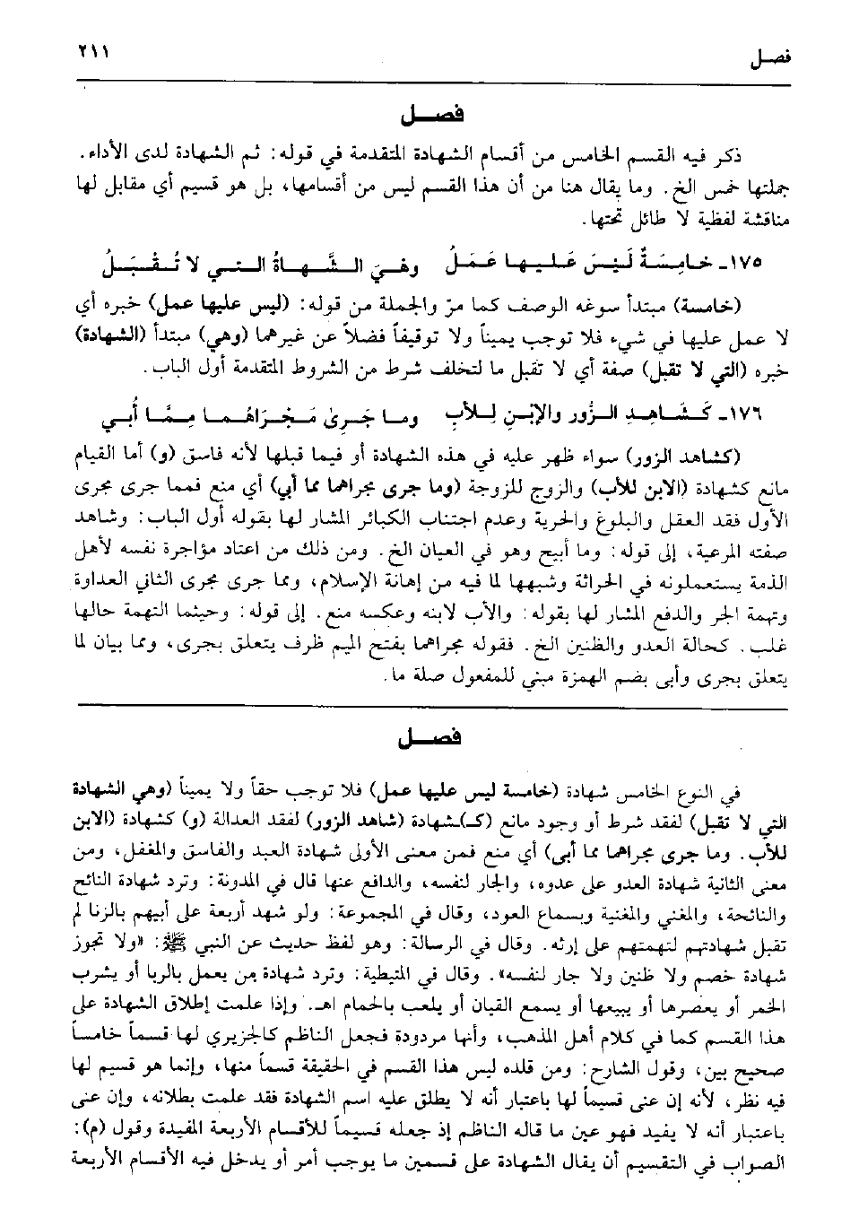 ذكر فِيهِ الْقسم الْخَامِس من أَقسَام الشَّهَادَة الْمُتَقَدّمَة فِي قَوْله: ثمَّ الشَّهَادَة لَدَى الْأَدَاء. جُمْلَتهَا خمس الخ. وَمَا يُقَال هُنَا من أَن هَذَا الْقسم لَيْسَ من أقسامها، بل هُوَ قسيم أَي مُقَابل لَهَا مناقشة لفظية لَا طائل تحتهَا. خامِسَةٌ لَيْسَ عَليها عَمَلُ وهْيَ الشَّهاةُ الَّتِي لَا تُقْبَلُ (خَامِسَة) مُبْتَدأ سوغه الْوَصْف كَمَا مرّ وَالْجُمْلَة من قَوْله: (لَيْسَ عَلَيْهَا عمل) خَبره أَي لَا عمل عَلَيْهَا فِي شَيْء فَلَا توجب يَمِينا وَلَا توقيفاً فضلا عَن غَيرهمَا (وَهِي) مُبْتَدأ (الشَّهَادَة) خَبره (الَّتِي لَا تقبل) صفة أَي لَا تقبل مَا لتخلف شَرط من الشُّرُوط الْمُتَقَدّمَة أول الْبَاب. كَشَاهِدِ الزُّور والإبْنِ لِلأبِ وَمَا جَرِى صلى الله عَلَيْهِ وَسلم